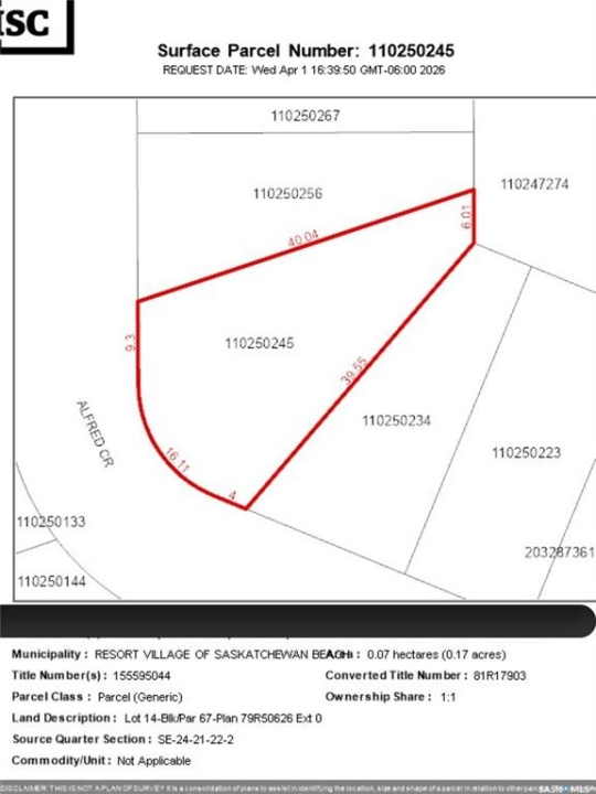 Discover the perfect place to build your dream home or summer getaway at 220 Alfred Crescent. Nestled on a quiet and peaceful crescent in the charming resort community of Saskatchewan Beach, this exceptional flat lot offers .17 acres of space to bring your vision to life. Enjoy the serenity of lake life just a short 40-minute drive from Regina. According to the seller, natural gas and power run conveniently along the crescent, making this an ideal site for development. Whether you're dreaming of a seasonal cottage retreat or a year-round residence, this lot offers the ideal backdrop for relaxed living, surrounded by nature and just minutes from the beach and community amenities. Build your future here—tranquility and potential await!