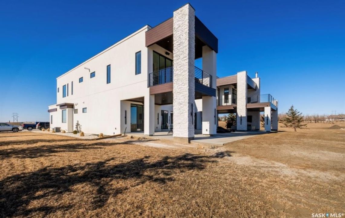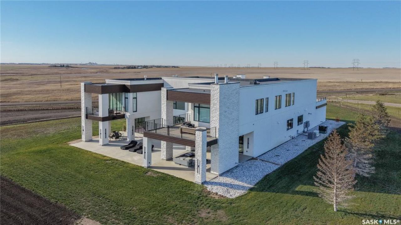 This unique property gives you luxury living w/o being surrounded by neighbours all while being just 2km from Regina City limits. This custom built 2 storey has over 11,000sqft of finished living space on 10 acres. Each room has been beautifully curated and you will find tiled floors and stunning features throughout.. Ricks Custom Cabinets provided luxury cabinetry and a kitchen with dual islands, quartz countertops, and Thermador appliances. You also have the addition of a butler's pantry and a dedicated coffee station. The dining room has sliding patio doors out to the covered patio with a gas fireplace. The living room opens up the second floor and has a gas fireplace with a floor to ceiling stone surround. This home has two primary bedrooms with one on the main floor and one on the second floor. The main floor primary has direct access to a covered patio while the upper primary has direct access to a covered balcony. Both walk-in closets and ensuites will leave you speechless from dual islands to TVs built into the mirror, and large tiled showers. There are 3 additional beds which all have their own ensuites and a total of 8 baths throughout the home. On the 2nd floor is a gym with rubber flooring, a wall of mirrors, and balcony for you to soak in the summer sun. There is also an additional balcony with a SE facing balcony. The basement is the place where your friends and family will be clambering to hang out. There is a wet bar and wine room but also a theatre room that seats 14 with it's own snack bar. Laundry is on the main floor and it has handy pull out drying racks. There is a heated 3 car garage as well as a heated single garage. Plus good water from the well and a septic field. Some additional features of this home include: 8ft doors throughout, built on piles, window treatments (bedrooms), 2 beverage stations, Control4 audio system, security cameras, solid oak staircase, a back up generator, fruit tress and have been planted.