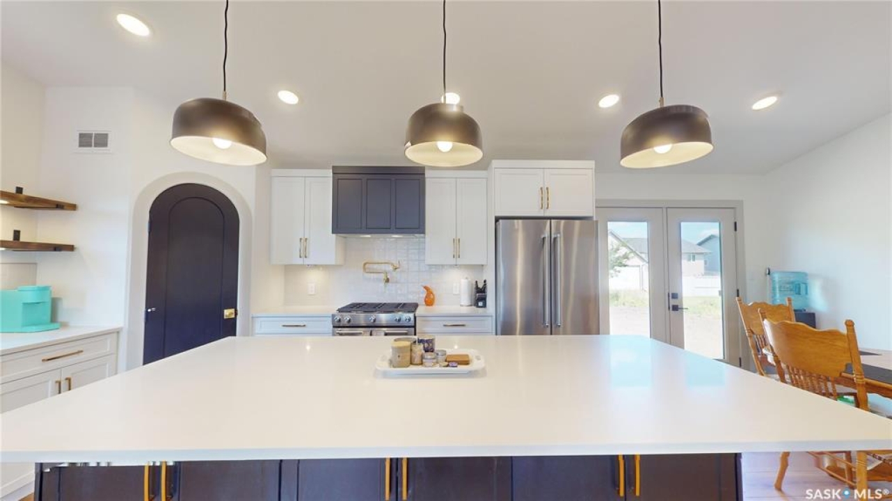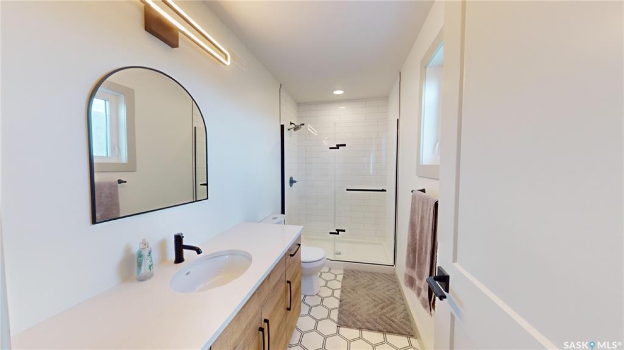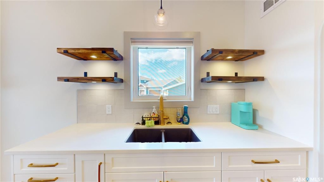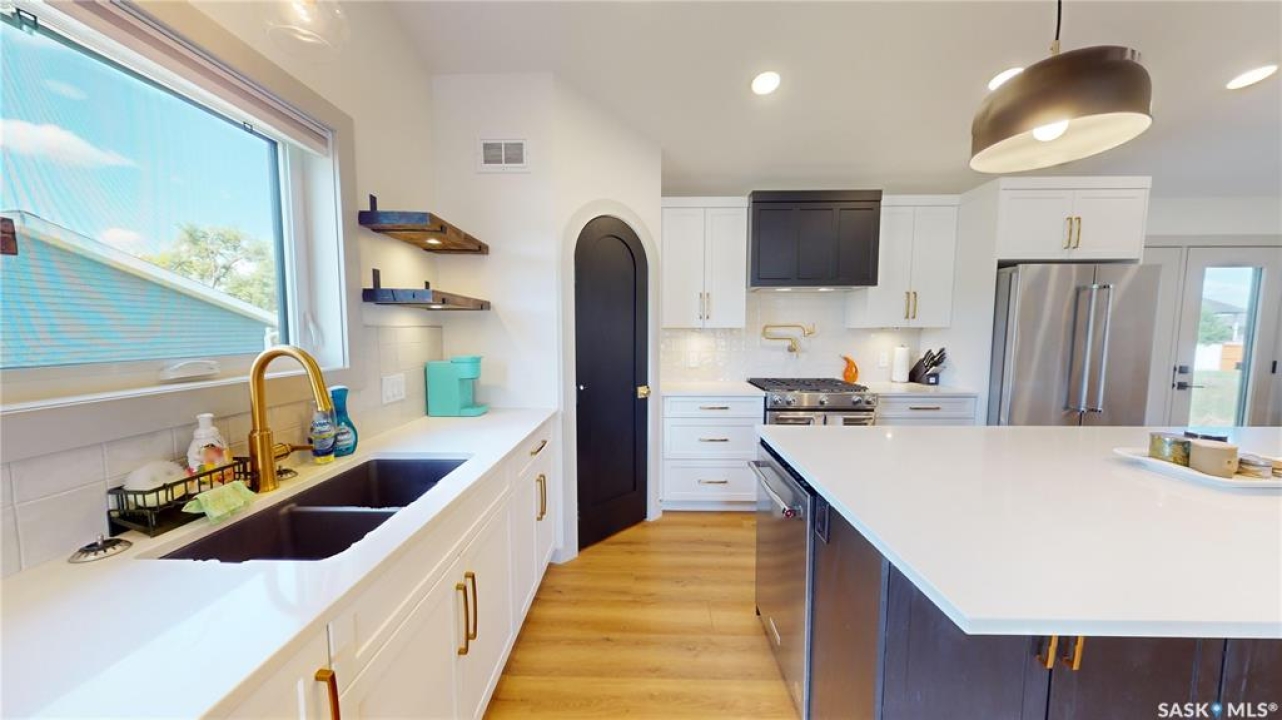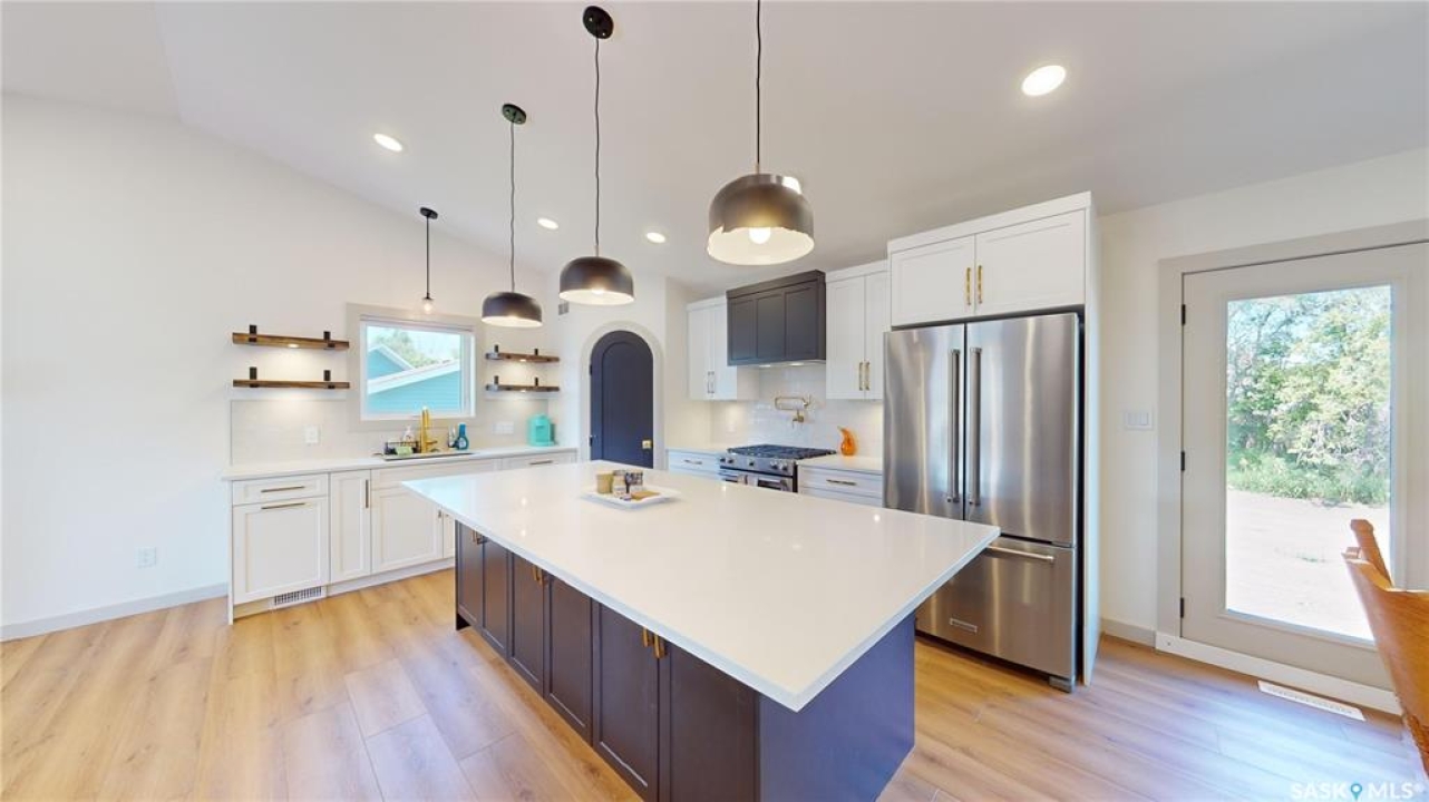 Welcome to a more relaxed and enjoyable lifestyle in the wonderful and safe Town of Waldheim where this stunning raised bungalow on a 60'x140' lot with an attached garage awaits you. 2 bedrooms on the main floor allow for a wonderfully spacious open concept in this 1,241 square foot home with a gorgeous two-tone kitchen. High-end finishes such as quartz countertops with an eating ledge, an attractive tile backsplash, a gas range, and a stylish pot-filler will make meal prep and entertaining a pleasure. Vaulted ceilings float above the kitchen and living room where a warm gas fireplace will keep you warm. The primary bedroom has a beautiful 3pc ensuite with a large tiled shower and an oversized walk-in closet and laundry service. There's a head start on the basement development where a 3rd bedroom is almost complete and the outside walls are boarded. Large windows, and rough-ins for a 3rd bathroom and a 2nd laundry service provide loads of potential in the lower level. A huge double garage has direct entry to the home and high ceilings for additional storage options. Other extras include a corner kitchen pantry with custom round-top door, central air conditioning, front and back top-soil, a Heat Recovery Ventilation system for premium air quality, double garden doors to the future deck, and more. Call now for your own private viewing!