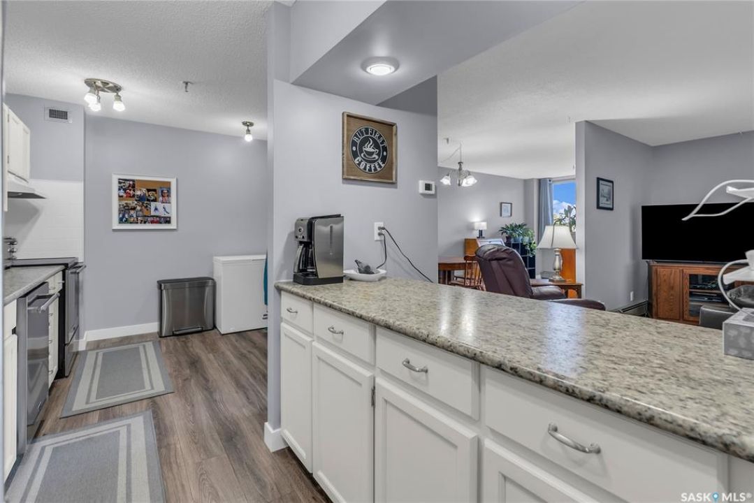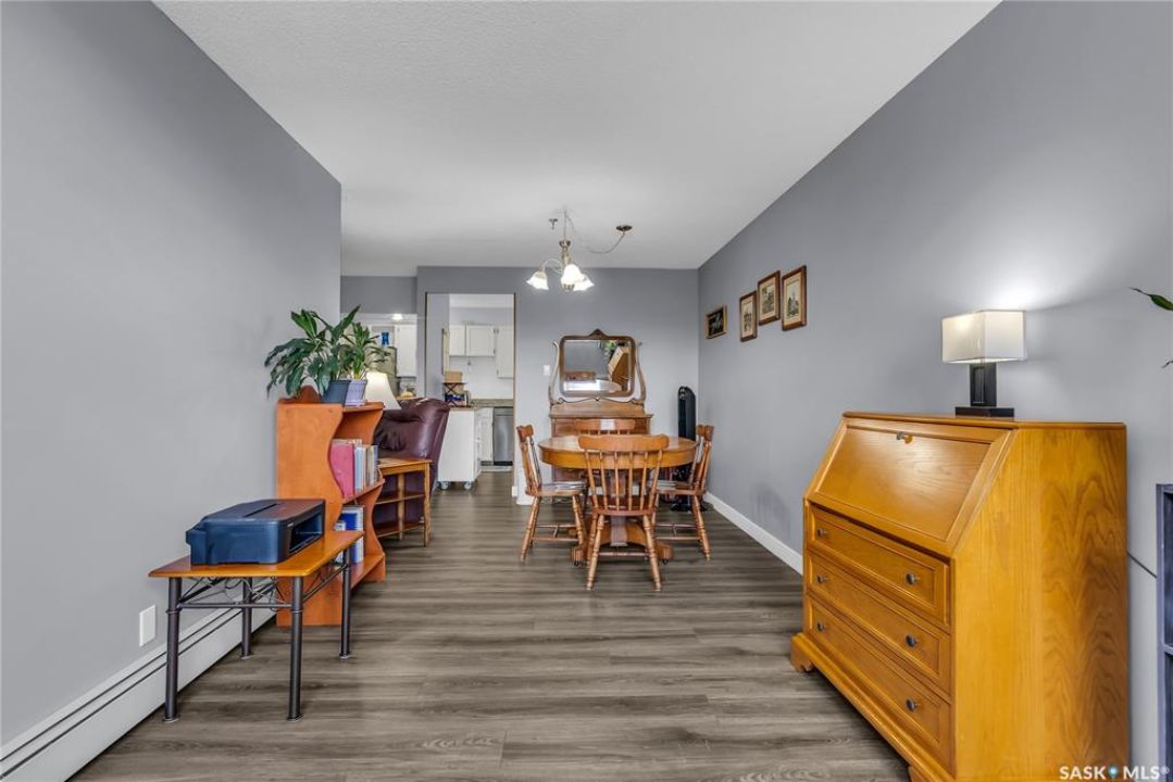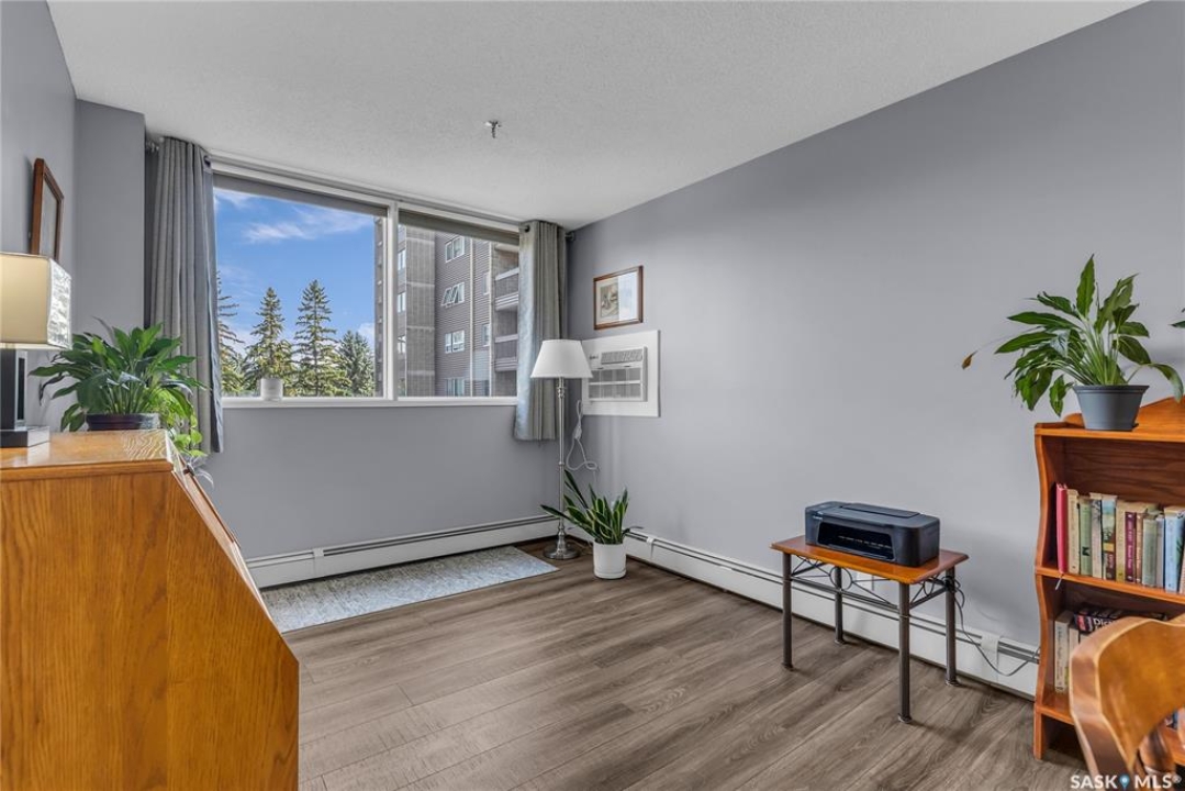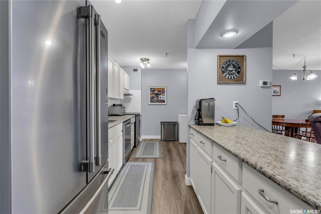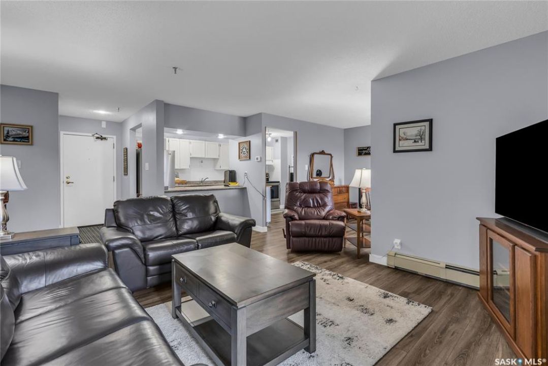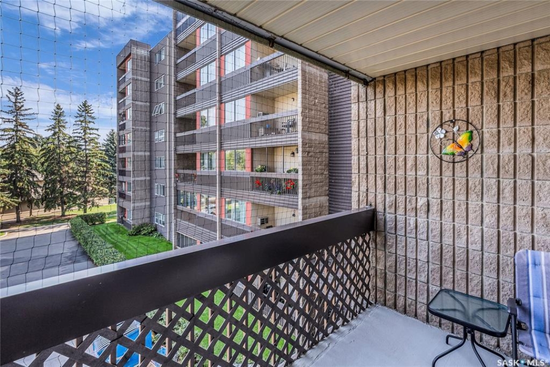 Excellent location, only one block from the Meewasin Walking Trail and Riverbank. East-facing 1132 sq FT, Two bedrooms, 2 Bathrooms, Main Floor Laundry. This unit features a lot of recent upgrades. Light Galley Kitchen Cabinets, with Maytag stainless steel appliances, Hall Pantry, Neutral Painted throughout, durable Laminate Flooring, Newer Patio doors to Balcony with a clear View of your Parking Stall 40. Air conditioner replaced, Newer washer/dryer. Newer vanities in Bathrooms, comfort toilets. Large master bedroom with Double closets. The Complex offers a Hot Tub, Saltwater Pool, Double elevators & More!
