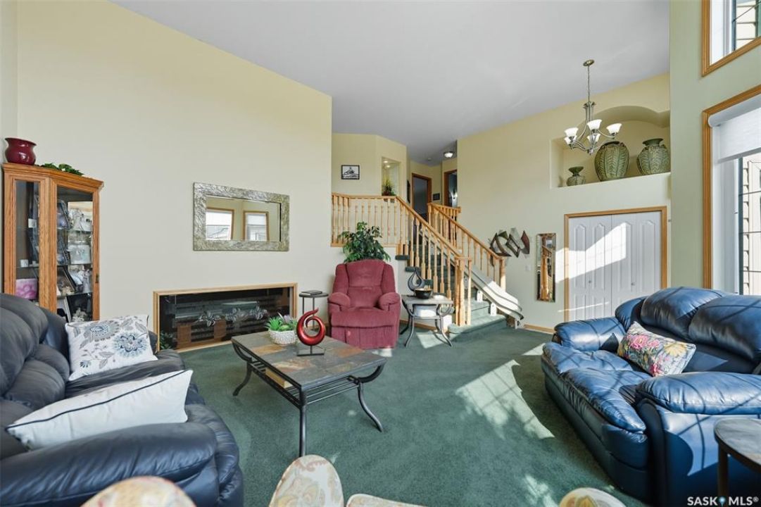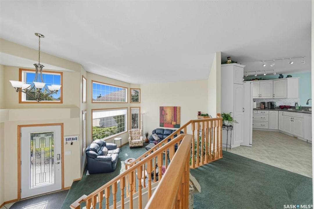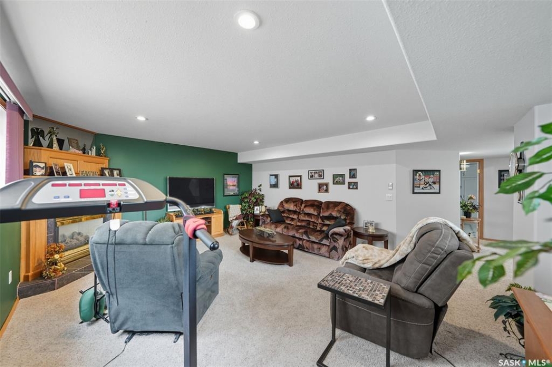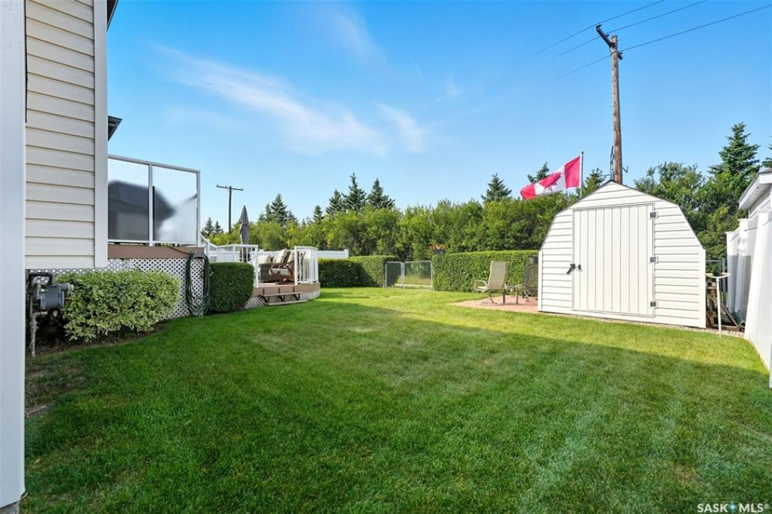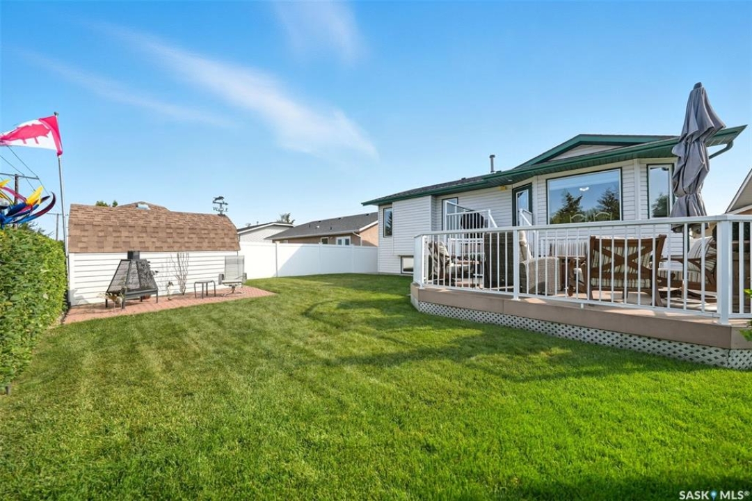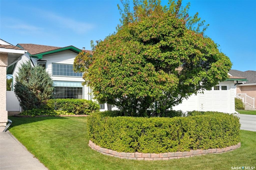 Welcome to this immaculate bi-level home, perfectly situated in a highly desirable neighborhood near the Uniplex, and a variety of amenities. Backing a peaceful tree line with open prairie views, this property offers a rare combination of privacy and convenience. Step into a bright and inviting main level, where soaring ceilings and floor-to-ceiling windows in the front foyer and living room create an impressive sense of space. Decorative niches and ledges add character and style as you move into the heart of the home. The well-designed kitchen features an abundance of white cabinetry, seamlessly connected to the dining area with access to a maintenance-free, two-tiered deck—perfect for entertaining or simply enjoying the outdoors. The main floor is complete with a luxurious primary bedroom with a 3-piece ensuite, an additional bedroom, and a 4-piece bathroom. The lower level continues to impress with a stunning decorative glass feature overlooking the main living room, a spacious family room with a cozy natural gas fireplace, two additional bedrooms (including one with a walk-in closet), and a 3-piece bath/laundry room with plenty of built-in cabinetry. Car enthusiasts and hobbyists will love the garage, outfitted with cabinets and Handiwall slatwall systems for exceptional organization. Outside, the beautifully landscaped yard showcases mature trees, shrubs, hedges, flower beds, fire pit area, storage shed, and a fully fenced design that backs onto green space. This property truly shines inside and out—showing 10/10 with pride of ownership throughout!