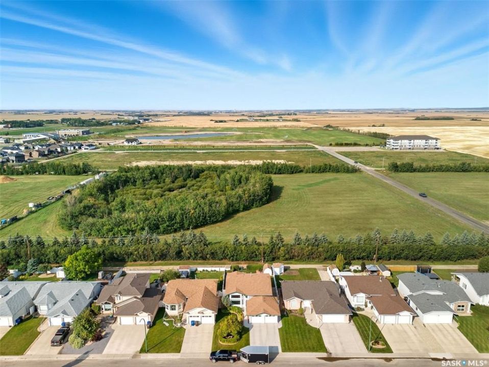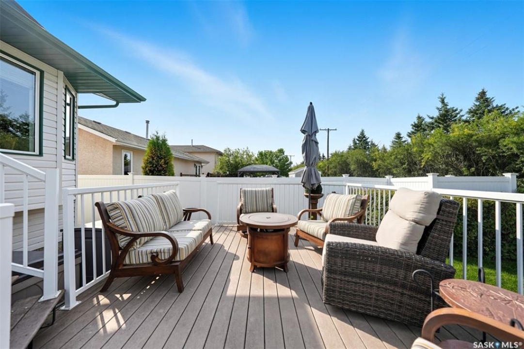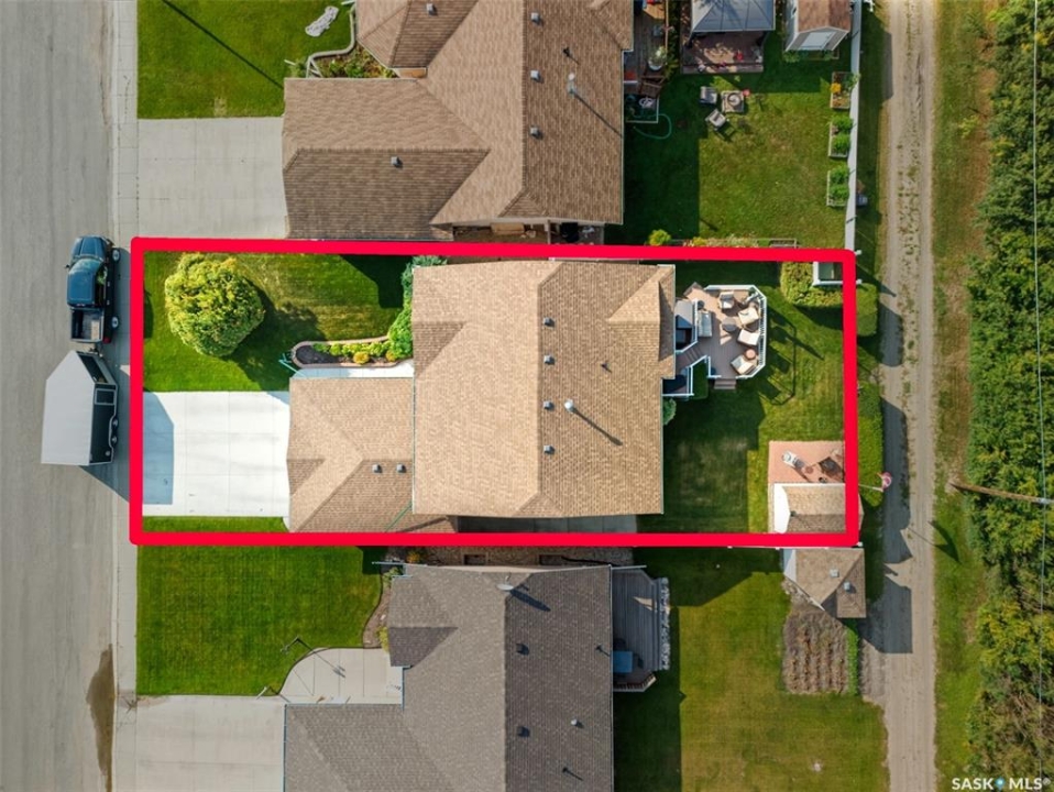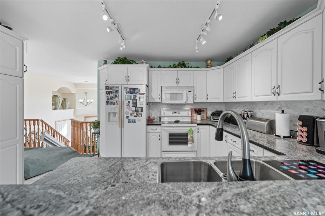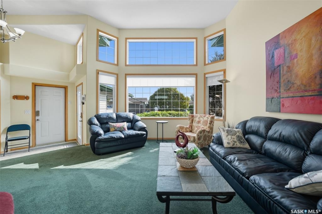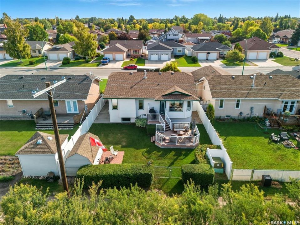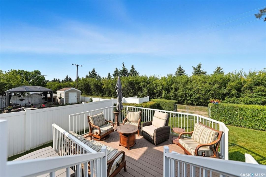 Welcome to this immaculate bi-level home, perfectly situated in a highly desirable neighborhood near the Uniplex, and a variety of amenities. Backing a peaceful tree line with open prairie views, this property offers a rare combination of privacy and convenience. Step into a bright and inviting main level, where soaring ceilings and floor-to-ceiling windows in the front foyer and living room create an impressive sense of space. Decorative niches and ledges add character and style as you move into the heart of the home. The well-designed kitchen features an abundance of white cabinetry, seamlessly connected to the dining area with access to a maintenance-free, two-tiered deck—perfect for entertaining or simply enjoying the outdoors. The main floor is complete with a luxurious primary bedroom with a 3-piece ensuite, an additional bedroom, and a 4-piece bathroom. The lower level continues to impress with a stunning decorative glass feature overlooking the main living room, a spacious family room with a cozy natural gas fireplace, two additional bedrooms (including one with a walk-in closet), and a 3-piece bath/laundry room with plenty of built-in cabinetry. Car enthusiasts and hobbyists will love the garage, outfitted with cabinets and Handiwall slatwall systems for exceptional organization. Outside, the beautifully landscaped yard showcases mature trees, shrubs, hedges, flower beds, fire pit area, storage shed, and a fully fenced design that backs onto green space. This property truly shines inside and out—showing 10/10 with pride of ownership throughout!