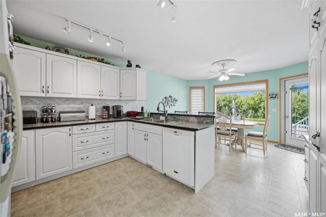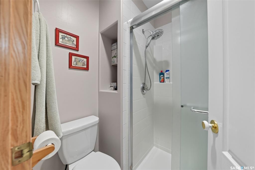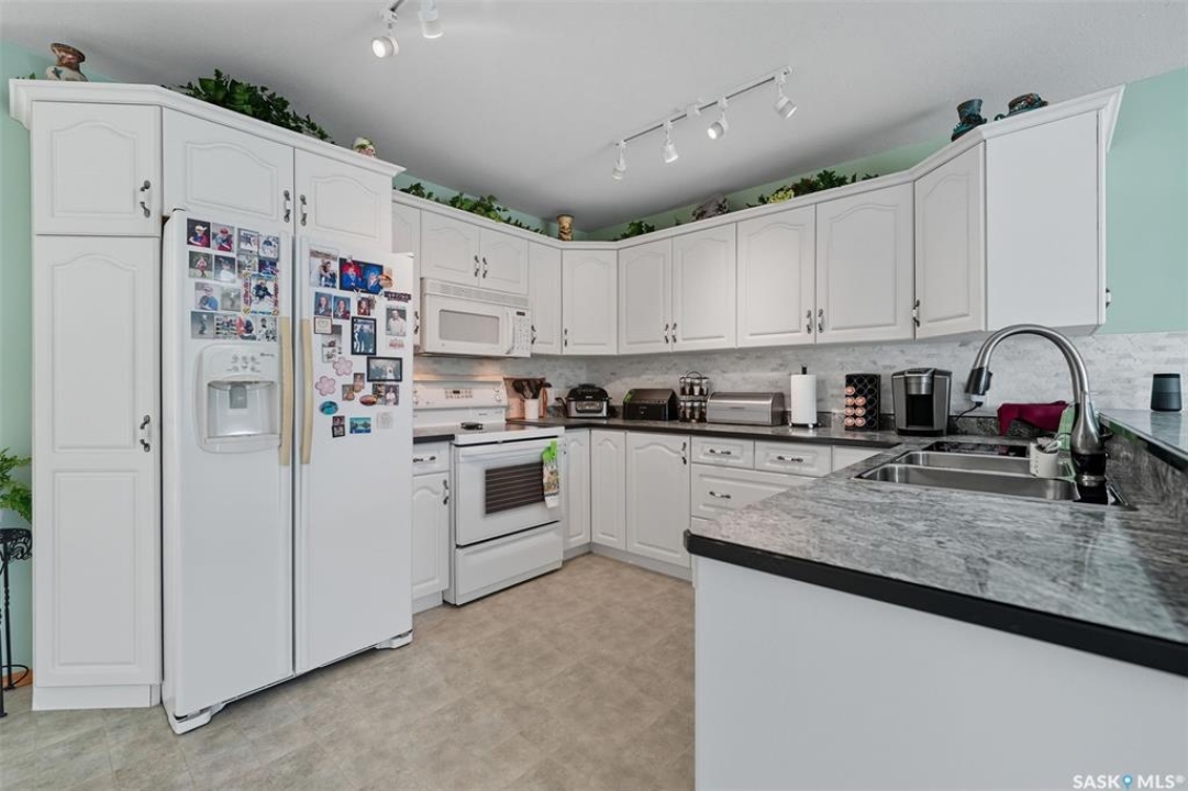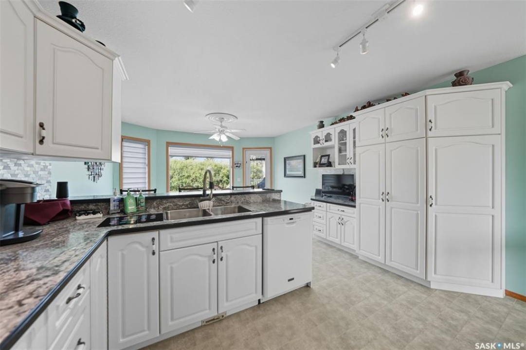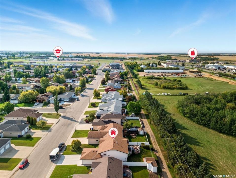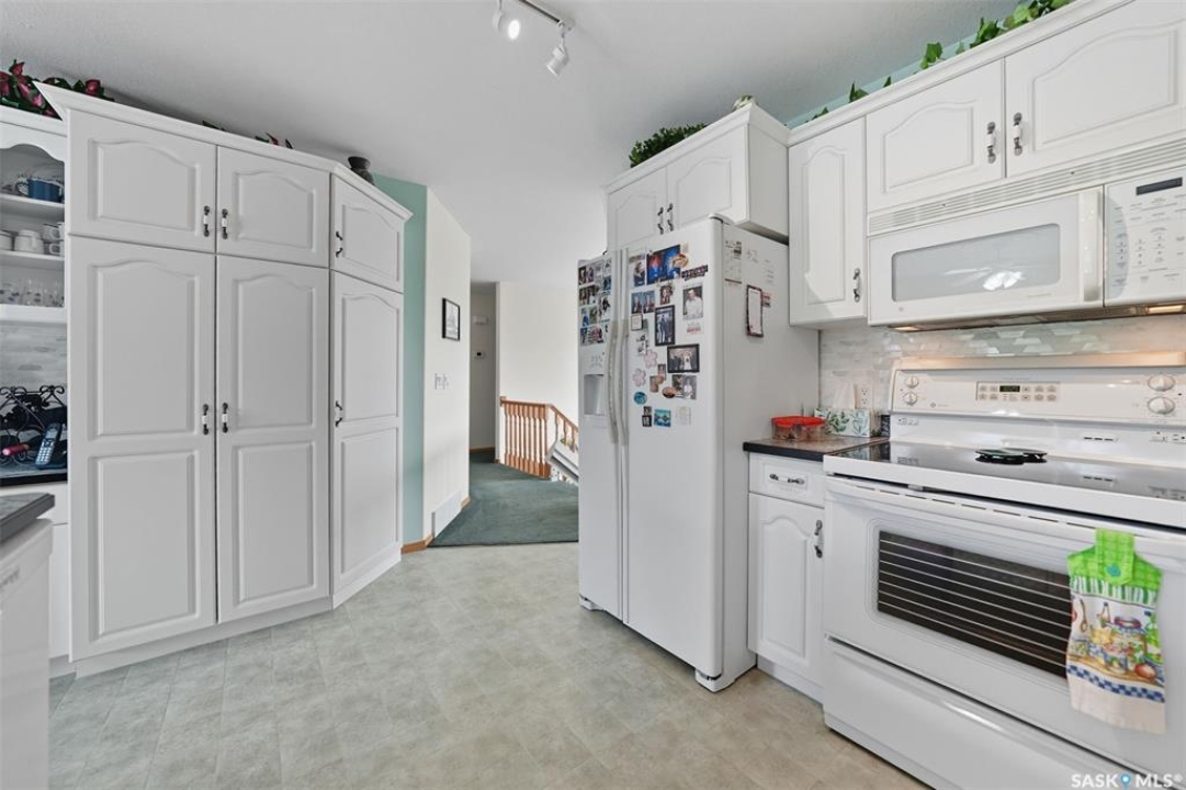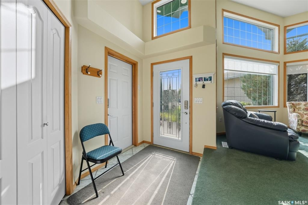 Welcome to this immaculate bi-level home, perfectly situated in a highly desirable neighborhood near the Uniplex, and a variety of amenities. Backing a peaceful tree line with open prairie views, this property offers a rare combination of privacy and convenience. Step into a bright and inviting main level, where soaring ceilings and floor-to-ceiling windows in the front foyer and living room create an impressive sense of space. Decorative niches and ledges add character and style as you move into the heart of the home. The well-designed kitchen features an abundance of white cabinetry, seamlessly connected to the dining area with access to a maintenance-free, two-tiered deck—perfect for entertaining or simply enjoying the outdoors. The main floor is complete with a luxurious primary bedroom with a 3-piece ensuite, an additional bedroom, and a 4-piece bathroom. The lower level continues to impress with a stunning decorative glass feature overlooking the main living room, a spacious family room with a cozy natural gas fireplace, two additional bedrooms (including one with a walk-in closet), and a 3-piece bath/laundry room with plenty of built-in cabinetry. Car enthusiasts and hobbyists will love the garage, outfitted with cabinets and Handiwall slatwall systems for exceptional organization. Outside, the beautifully landscaped yard showcases mature trees, shrubs, hedges, flower beds, fire pit area, storage shed, and a fully fenced design that backs onto green space. This property truly shines inside and out—showing 10/10 with pride of ownership throughout!