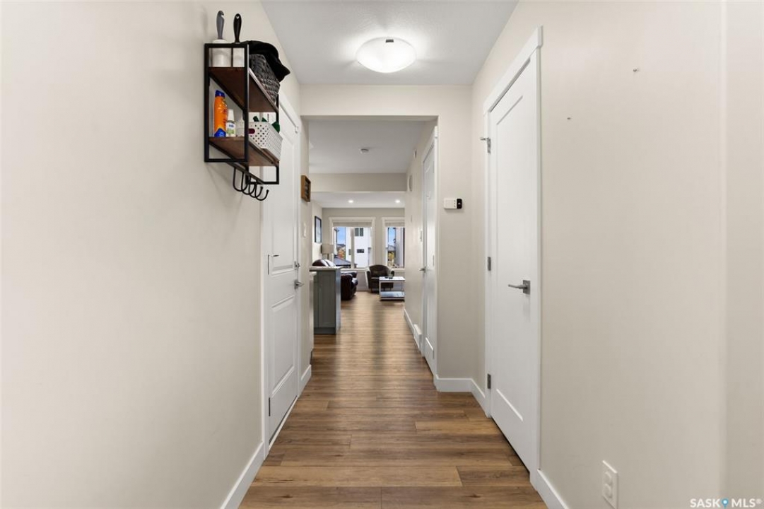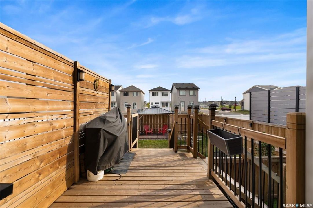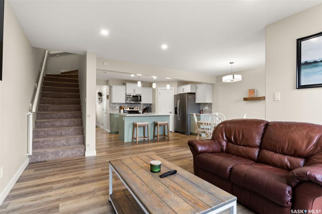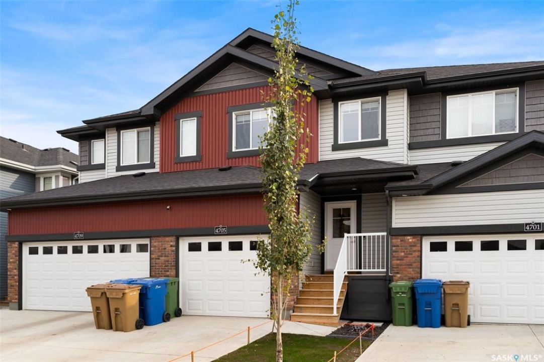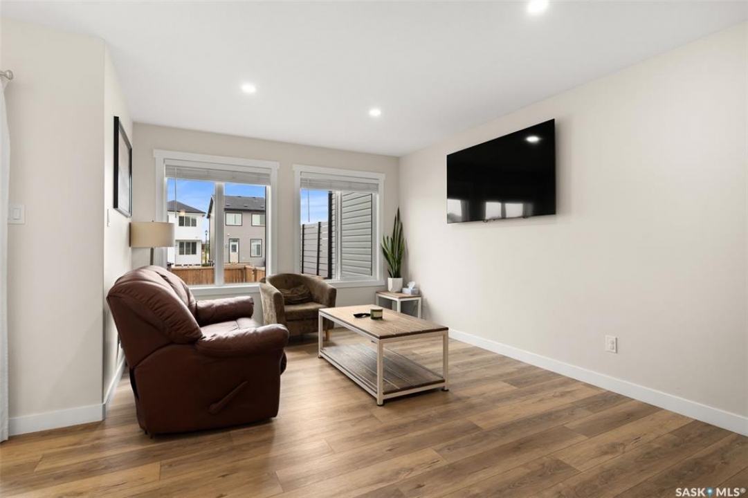 Welcome to 4705 Mutrie Crescent E, a beautifully finished multi-level townhouse in the growing community of The Towns, Regina. Built in 2021, this home offers 1,428 sq. ft. of stylish living space designed for comfort and functionality. Step inside to a bright, open-concept main floor featuring vinyl plank flooring, recessed lighting, and large windows that flood the space with natural light. The inviting living room flows seamlessly into the dining area and a modern kitchen complete with quartz countertops, tile backsplash, stainless steel appliances, two-tone cabinetry, and a large island with seating — perfect for casual meals or entertaining. A convenient 2-piece bath completes this level. Upstairs, you'll find a spacious bonus room, a well-equipped laundry area, and three comfortable bedrooms. The primary suite includes a walk-in closet and private 4-piece ensuite, while two additional bedrooms share another full bath. Plush carpeting adds warmth and comfort throughout the second level. The lower level is open for future development, offering plenty of potential to create a rec room, home gym, or guest space. Outside, enjoy a fully fenced and landscaped backyard with the deck featuring a privacy wall for added comfort, with a private gazebo — perfect for summer evenings. The single attached garage and driveway provide secure parking and extra storage. With its modern design, low-maintenance lifestyle, and prime location near schools, parks, and east-end amenities, this home is ideal for families, professionals, or downsizers. Don't miss out, 4705 Mutrie Crescent E is waiting for you!