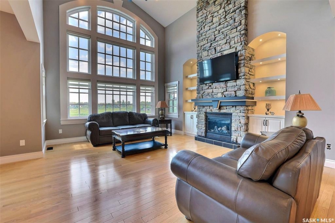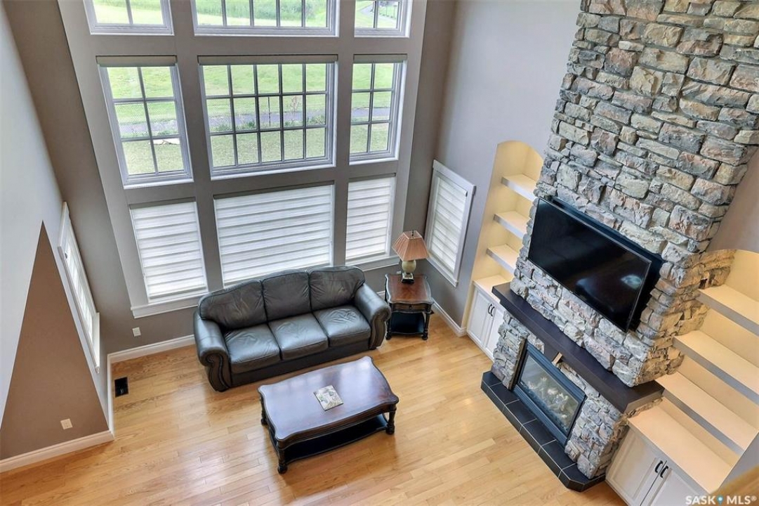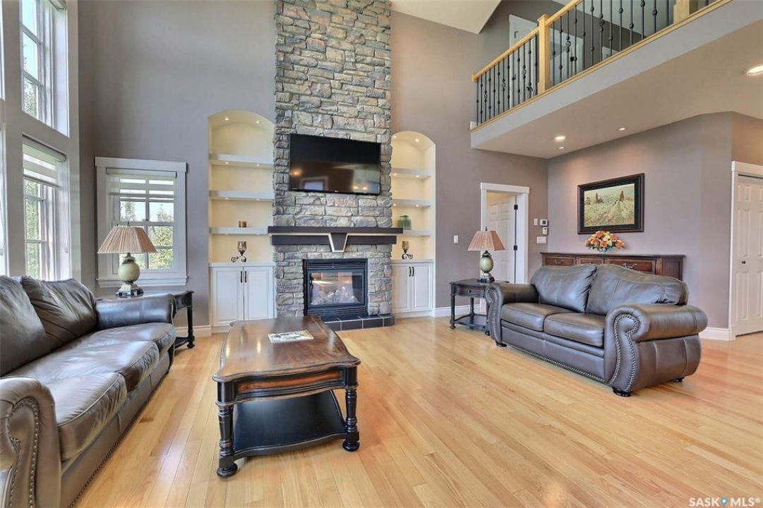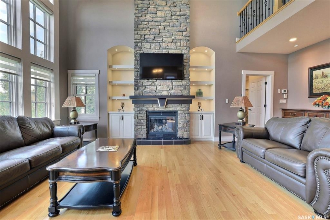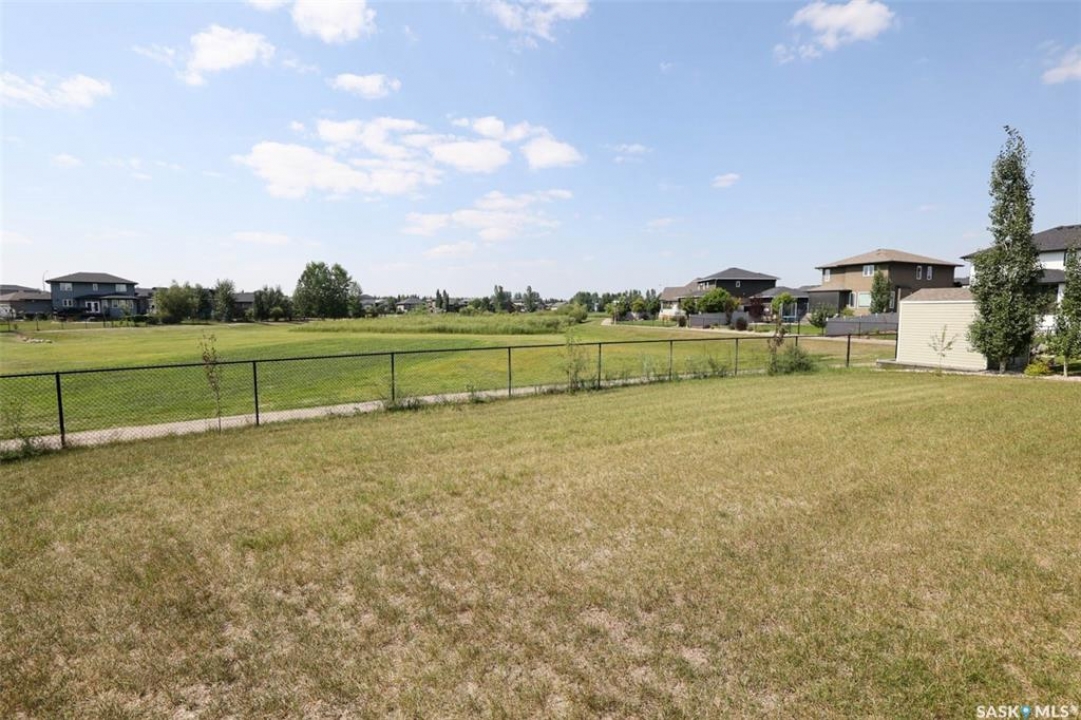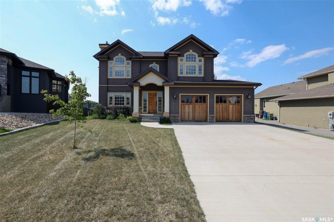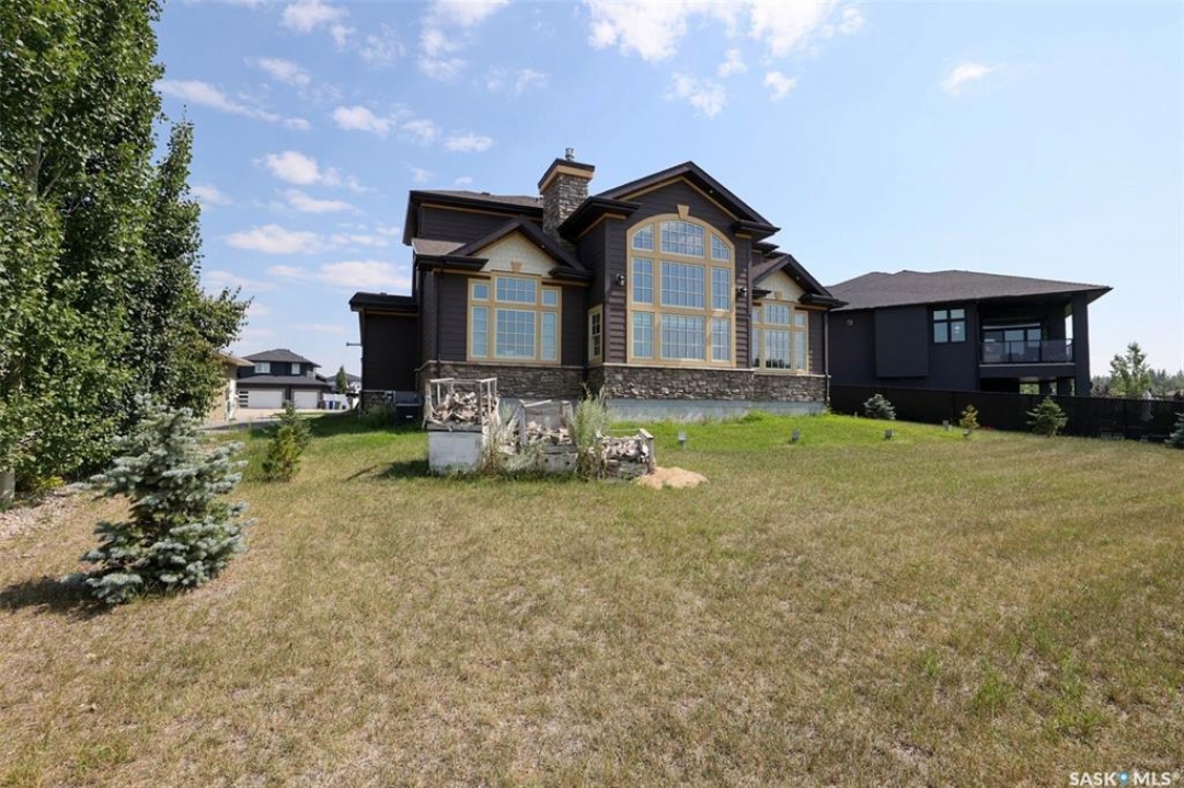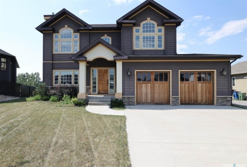 Stunning 2 storey on huge quarter acre lot backing neighbourhood greenspace in desirable White City. Custom built by original owner this 2700+ sq ft home offers superior construction and top quality materials and design throughout with impressive street appeal. Large foyer with beautiful stone flooring and very handy adjacent office/den with fireplace leads to main living area featuring large kitchen with an abundance of cabinets and stone counters, large eating bar and spacious dining area. Spectacular 2 storey ceiling height living room with impressive full wall height fireplace feature with original stone detail. 3 levels of windows overlook the huge greenspace backing rear yard and wide open prairie sky sunset views. Very convenient main floor bedroom and full 4pc bath, large mudroom, main floor laundry and direct entry to large double attached insulated and heated garage. 2nd level is accessed by statement hardwood staircase leading to balcony area overlooking the main floor living area and providing an elevated view of the prairie beyond. Massive primary suite with large walk-in closet, huge ensuite featuring separate soaker jet tub and large tiled shower and double vanity. 2 additional generous sized bedrooms and full bath. Basement has exterior insulated walls and some interior framing (building materials in bsmt included) Top quality Hunter Douglas window coverings (some with remotes), soft close drawers. White City is very desirable established community 10mins from the city but offering all necessary services, schools, shopping, restaurant, parks and prairie greenspaces. Gorgeous one of kind home, call for a private viewing!