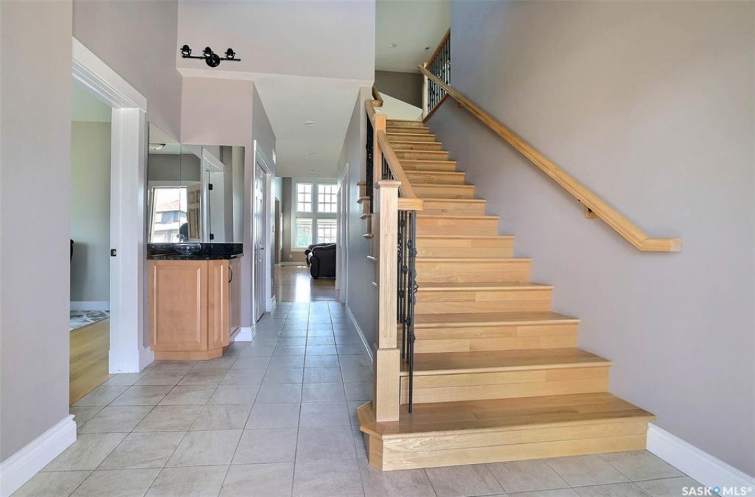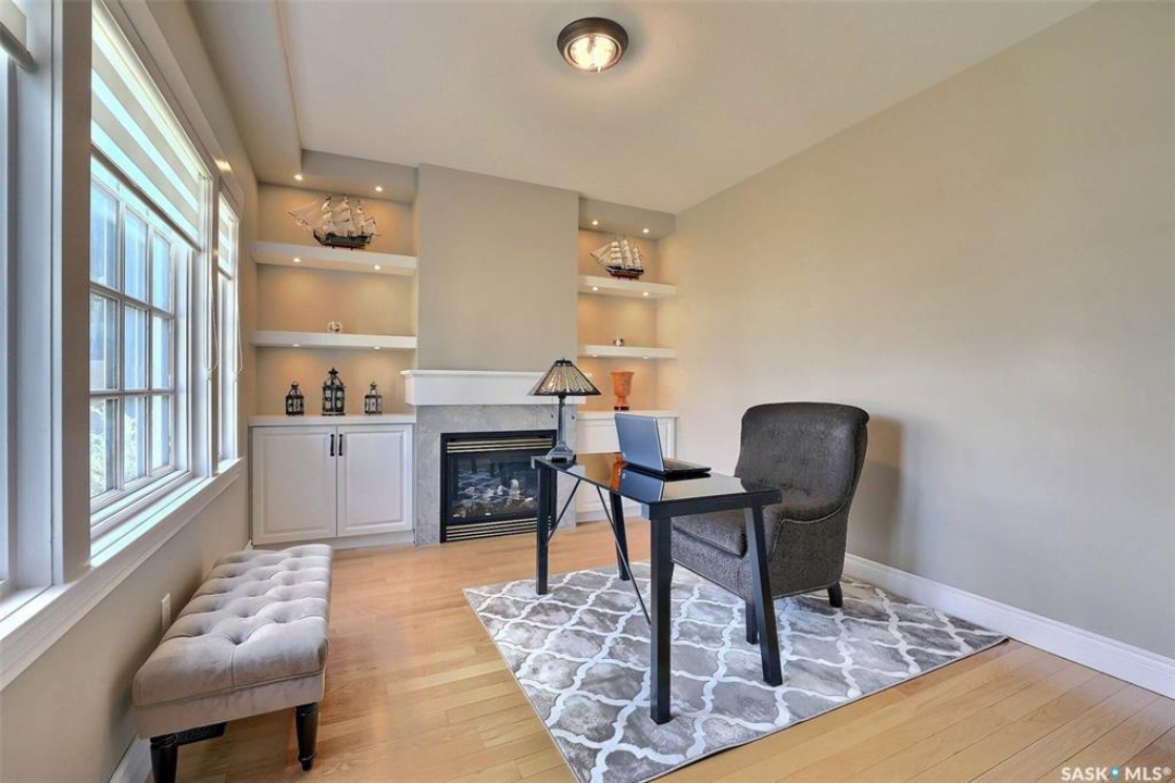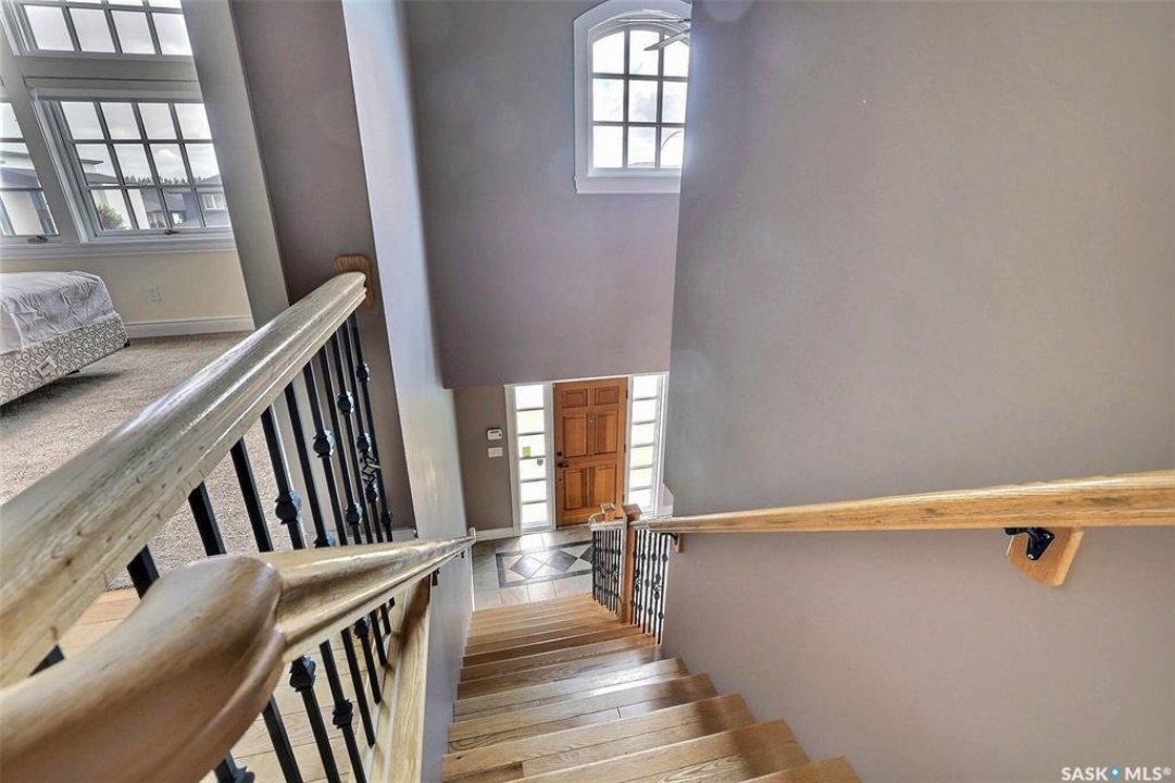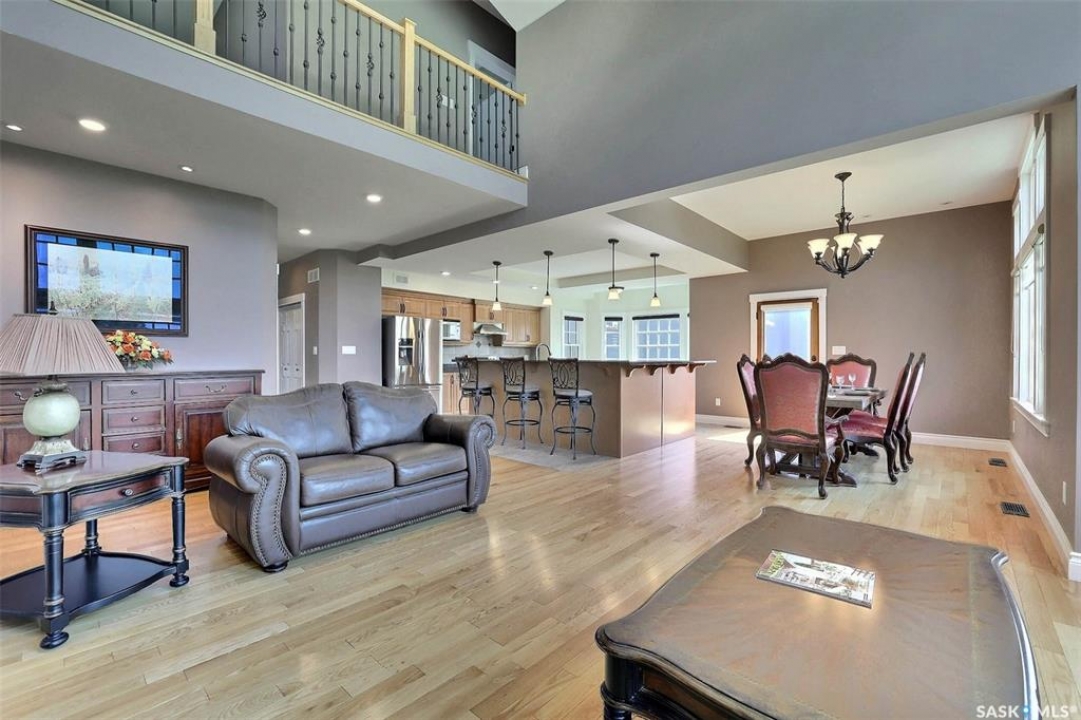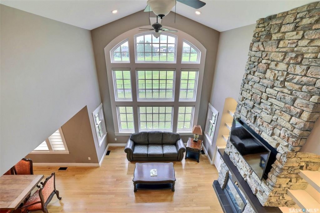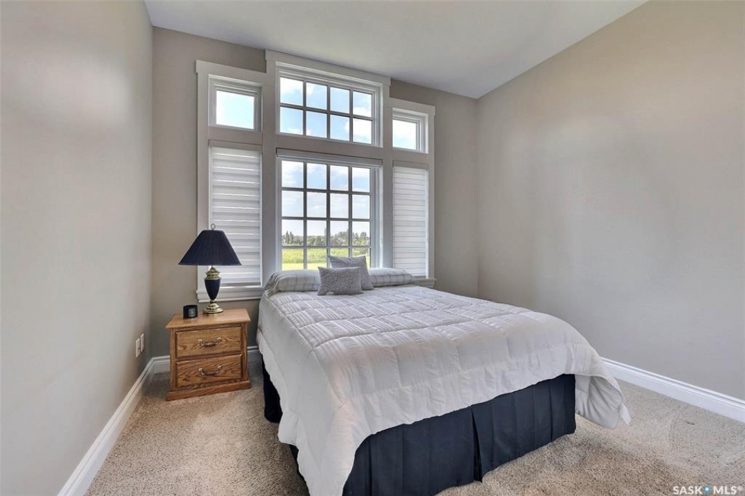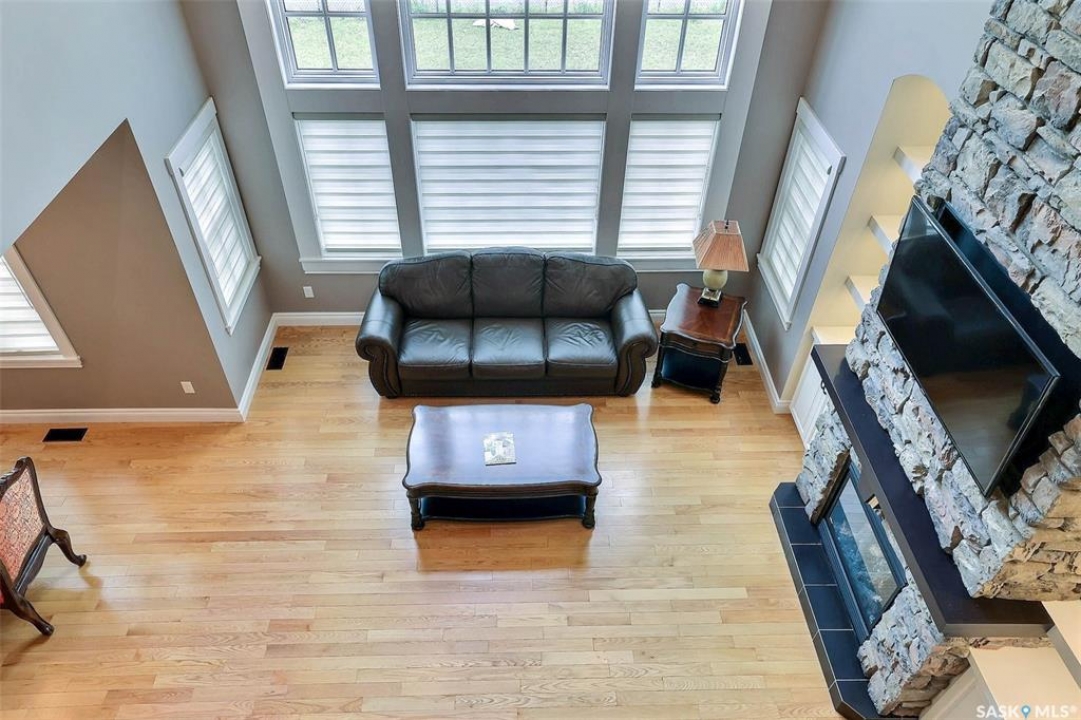 Stunning 2 storey on huge quarter acre lot backing neighbourhood greenspace in desirable White City. Custom built by original owner this 2700+ sq ft home offers superior construction and top quality materials and design throughout with impressive street appeal. Large foyer with beautiful stone flooring and very handy adjacent office/den with fireplace leads to main living area featuring large kitchen with an abundance of cabinets and stone counters, large eating bar and spacious dining area. Spectacular 2 storey ceiling height living room with impressive full wall height fireplace feature with original stone detail. 3 levels of windows overlook the huge greenspace backing rear yard and wide open prairie sky sunset views. Very convenient main floor bedroom and full 4pc bath, large mudroom, main floor laundry and direct entry to large double attached insulated and heated garage. 2nd level is accessed by statement hardwood staircase leading to balcony area overlooking the main floor living area and providing an elevated view of the prairie beyond. Massive primary suite with large walk-in closet, huge ensuite featuring separate soaker jet tub and large tiled shower and double vanity. 2 additional generous sized bedrooms and full bath. Basement has exterior insulated walls and some interior framing (building materials in bsmt included) Top quality Hunter Douglas window coverings (some with remotes), soft close drawers. White City is very desirable established community 10mins from the city but offering all necessary services, schools, shopping, restaurant, parks and prairie greenspaces. Gorgeous one of kind home, call for a private viewing!