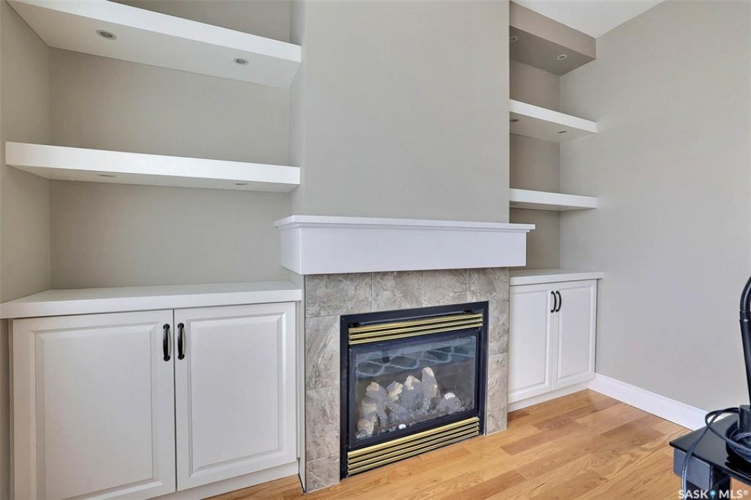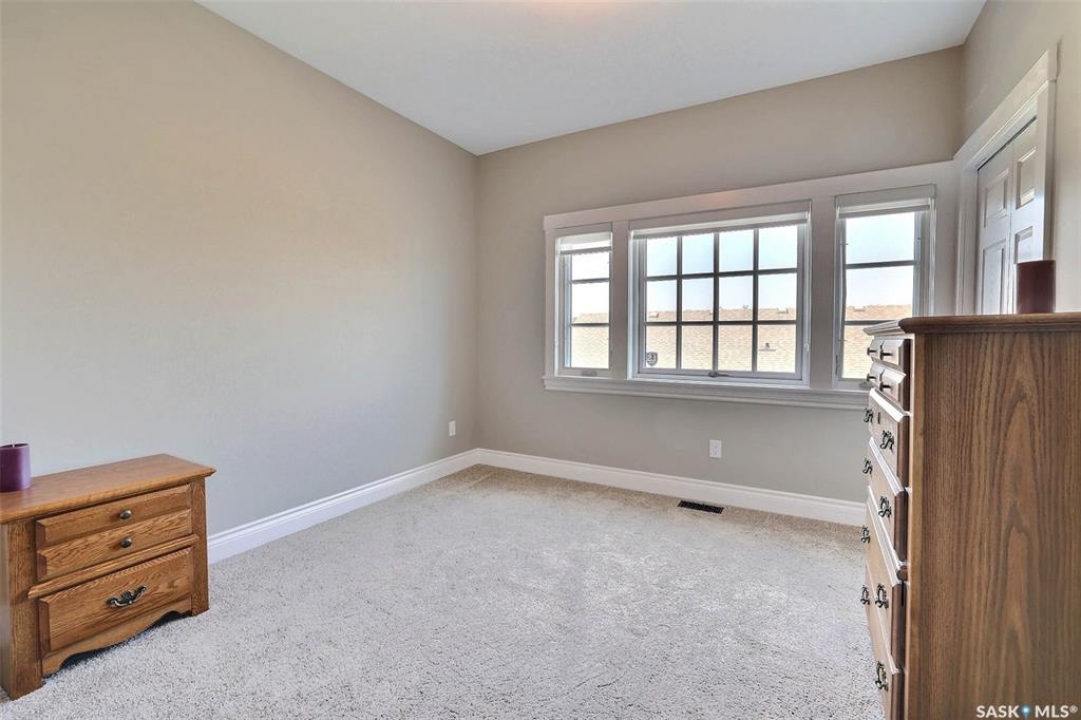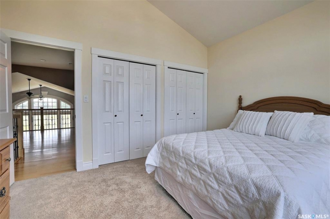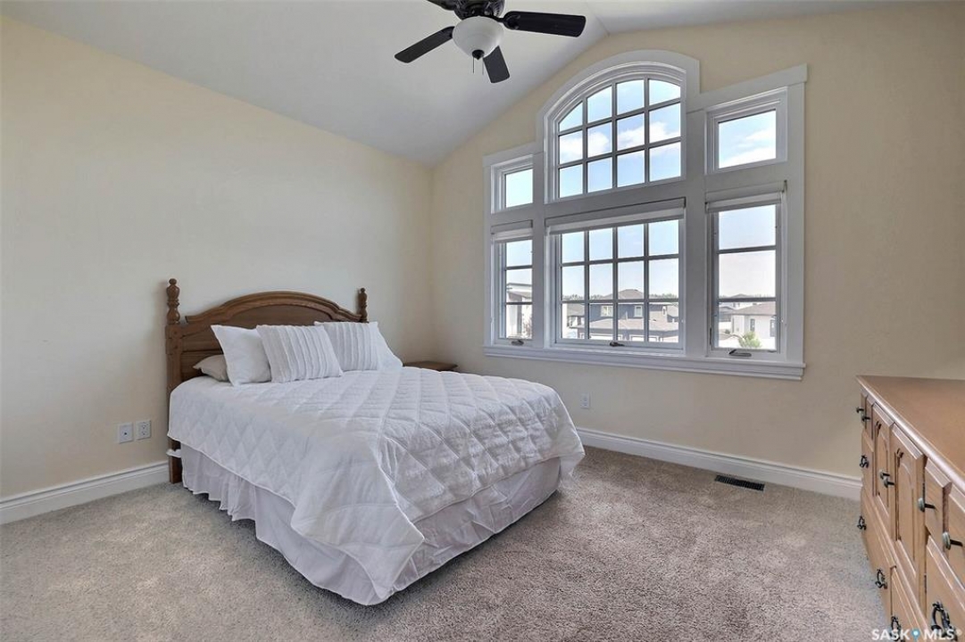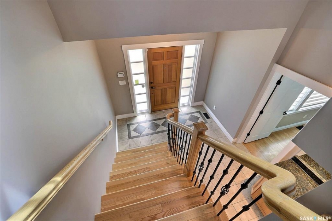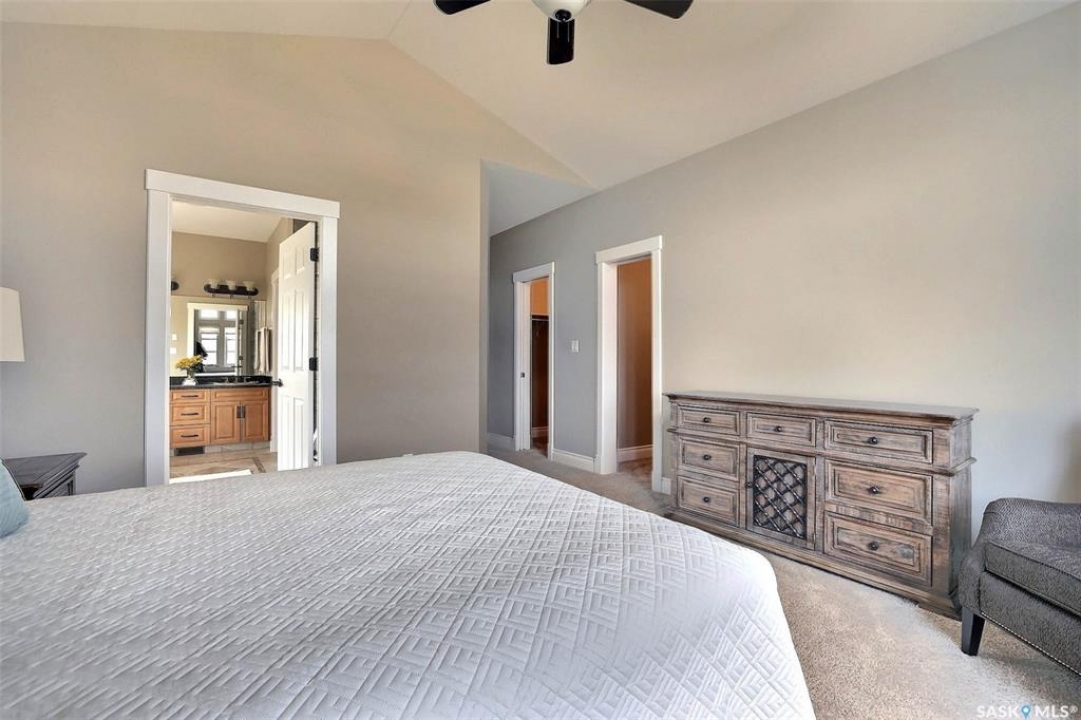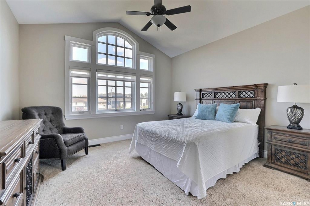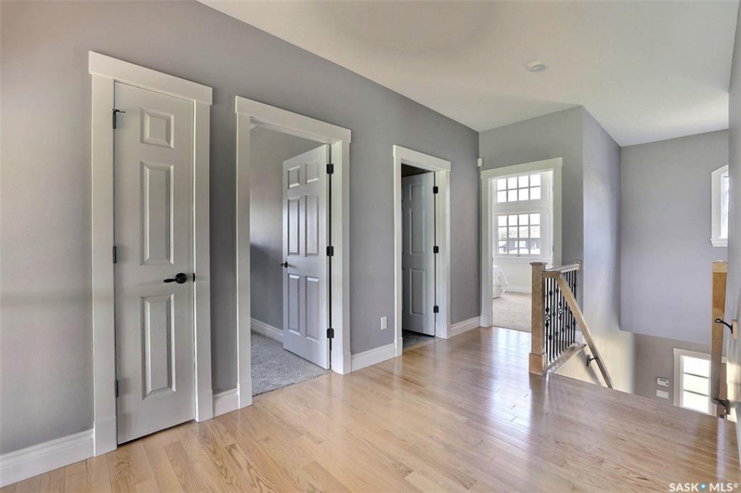 Stunning 2 storey on huge quarter acre lot backing neighbourhood greenspace in desirable White City. Custom built by original owner this 2700+ sq ft home offers superior construction and top quality materials and design throughout with impressive street appeal. Large foyer with beautiful stone flooring and very handy adjacent office/den with fireplace leads to main living area featuring large kitchen with an abundance of cabinets and stone counters, large eating bar and spacious dining area. Spectacular 2 storey ceiling height living room with impressive full wall height fireplace feature with original stone detail. 3 levels of windows overlook the huge greenspace backing rear yard and wide open prairie sky sunset views. Very convenient main floor bedroom and full 4pc bath, large mudroom, main floor laundry and direct entry to large double attached insulated and heated garage. 2nd level is accessed by statement hardwood staircase leading to balcony area overlooking the main floor living area and providing an elevated view of the prairie beyond. Massive primary suite with large walk-in closet, huge ensuite featuring separate soaker jet tub and large tiled shower and double vanity. 2 additional generous sized bedrooms and full bath. Basement has exterior insulated walls and some interior framing (building materials in bsmt included) Top quality Hunter Douglas window coverings (some with remotes), soft close drawers. White City is very desirable established community 10mins from the city but offering all necessary services, schools, shopping, restaurant, parks and prairie greenspaces. Gorgeous one of kind home, call for a private viewing!