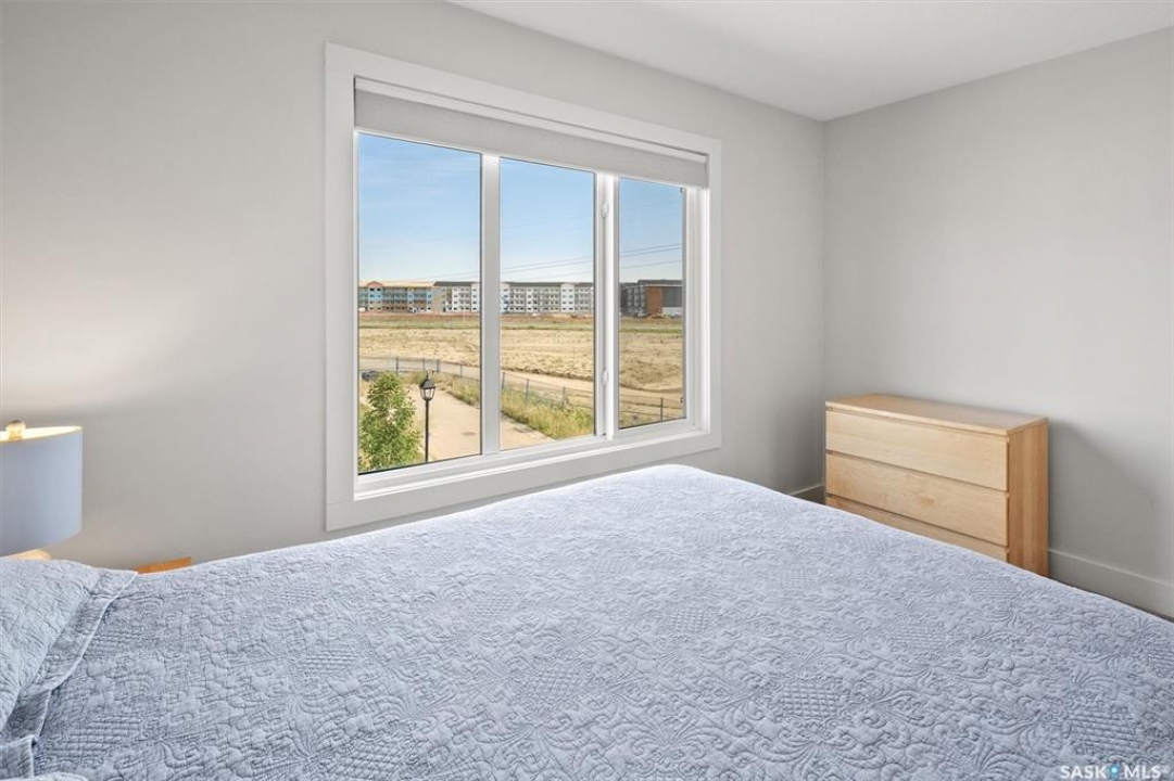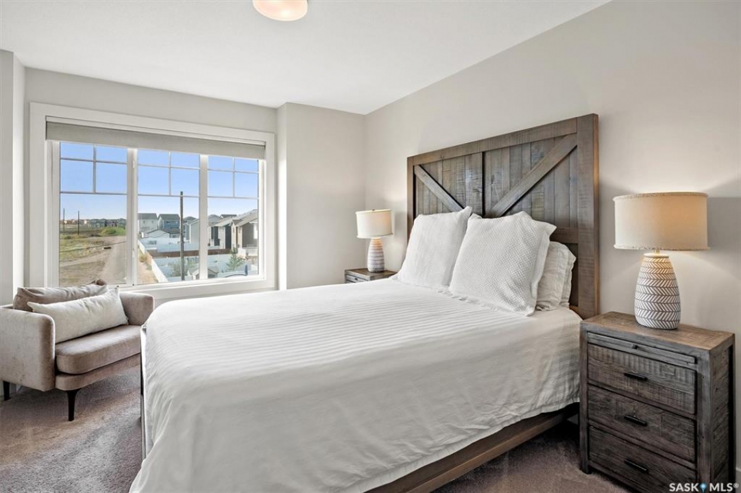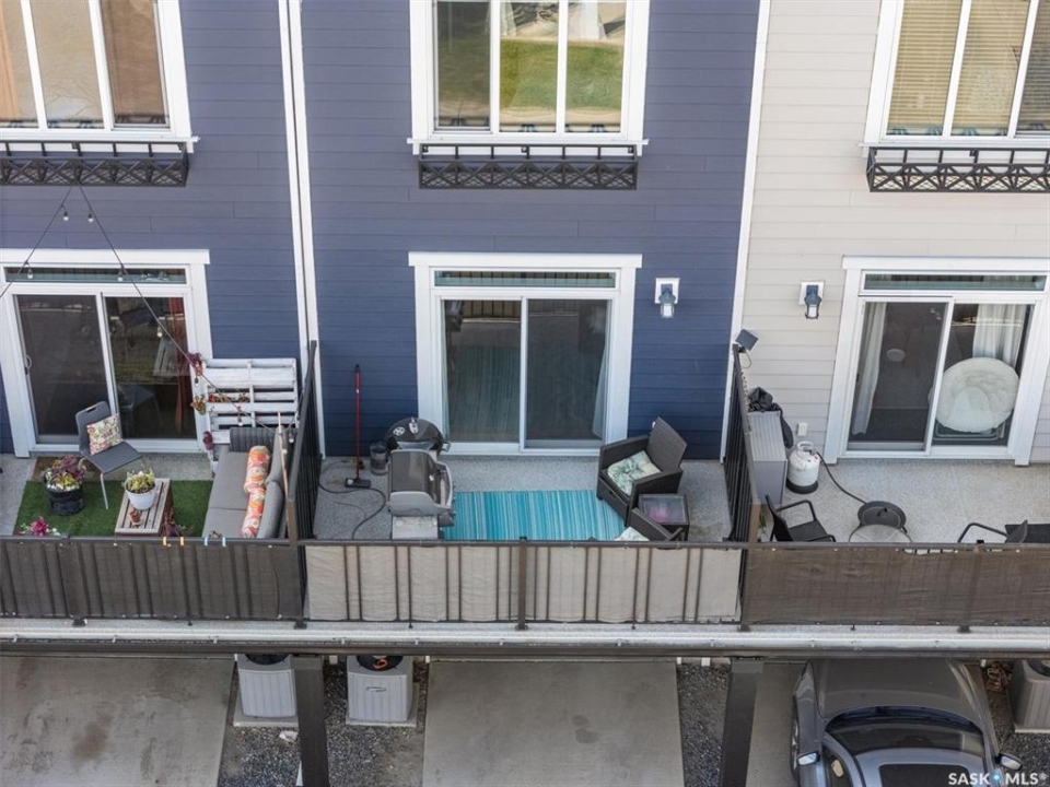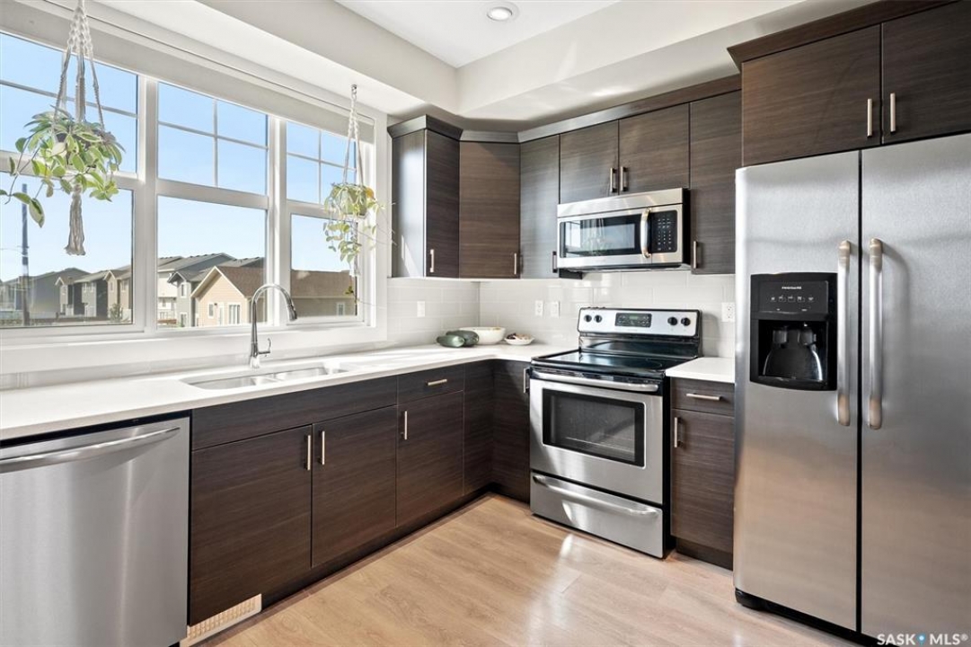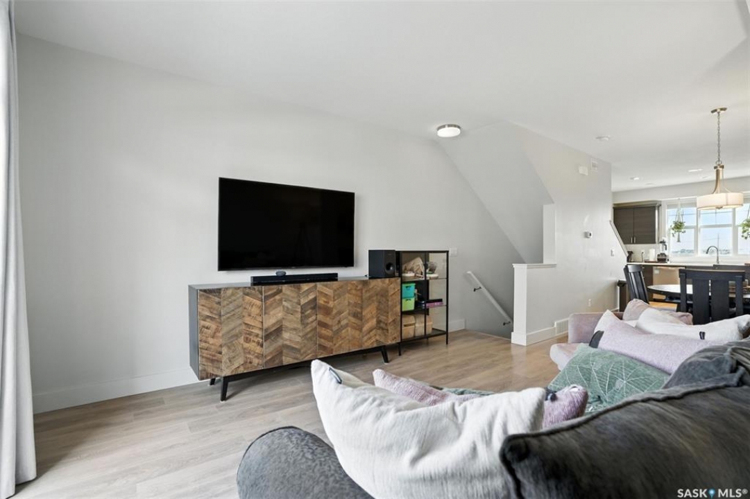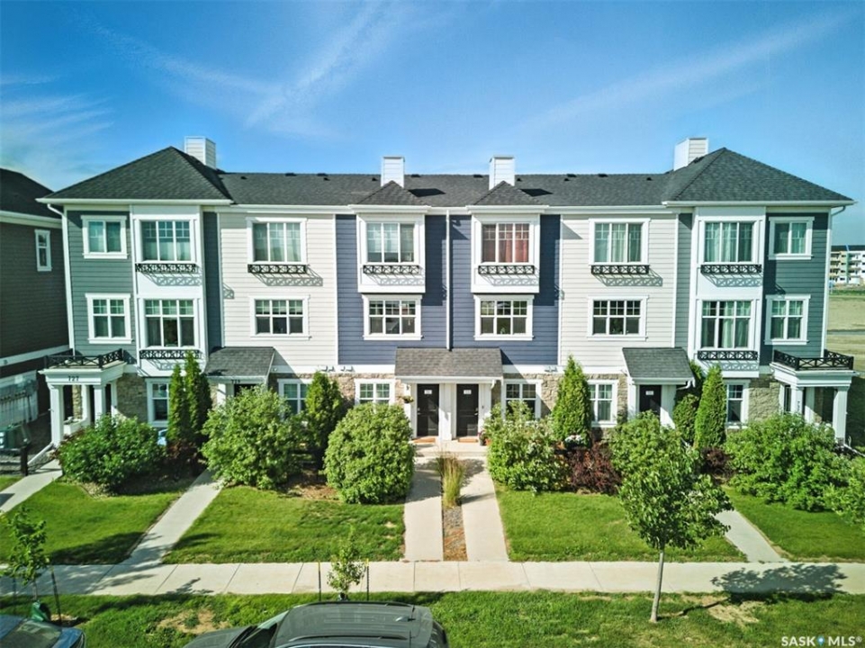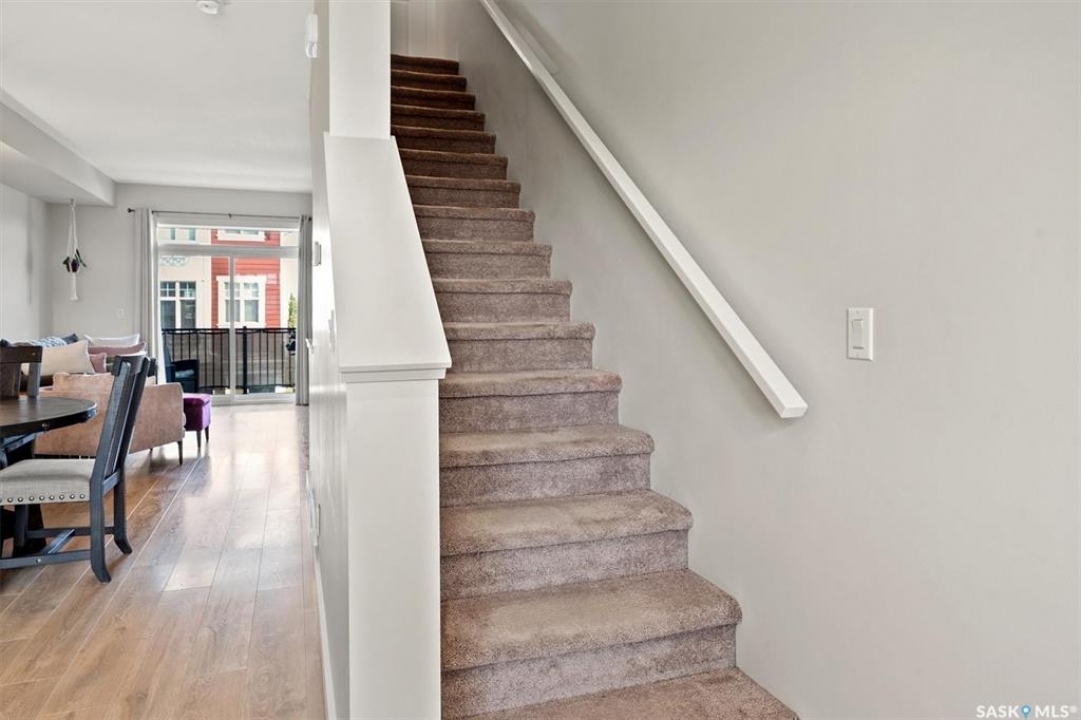 Welcome to this beautiful three-storey townhouse located in the highly sought-after community of Rosewood, Saskatoon. Offering a perfect blend of modern style and functional living, this home is ideal for anyone seeking comfort and convenience in one of the city's most popular neighbourhoods. Inside, you'll find a bright and inviting open-concept layout. The spacious living room flows seamlessly into the dining area and kitchen, creating the perfect space for entertaining or spending time with family. Large windows and a private balcony allow for plenty of natural light, while the modern kitchen features stainless steel appliances, sleek cabinetry, and ample counter space. This home offers three comfortable bedrooms and two well-appointed bathrooms. The main floor bathroom is tucked around from the living area and includes a stand-up shower. The primary bedroom is a serene retreat with a large window and room to unwind at the end of the day. Do not miss the five-piece ensuite, featuring a double vanity and a tub/shower combo. Additional highlights include convenient upstairs laundry, tasteful finishes throughout, and a private balcony perfect for relaxing or barbecuing. The single attached heated garage provides both parking and storage while currently being used as a home gym. This location offers easy access to parks, walking trails, schools, shopping, and all the amenities a vibrant neighbourhood could offer. Don't miss this chance to join one of Saskatoon's thriving areas, a community poised for growth and expansion.