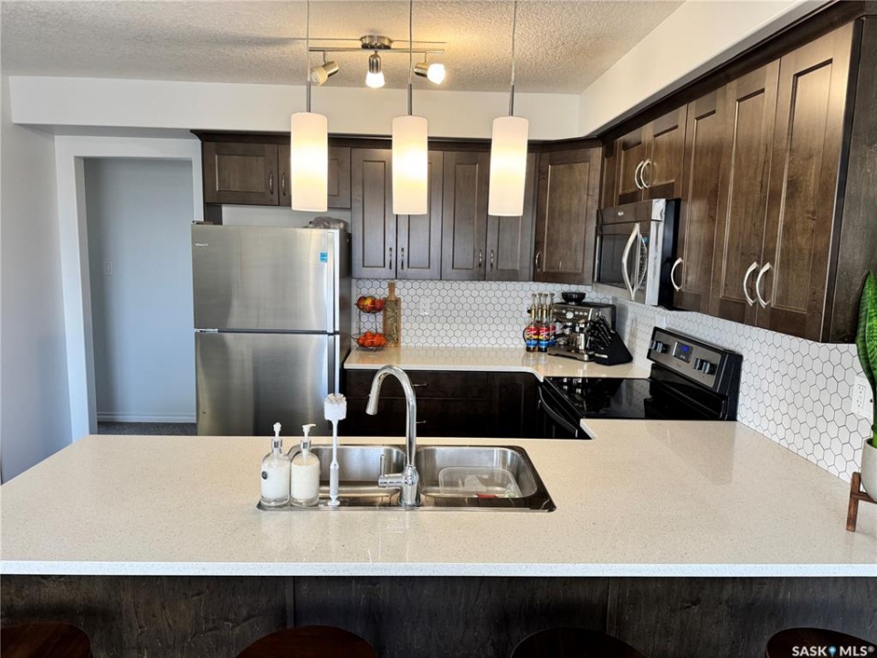 Park Views, Sunlight, and Style—This Corner Condo Has It All! Welcome to your top-floor retreat, a spacious 1,260 sq ft corner unit that blends modern finishes with unbeatable convenience. Overlooking the park and just steps from schools, shops, and everyday amenities, this home offers the perfect mix of comfort and lifestyle. Step inside through a private entry with a roomy coat closet and head up to the bright, open-concept living and dining area. Thanks to its corner location, this home is drenched in natural light from extra windows, creating a warm and inviting atmosphere. The kitchen is a true standout—complete with maple cabinetry, quartz countertops, stainless steel appliances, a stylish custom backsplash, pantry, and a huge eat-up peninsula that's perfect for family gatherings or entertaining friends. With three generous bedrooms, you'll have all the space you need. One bedroom features elegant French doors, making it an ideal home office, while the primary suite boasts a luxurious four-piece ensuite. An additional four-piece bathroom ensures comfort and convenience for guests or family members. This move-in-ready condo also comes equipped with air conditioning and a large balcony where you can relax and enjoy the park views. Parking is a breeze with a single detached garage, an electrified surface stall, and ample street parking right outside your door. Stylish, spacious, and perfectly located—this home is a complete package at an incredible price.
