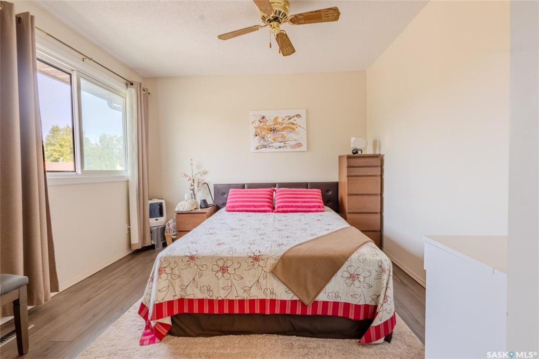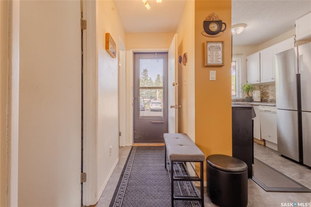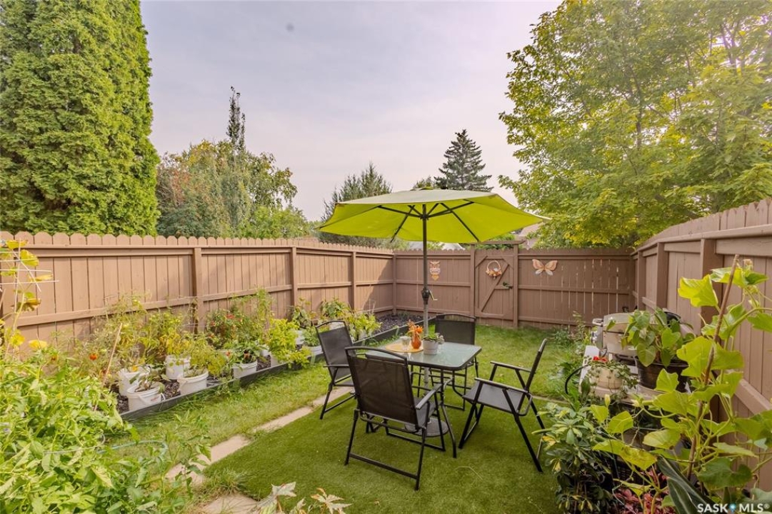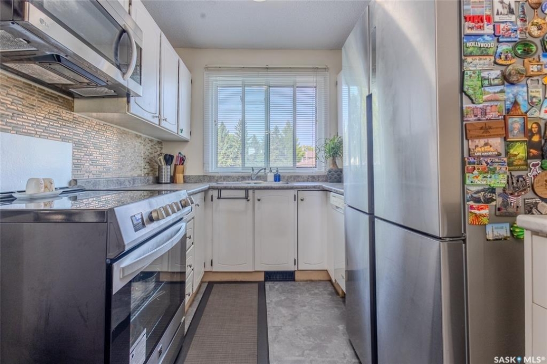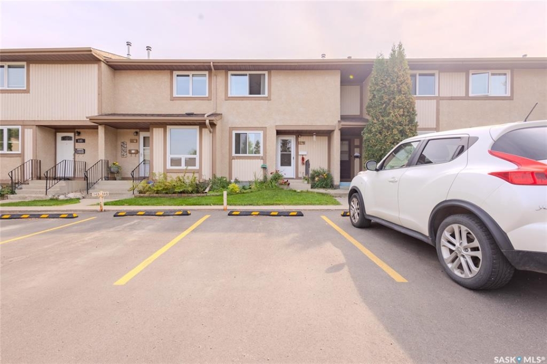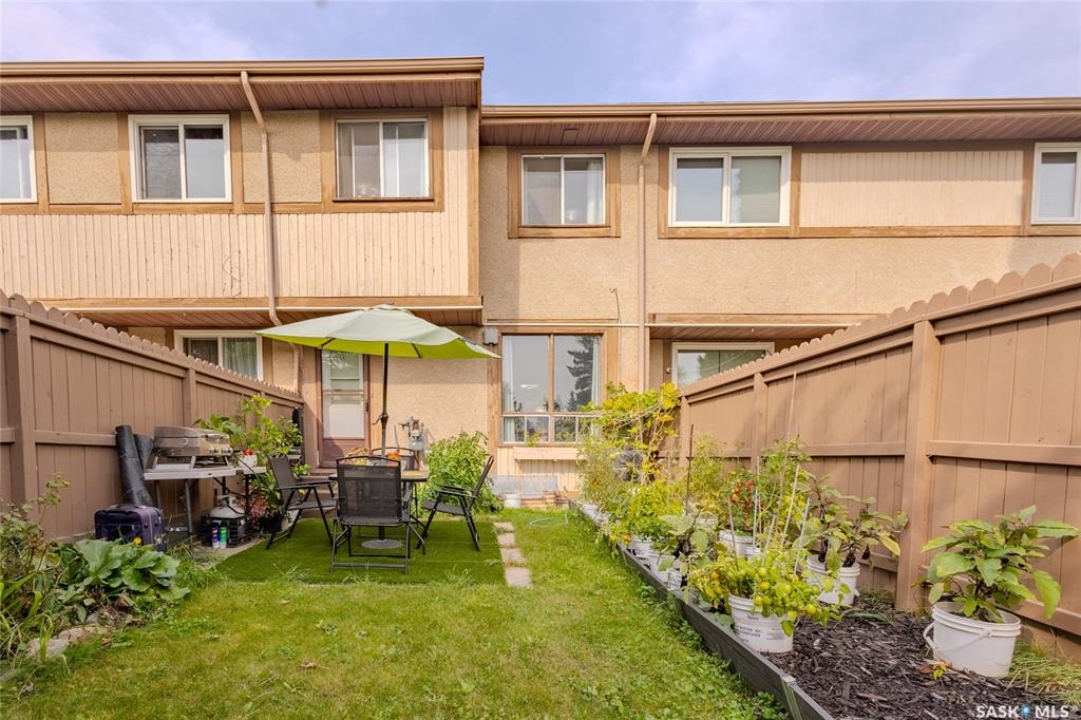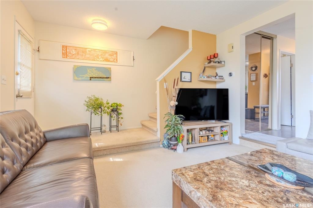 Situated in a great location within Wildwood Village, directly across from a playground and close to bus routes and all 8th Street amenities, this townhouse offers comfort and convenience at an affordable price. The main floor features a bright living room with a large south-facing window that fills the space with natural light, opening to the dining area. The functional kitchen includes a built-in dishwasher, backsplash, new microwave with hood fan, double sink, and a new kitchen window with a view of the playground. A conveniently located half bath just off the front entry completes the main level. Upstairs, you'll find laminate flooring throughout, a spacious primary bedroom with a new window, two additional bedrooms, and a full bathroom. The basement offers additional living space with a rec area and a laundry/storage room. Outside, enjoy a private, fully fenced south-facing backyard with a patio that is deeper than most units. Recent updates include new windows in the kitchen and primary bedroom, laminate flooring upstairs, a new stove, and a new microwave hood fan. The parking lot was freshly redone in 2024. This move-in ready home is ideal for first-time buyers, young families, investors, or anyone looking for a low-maintenance property in a convenient east-side location. Call your Realtor today to book your private showing!