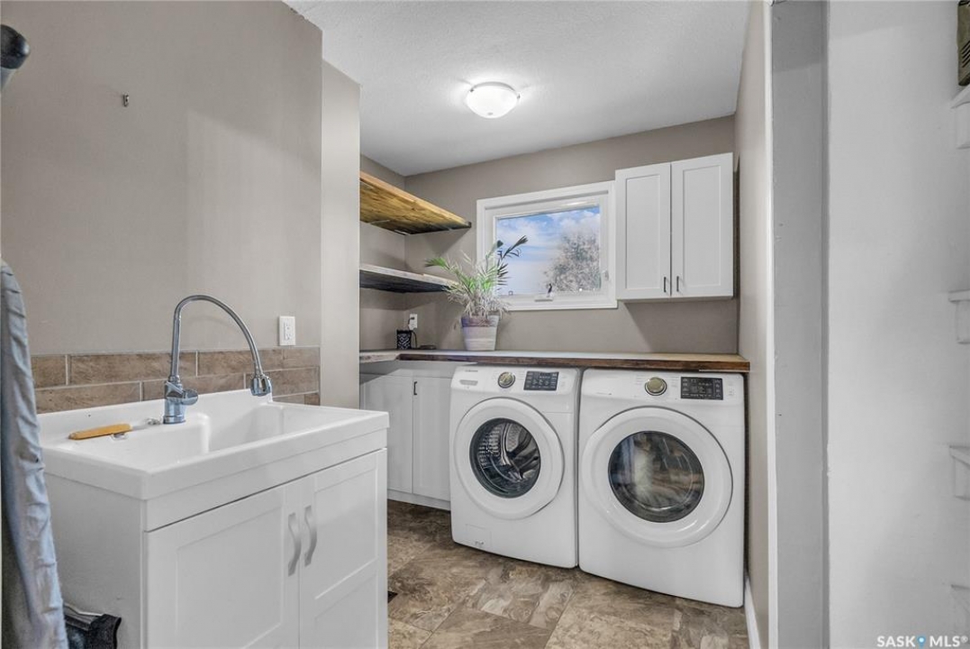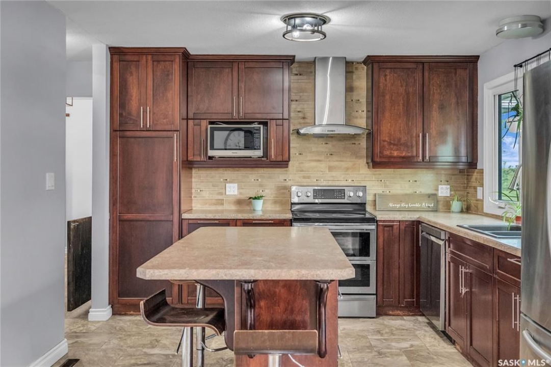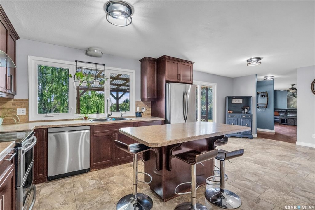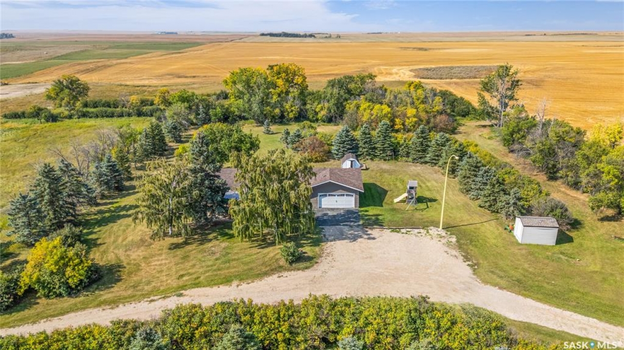 You will appreciate this family sized, country bungalow located SE of Allan and or SW of Young. This 10 acre mature treed yard site is a great place to raise a family or enjoy what country living has to offer. When you enter this home, you are welcomed to a spacious mud room with cabinetry and storage spaces for clothes and footwear. There is a home office off the mud room with a view of the backyard. The kitchen and open eating area is a great space to gather around the kitchen table. The island provides a great spot to prepare the meals. Sliding doors for quick access to the east facing deck from the dining area. Large living room and three spacious bedrooms, 5 piece bath (2 sinks) and a dedicated main floor laundry room with a sink and cabinetry. The basement features a large family room and an area for games, 3 pc bath, storage and utility room. The insulted attached garage with direct entry is a great benefit. Come and view this great property. You could be spending your next Christmas in the country?