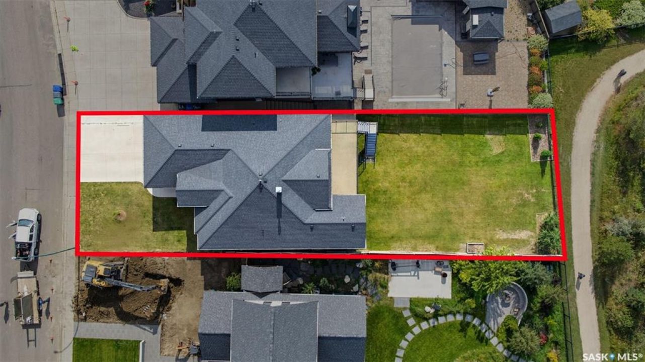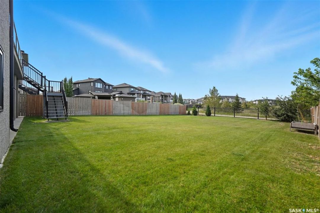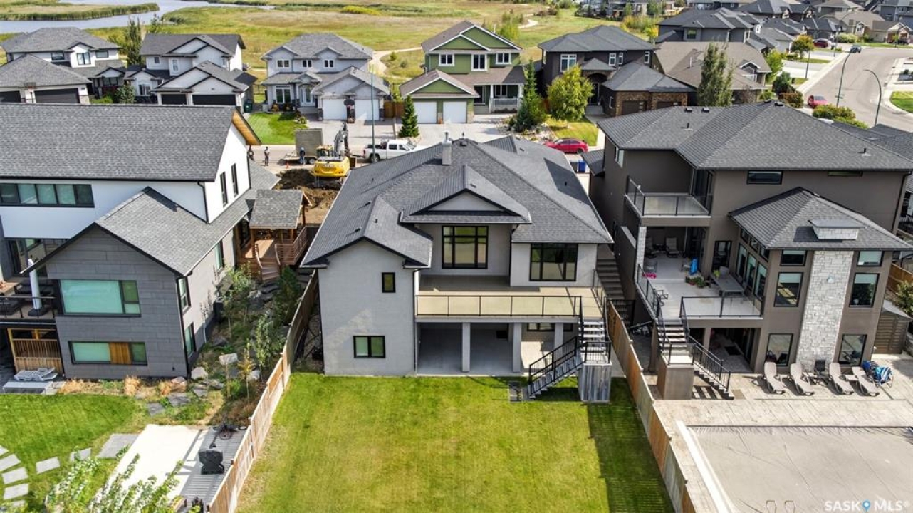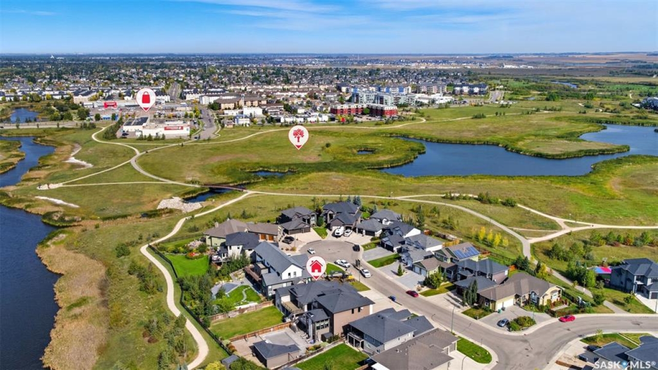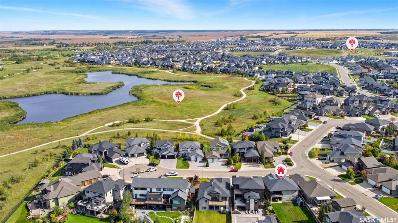Welcome to 714 Ledingham Place, a rare find in a fantastic cul-de-sac location backing onto Hyde Park with breathtaking water views. Situated on a massive 9,559 sq. ft. lot with a sunny southwest-facing backyard, this D&S–built walkout bungalow offers over 3,600 sq. ft. of luxurious living space with top-quality finishes inside and out. The striking stone and stucco exterior, oversized driveway accommodating up to five vehicles, and impressive curb appeal set the tone. Inside, the main floor boasts soaring 12-ft ceilings, a spacious foyer with tile flooring, open-concept living with a tiled feature wall and gas fireplace, and a chef's dream kitchen with abundant maple cabinetry, granite countertops, tiled backsplash, corner pantry, and a generous dining area overlooking the park and pond. Hardwood flooring flows throughout, complementing three large bedrooms, including a primary suite with walk-in closet and spa-like ensuite featuring dual sinks and a tiled shower. Main floor laundry adds convenience. The bright walkout basement expands the living space with a large games room, family room, office, two additional bedrooms with walk-in closets, a 5-piece bath with jetted tub, and durable laminate flooring. Outdoor living shines with a composite deck, glass railing, and stairs leading to the park-like yard with underground sprinklers on a timer. Additional upgrades include triple-pane windows, central vac, HRV, new central A/C (2025), dishwasher (2023), and fridge (2021). Close to schools, shopping, and all amenities, this home truly shows 10/10.