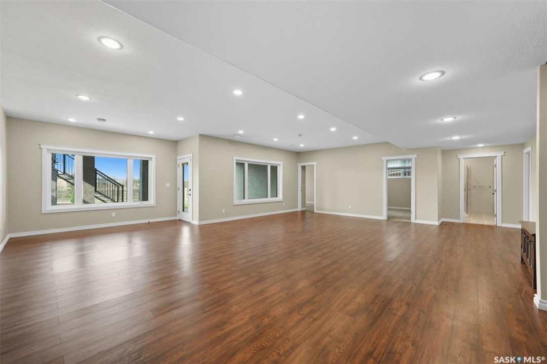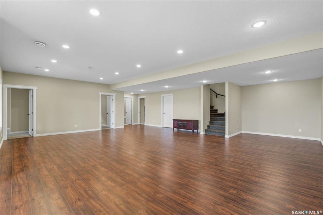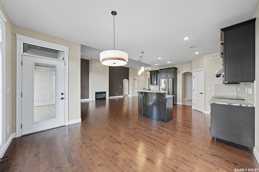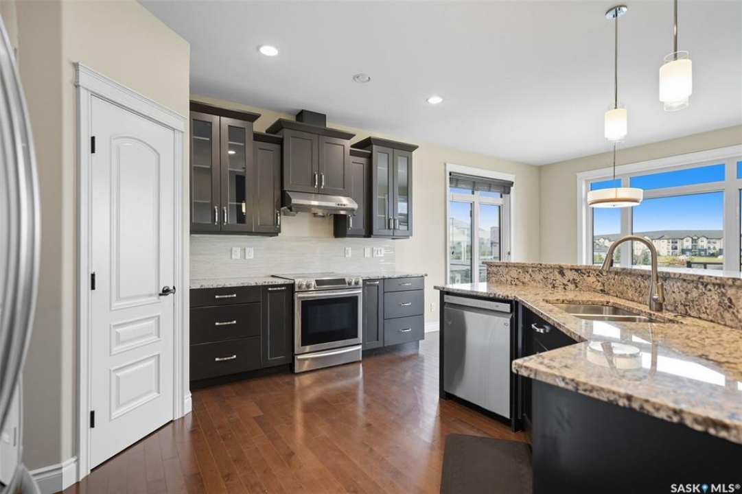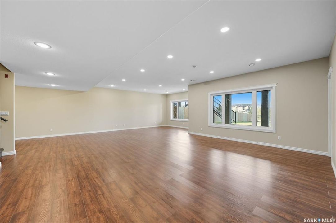 Welcome to 714 Ledingham Place, a rare find in a fantastic cul-de-sac location backing onto Hyde Park with breathtaking water views. Situated on a massive 9,559 sq. ft. lot with a sunny southwest-facing backyard, this D&S–built walkout bungalow offers over 3,600 sq. ft. of luxurious living space with top-quality finishes inside and out. The striking stone and stucco exterior, oversized driveway accommodating up to five vehicles, and impressive curb appeal set the tone. Inside, the main floor boasts soaring 12-ft ceilings, a spacious foyer with tile flooring, open-concept living with a tiled feature wall and gas fireplace, and a chef's dream kitchen with abundant maple cabinetry, granite countertops, tiled backsplash, corner pantry, and a generous dining area overlooking the park and pond. Hardwood flooring flows throughout, complementing three large bedrooms, including a primary suite with walk-in closet and spa-like ensuite featuring dual sinks and a tiled shower. Main floor laundry adds convenience. The bright walkout basement expands the living space with a large games room, family room, office, two additional bedrooms with walk-in closets, a 5-piece bath with jetted tub, and durable laminate flooring. Outdoor living shines with a composite deck, glass railing, and stairs leading to the park-like yard with underground sprinklers on a timer. Additional upgrades include triple-pane windows, central vac, HRV, new central A/C (2025), dishwasher (2023), and fridge (2021). Close to schools, shopping, and all amenities, this home truly shows 10/10.