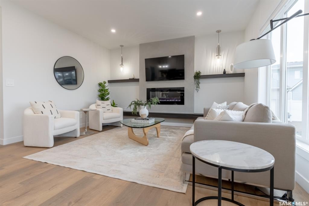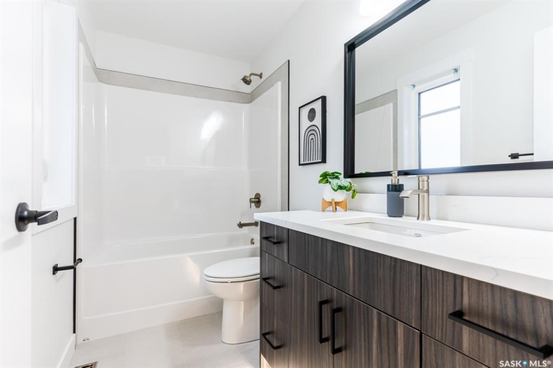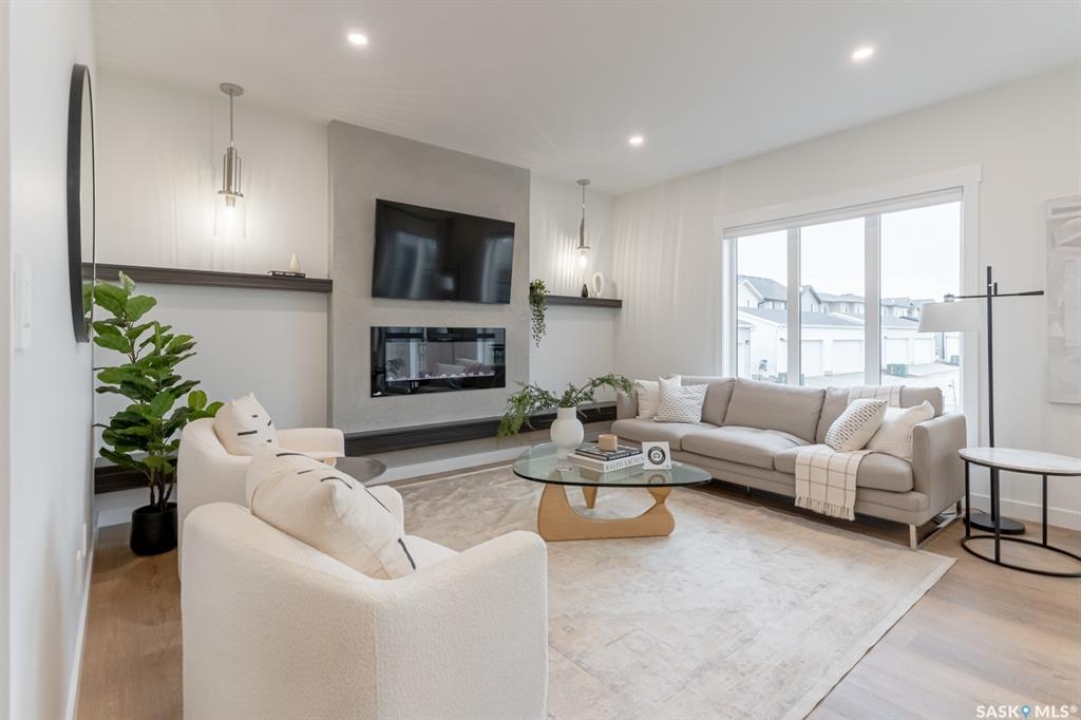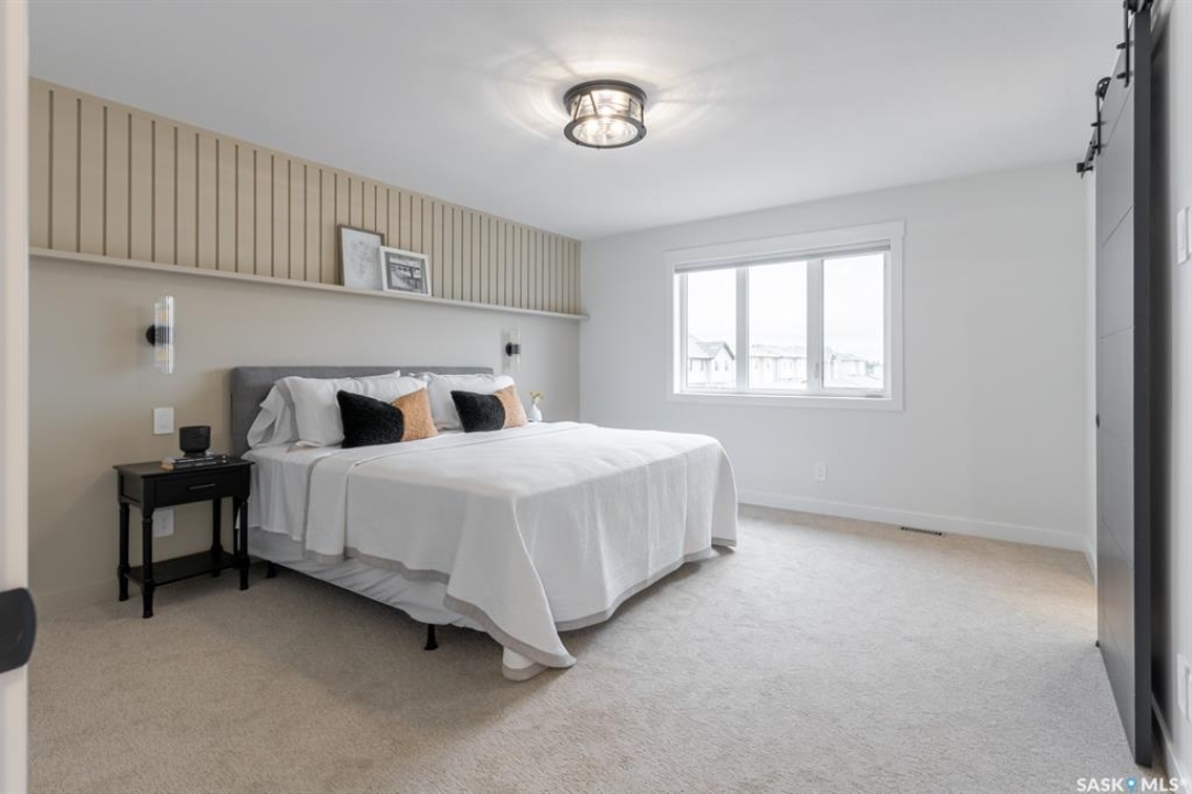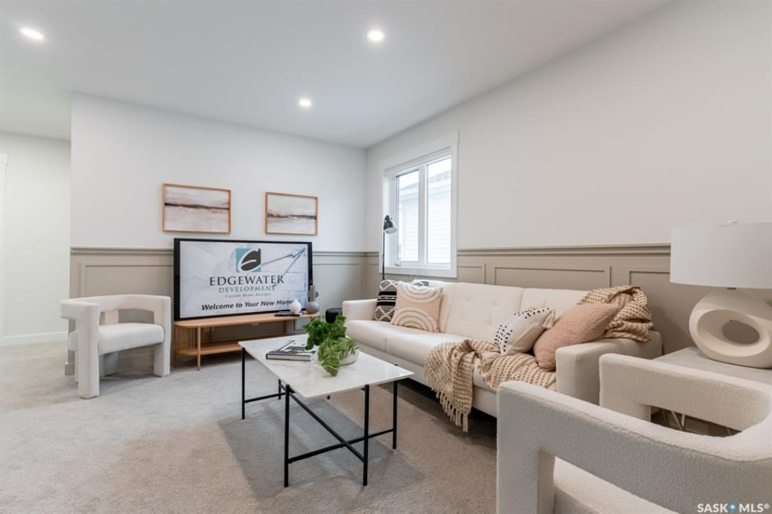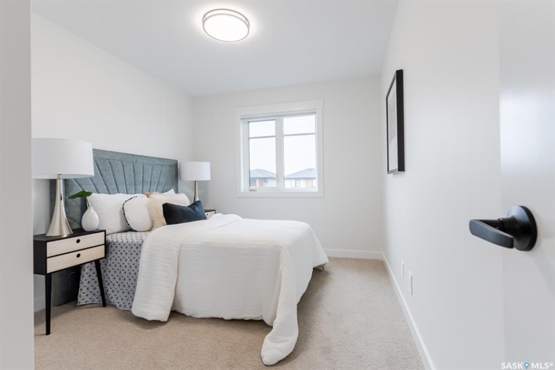 "The Queens", a 2088 square foot home, Entering the home from the oversized fully insulated garage, you step into the mudroom which is conveniently attached to the walk through pantry with lower cabinets and a separate sink. The kitchen features an oversize island with eating ledge, a gorgeous backsplash and gleaming quartz countertops. The great room features large windows, and oversize patio doors for an abundance of light. The fireplace is a stunning focal point in the room. The addition of the office/flex area adjacent to the front entrance is a perfect work from home space. Upstairs, the primary bedroom is spacious. The ensuite has an 8' vanity with double sinks with a generous amount of drawers for storage, a 5' custom tiled shower and stand alone tub, and a private water closet. From there, you enter directly into the walk through closet with lots of double rods and shelving for your wardrobe. Exiting the closet, you pass directly into the laundry room equipped with lower cabinets and quartz countertop and sink for easy laundry tasks. 2 additional bedrooms, a 4 piece bath and a central bonus/flex area finish this floor. All Pictures may not be exact representations of the home, to be used for reference purposes only. Errors and omissions excluded. Prices, plans, specifications subject to change without notice. All Edgewater homes are covered under the Saskatchewan New Home Warranty program. PST & GST included with rebate to builder