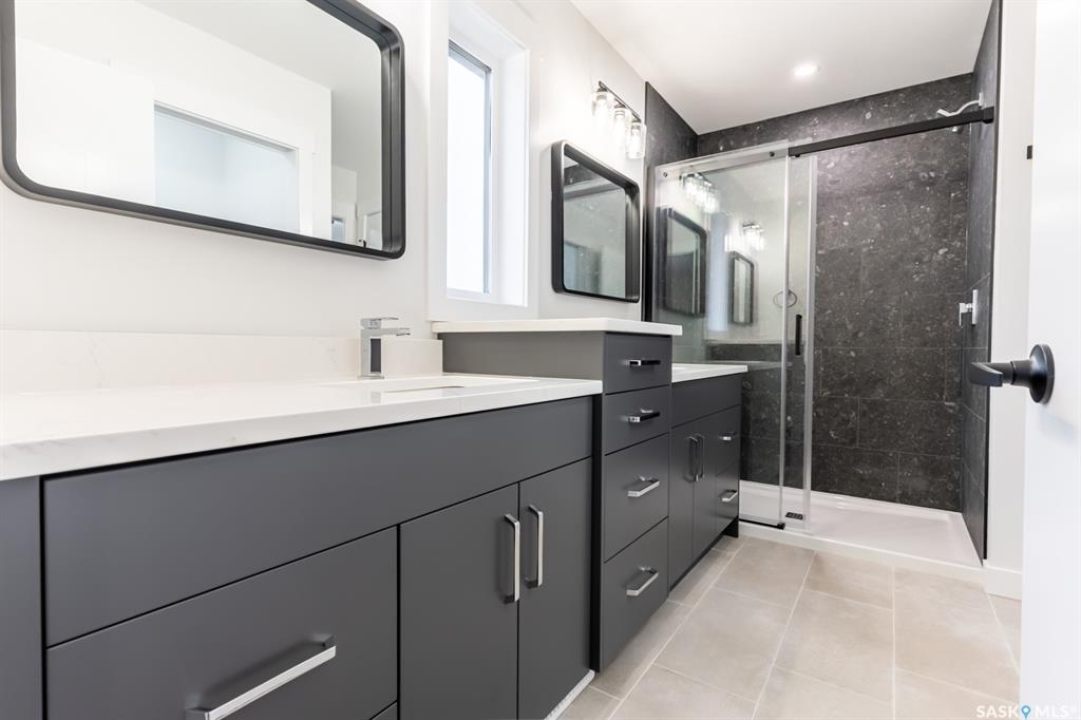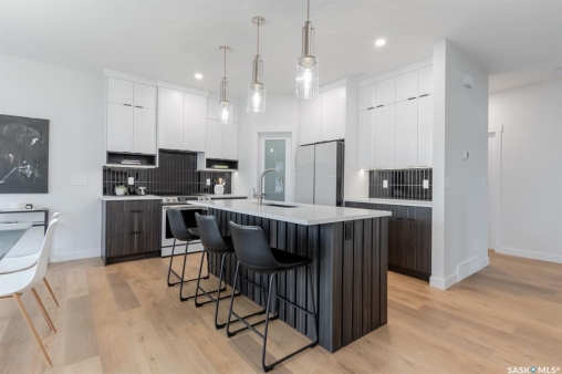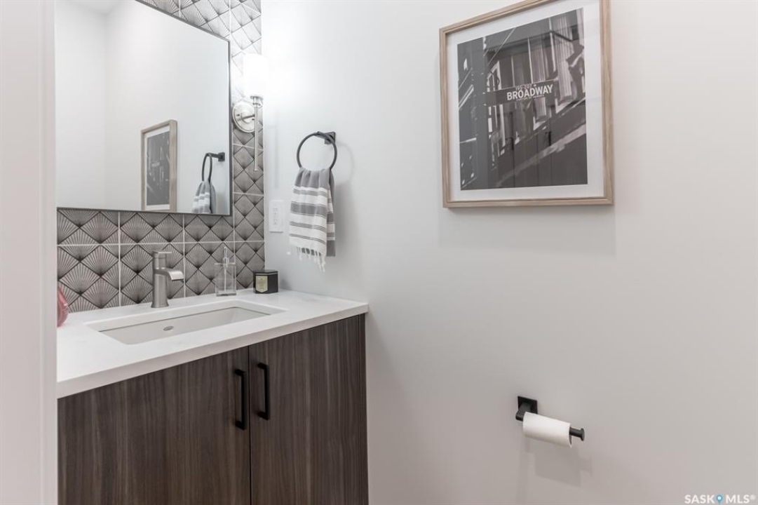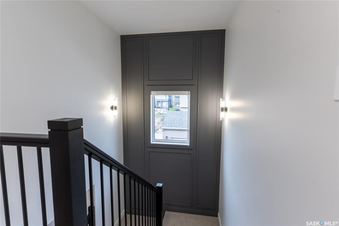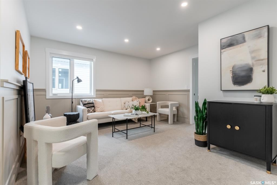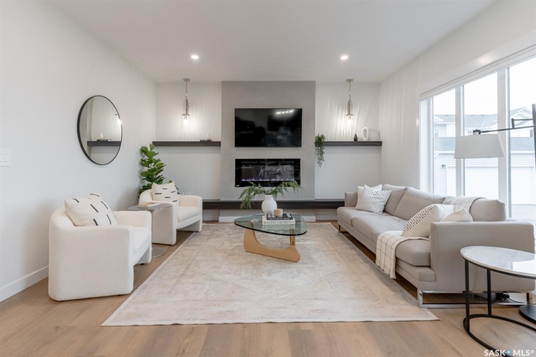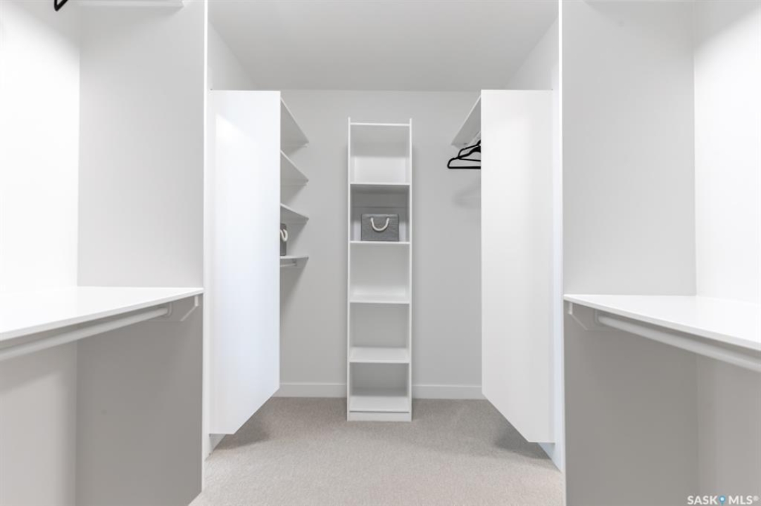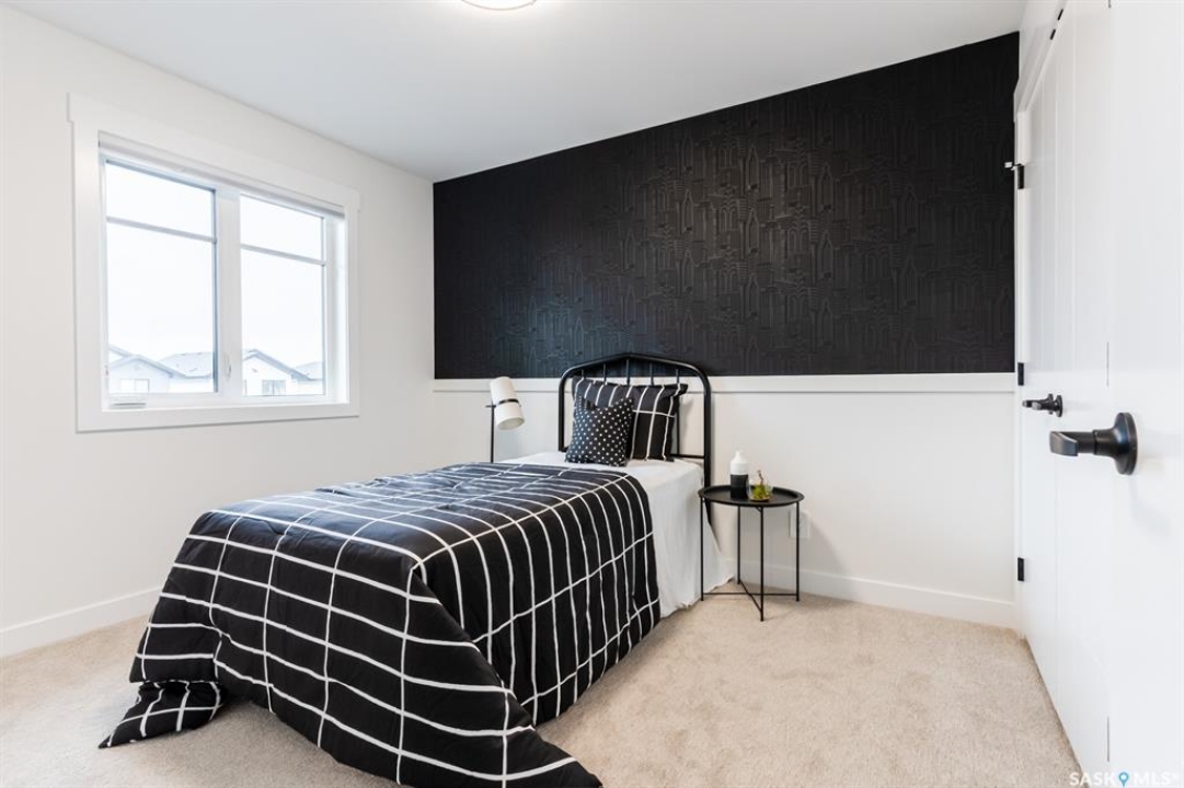 "The Queens", a 2088 square foot home, Entering the home from the oversized fully insulated garage, you step into the mudroom which is conveniently attached to the walk through pantry with lower cabinets and a separate sink. The kitchen features an oversize island with eating ledge, a gorgeous backsplash and gleaming quartz countertops. The great room features large windows, and oversize patio doors for an abundance of light. The fireplace is a stunning focal point in the room. The addition of the office/flex area adjacent to the front entrance is a perfect work from home space. Upstairs, the primary bedroom is spacious. The ensuite has an 8' vanity with double sinks with a generous amount of drawers for storage, a 5' custom tiled shower and stand alone tub, and a private water closet. From there, you enter directly into the walk through closet with lots of double rods and shelving for your wardrobe. Exiting the closet, you pass directly into the laundry room equipped with lower cabinets and quartz countertop and sink for easy laundry tasks. 2 additional bedrooms, a 4 piece bath and a central bonus/flex area finish this floor. All Pictures may not be exact representations of the home, to be used for reference purposes only. Errors and omissions excluded. Prices, plans, specifications subject to change without notice. All Edgewater homes are covered under the Saskatchewan New Home Warranty program. PST & GST included with rebate to builder