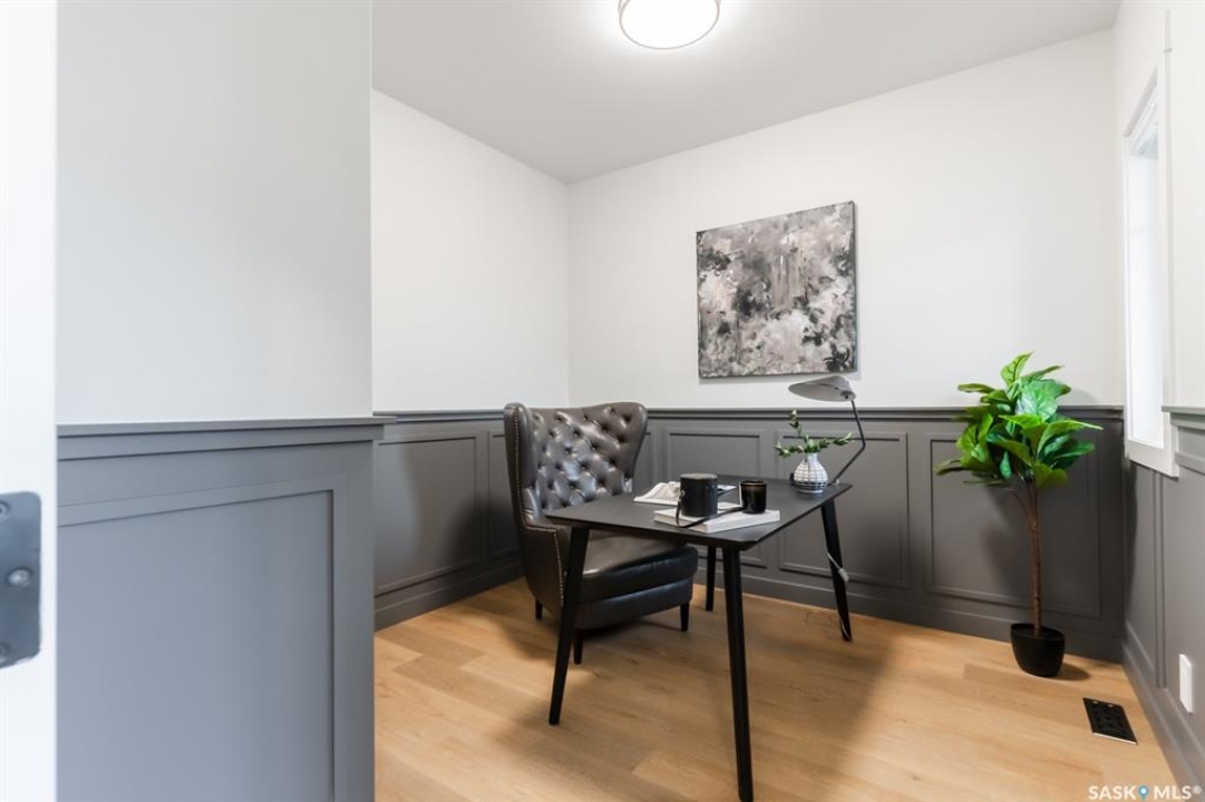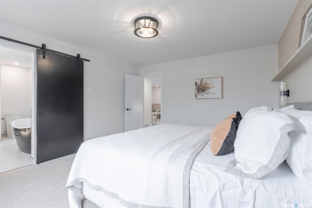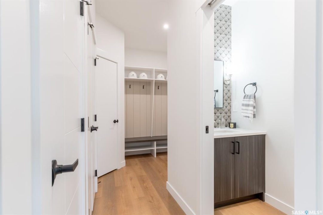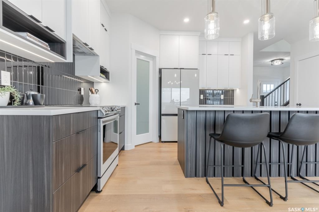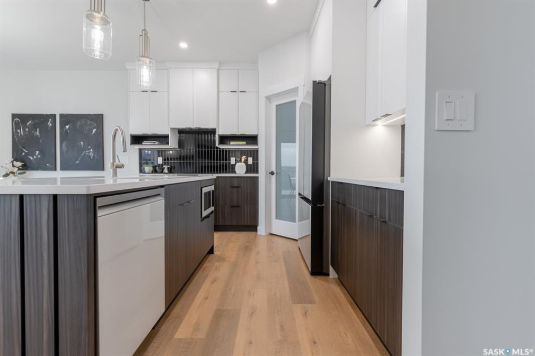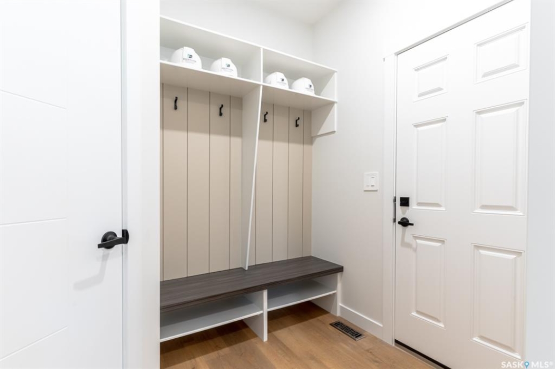 "The Queens", a 2088 square foot home, Entering the home from the oversized fully insulated garage, you step into the mudroom which is conveniently attached to the walk through pantry with lower cabinets and a separate sink. The kitchen features an oversize island with eating ledge, a gorgeous backsplash and gleaming quartz countertops. The great room features large windows, and oversize patio doors for an abundance of light. The fireplace is a stunning focal point in the room. The addition of the office/flex area adjacent to the front entrance is a perfect work from home space. Upstairs, the primary bedroom is spacious. The ensuite has an 8' vanity with double sinks with a generous amount of drawers for storage, a 5' custom tiled shower and stand alone tub, and a private water closet. From there, you enter directly into the walk through closet with lots of double rods and shelving for your wardrobe. Exiting the closet, you pass directly into the laundry room equipped with lower cabinets and quartz countertop and sink for easy laundry tasks. 2 additional bedrooms, a 4 piece bath and a central bonus/flex area finish this floor. All Pictures may not be exact representations of the home, to be used for reference purposes only. Errors and omissions excluded. Prices, plans, specifications subject to change without notice. All Edgewater homes are covered under the Saskatchewan New Home Warranty program. PST & GST included with rebate to builder