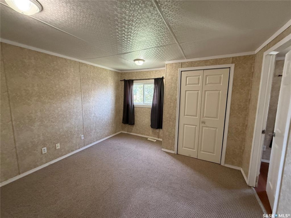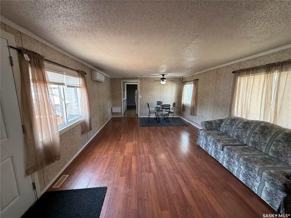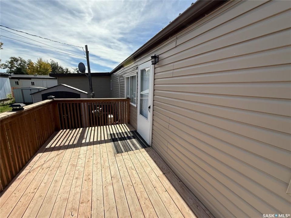 36 Heritage Estates, Kindersley. **Seller to pay the first 3 months lot rent for a buyer** This 1975 mobile home is approximately 980 square feet and has been nicely updated, waiting for its new owners! Two bedrooms, the front bedroom offers a 2 piece ensuite. Living room and dining space have access to the side entrance. The kitchen has nice updates such a new cabinets. There is a bonus room that allows space for a toy room or office. The main 4 piece bath has had an updated tub and surround. The master bedroom, laundry addition and storage complete the mobile. Features to this home include an air conditioner (wall), new deck as well as newer siding. Call today for more information and to schedule your tour! Lot rent- $725/month which includes water, town tax, sewer and garbage pickup.