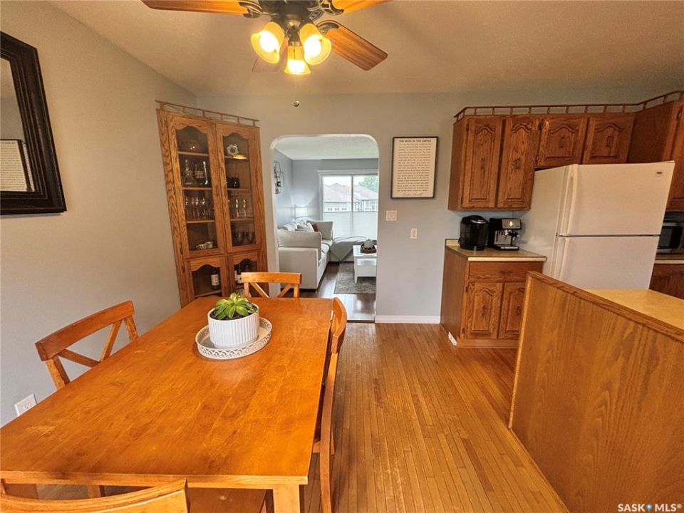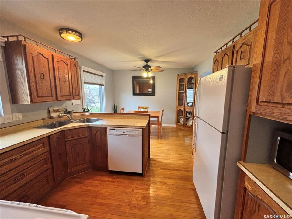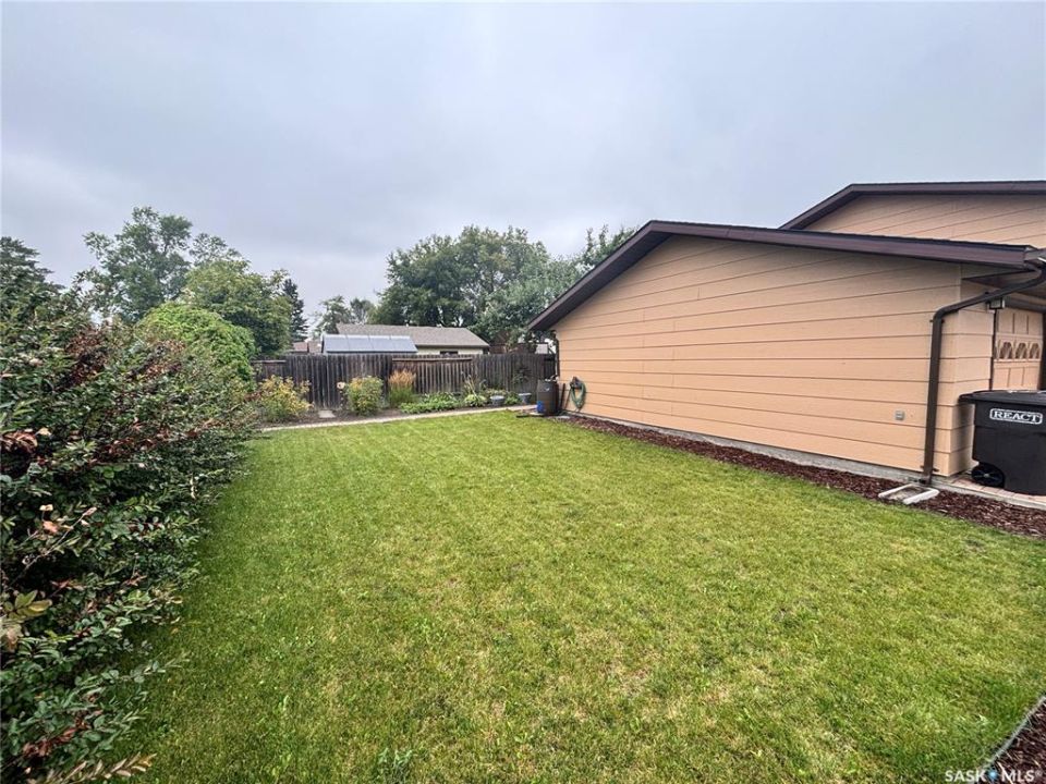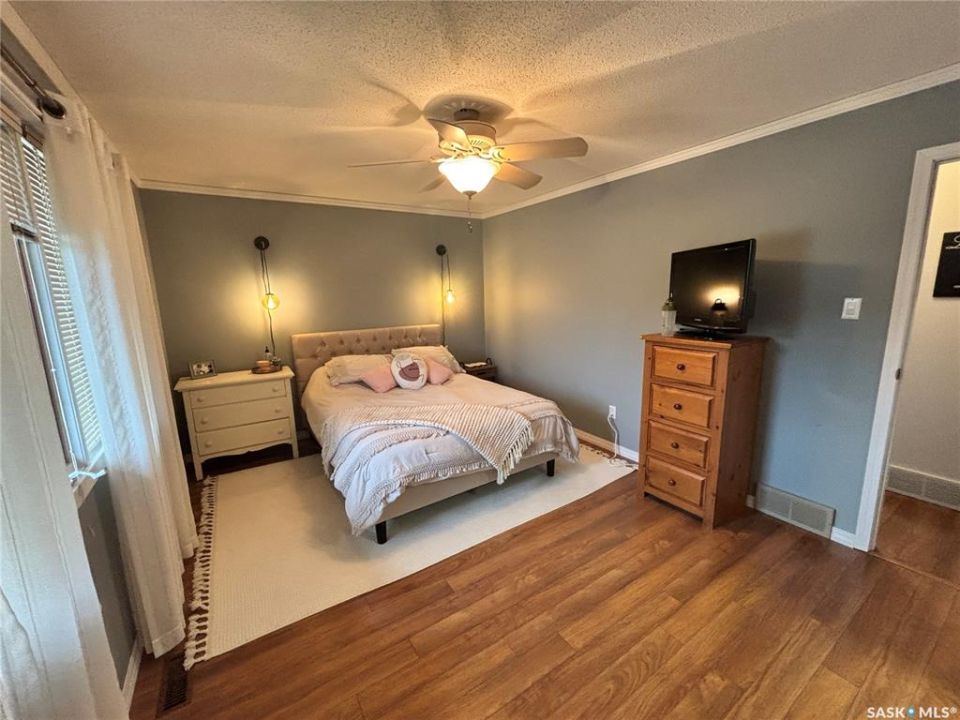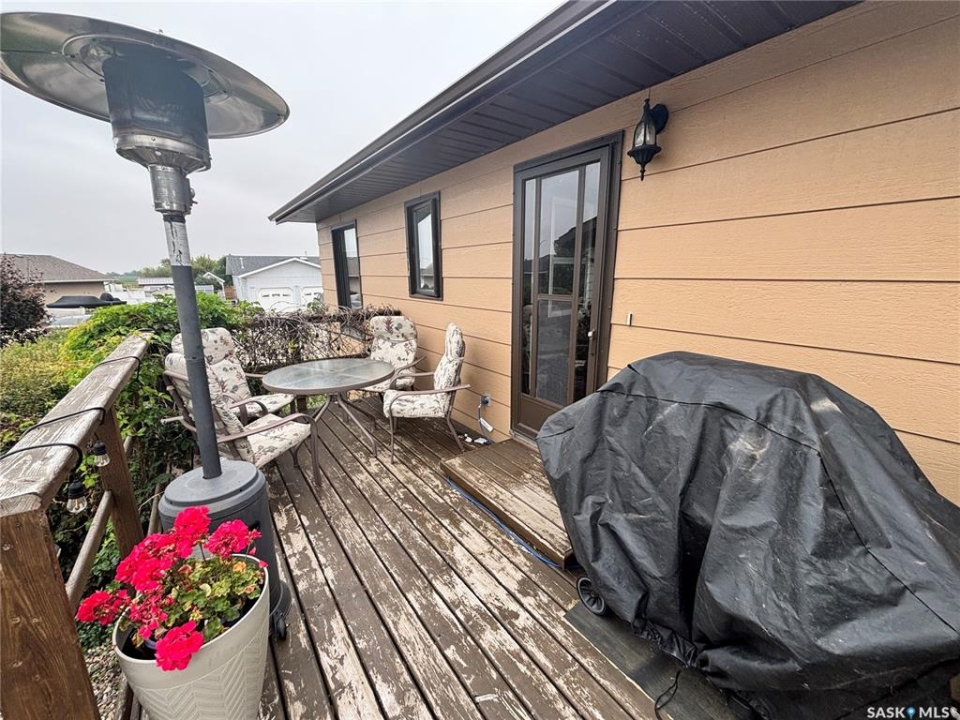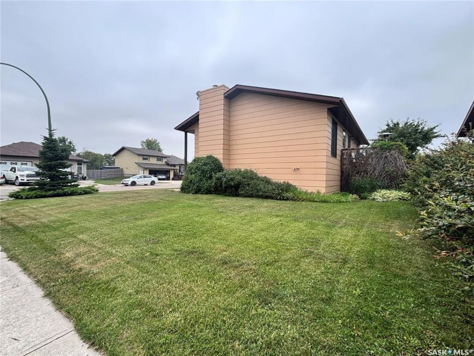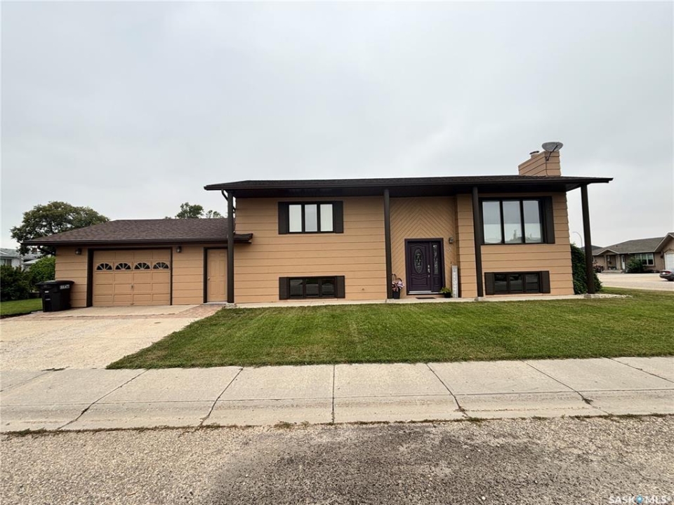 Welcome to this well-maintained bi-level home located in the growing community of Lanigan, Saskatchewan. Nestled on a quiet crescent, this property sits on a desirable corner lot within walking distance to schools and parks—an ideal spot for families. The exterior boasts attractive street appeal with a single attached garage, surrounding green space, a small garden area, and a three-tier deck at the back—perfect for entertaining or enjoying the outdoors. Inside, you're greeted with a spacious entrance that offers the option to go up or downstairs. The main level features a bright living room with large windows, flowing seamlessly into the dining room and kitchen. The kitchen provides plenty of counter and cupboard space with classic oak cabinetry, along with a convenient storage closet off the rear entry—large enough to house a stand-up freezer. Two generously sized bedrooms and a four-piece bath complete the main floor. The primary bedroom includes a unique makeup area that could easily be converted back into a two-piece ensuite for added convenience. A handy laundry chute connects the main bath directly to the basement laundry area. The lower level is designed for comfortable living with large windows that bring in natural light, a spacious family room with a cozy wood-burning fireplace, two additional bedrooms, a three-piece bath, and a laundry/utility room with ample storage. With a thoughtful layout, plenty of storage, and a welcoming neighborhood, this home offers comfort and functionality for a growing family.