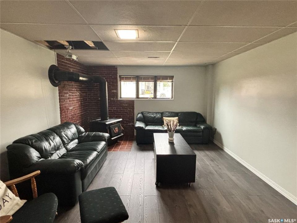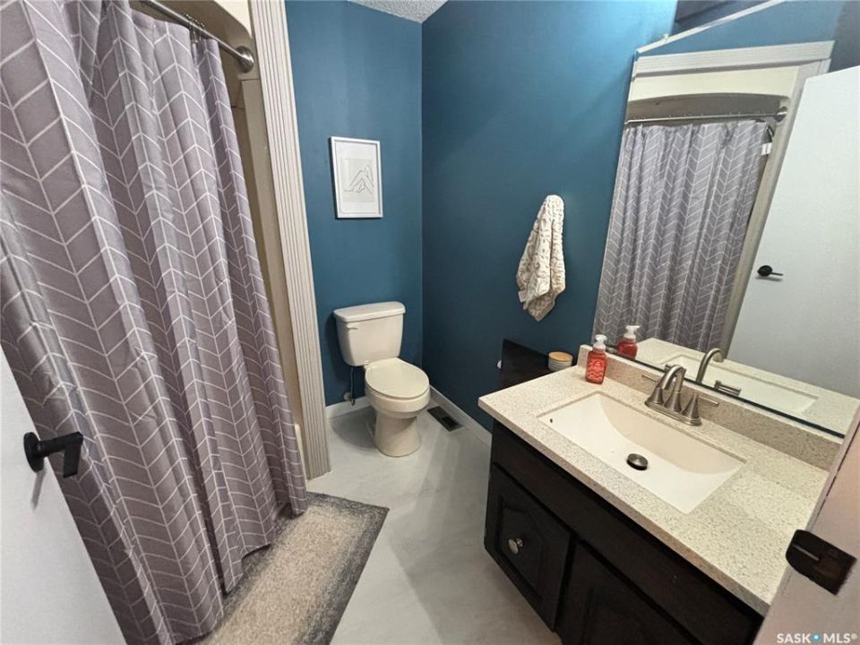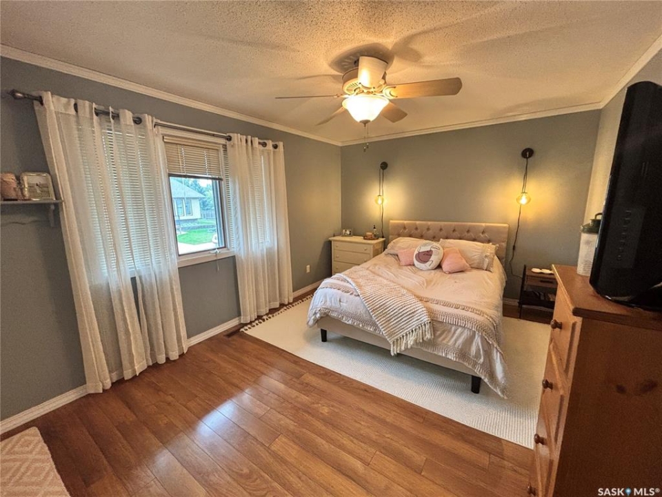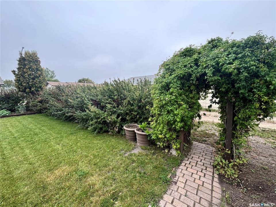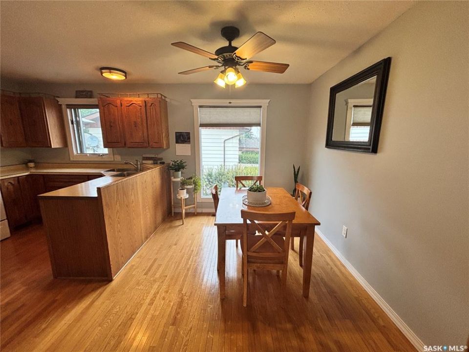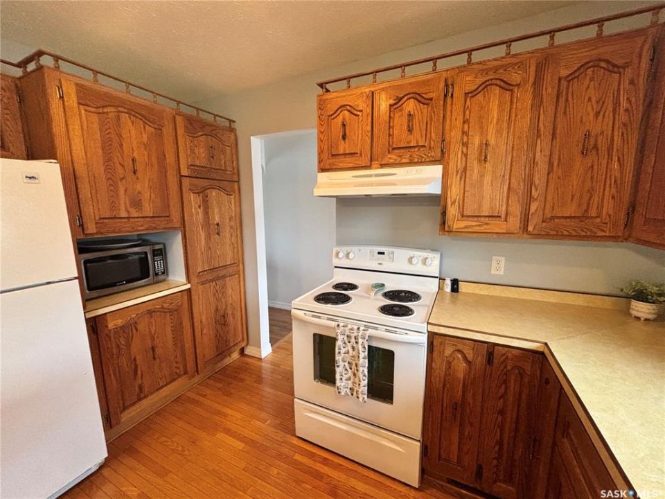 Welcome to this well-maintained bi-level home located in the growing community of Lanigan, Saskatchewan. Nestled on a quiet crescent, this property sits on a desirable corner lot within walking distance to schools and parks—an ideal spot for families. The exterior boasts attractive street appeal with a single attached garage, surrounding green space, a small garden area, and a three-tier deck at the back—perfect for entertaining or enjoying the outdoors. Inside, you're greeted with a spacious entrance that offers the option to go up or downstairs. The main level features a bright living room with large windows, flowing seamlessly into the dining room and kitchen. The kitchen provides plenty of counter and cupboard space with classic oak cabinetry, along with a convenient storage closet off the rear entry—large enough to house a stand-up freezer. Two generously sized bedrooms and a four-piece bath complete the main floor. The primary bedroom includes a unique makeup area that could easily be converted back into a two-piece ensuite for added convenience. A handy laundry chute connects the main bath directly to the basement laundry area. The lower level is designed for comfortable living with large windows that bring in natural light, a spacious family room with a cozy wood-burning fireplace, two additional bedrooms, a three-piece bath, and a laundry/utility room with ample storage. With a thoughtful layout, plenty of storage, and a welcoming neighborhood, this home offers comfort and functionality for a growing family.