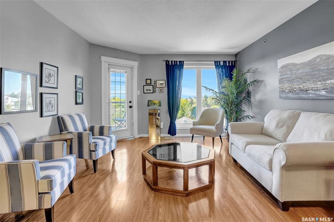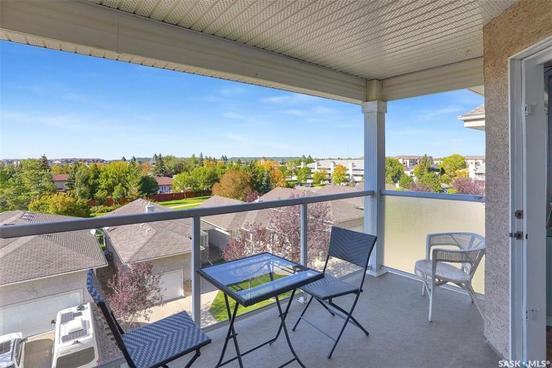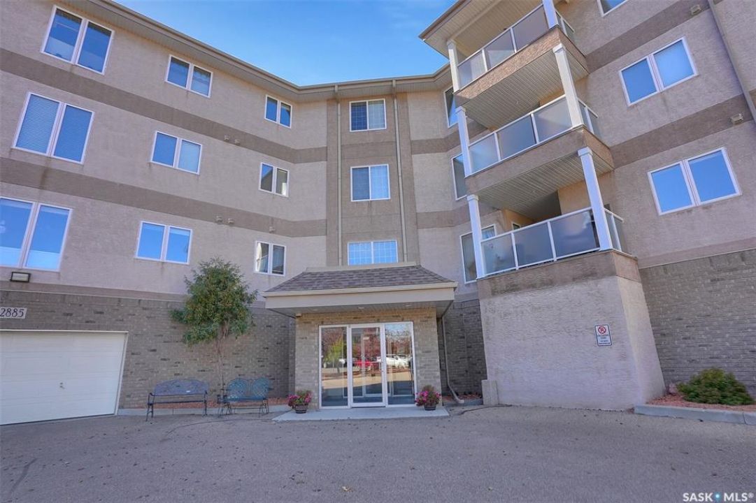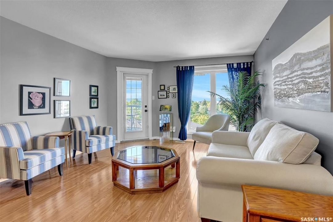 This condo has what so many people ask for! Top floor: facing west: with lots of natural light. Welcome to suite 409! Come inside to the foyer that has plenty of space to display furniture, artwork and even a bench. Lovely colored easy care laminate throughout. As you look forward from the foyer hallway there is a lovely view from the livingroom window. The main living area offers plenty of space for you to arrange the furniture based on your personal lifestyle. Whether you choose to have a dining area or a more casual style with the kitchen eating bar. Or both! The kitchen work space is well designed with lots of cupboards and counter space. Attractive backsplash and cabinet knobs. Fridge, stove, microwave hood fan and dishwasher replaced within the last 4 years. The spacious master bedroom provides two closets and a 3 piece ensuite. The shower has a seat, sliding glass door and grab bars. On the other side of the living room is the very large second bedroom providing plenty of space for chairs and/or a desk. Conveniently located main bathroom. A garden door off the living room opens to the west facing covered deck. Now to the elevator that is a short distance to the elevator. The parking spot in the heated parkade has 2 storage lockers in front. The building offers an amenities room (2nd floor), guest suite and craft room (3rd floor), exercise room, storage room (4th floor), hobby shop with tools, car wash bay in parkade with hose,brushes and shop vac. Lots of outside visitor parking. Condo fees of $490.04 per month include water, sewer, common area maintenance and insurance, exterior building maintenance, garbage, centralized water heater and water softner, lawn care, snow removal and reserve fund. Pets are not allowed. The building location is perfect for access to many amenities, shopping and dining. You will want to check this out!
