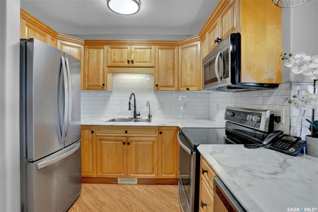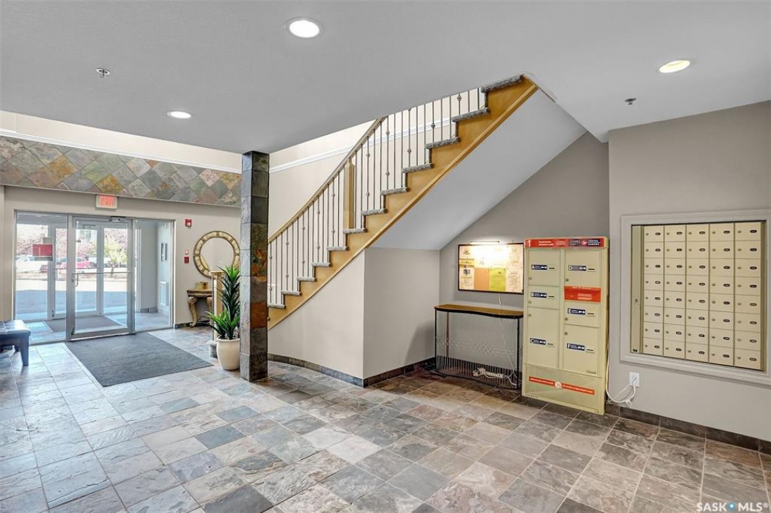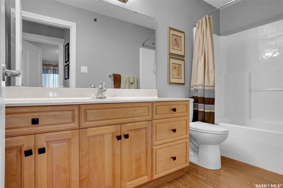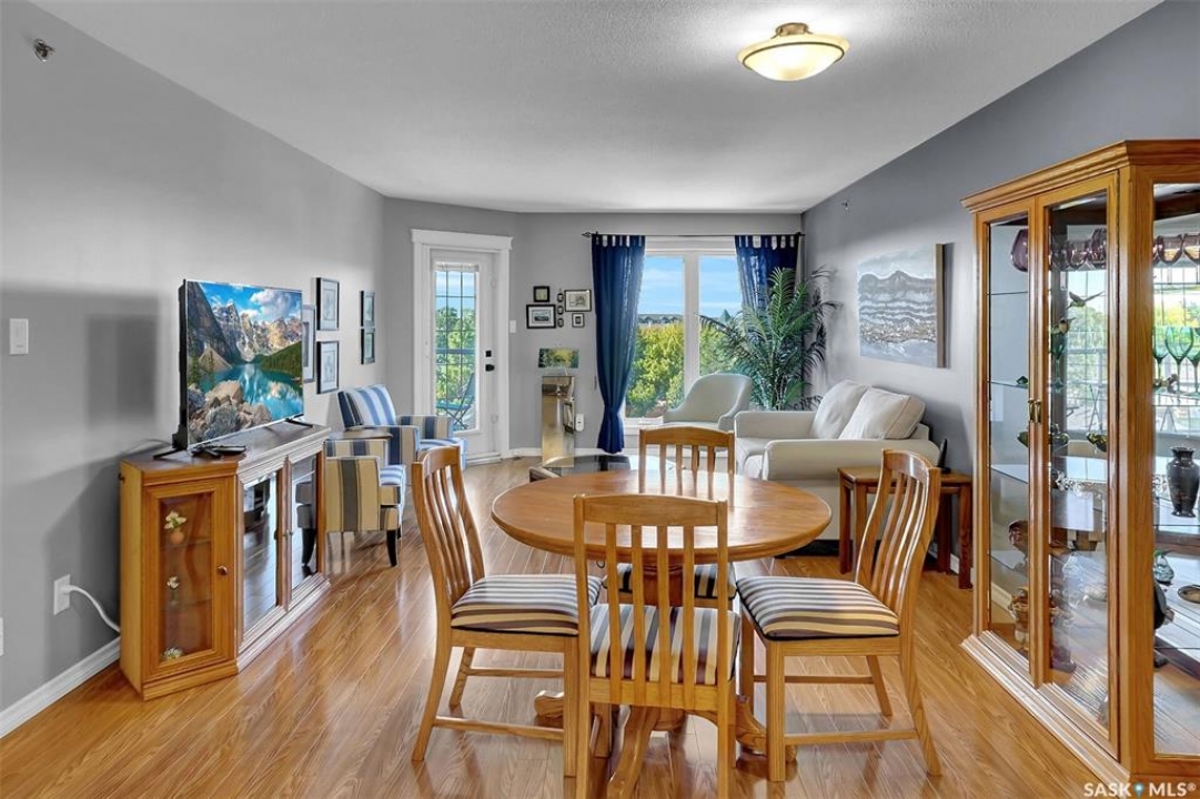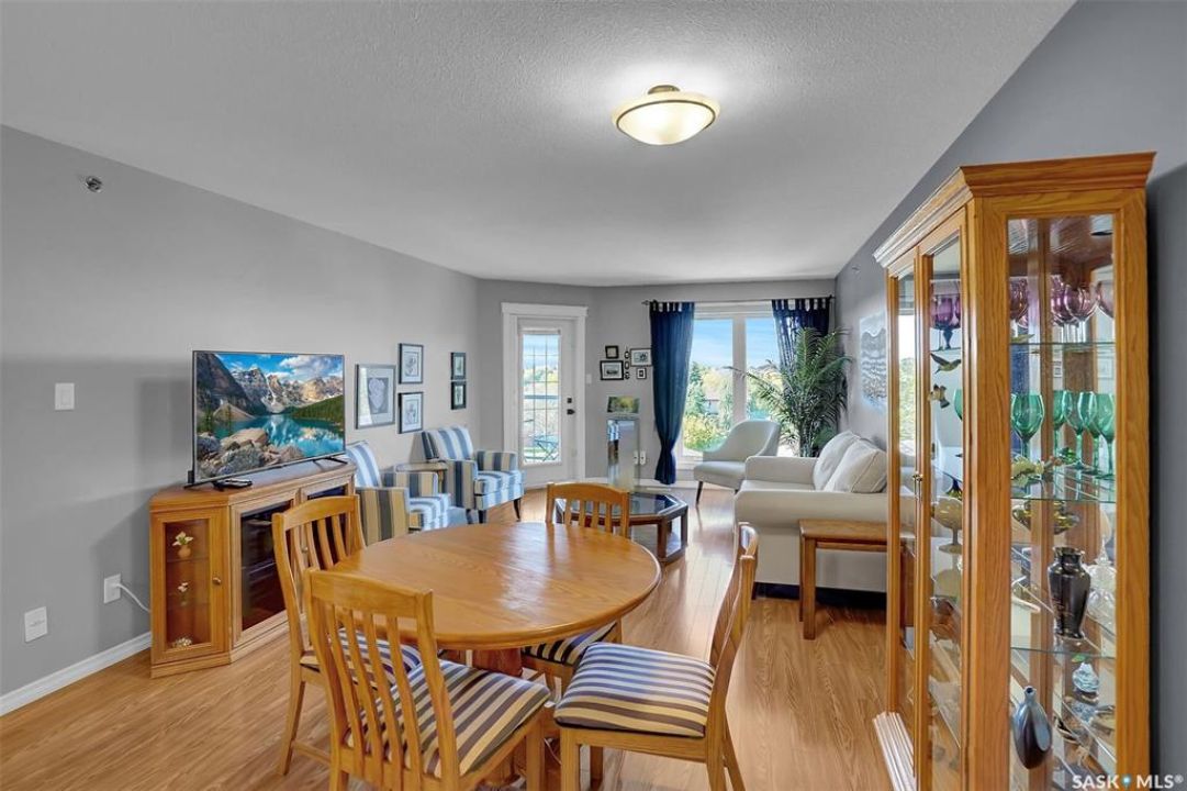 This condo has what so many people ask for! Top floor: facing west: with lots of natural light. Welcome to suite 409! Come inside to the foyer that has plenty of space to display furniture, artwork and even a bench. Lovely colored easy care laminate throughout. As you look forward from the foyer hallway there is a lovely view from the livingroom window. The main living area offers plenty of space for you to arrange the furniture based on your personal lifestyle. Whether you choose to have a dining area or a more casual style with the kitchen eating bar. Or both! The kitchen work space is well designed with lots of cupboards and counter space. Attractive backsplash and cabinet knobs. Fridge, stove, microwave hood fan and dishwasher replaced within the last 4 years. The spacious master bedroom provides two closets and a 3 piece ensuite. The shower has a seat, sliding glass door and grab bars. On the other side of the living room is the very large second bedroom providing plenty of space for chairs and/or a desk. Conveniently located main bathroom. A garden door off the living room opens to the west facing covered deck. Now to the elevator that is a short distance to the elevator. The parking spot in the heated parkade has 2 storage lockers in front. The building offers an amenities room (2nd floor), guest suite and craft room (3rd floor), exercise room, storage room (4th floor), hobby shop with tools, car wash bay in parkade with hose,brushes and shop vac. Lots of outside visitor parking. Condo fees of $490.04 per month include water, sewer, common area maintenance and insurance, exterior building maintenance, garbage, centralized water heater and water softner, lawn care, snow removal and reserve fund. Pets are not allowed. The building location is perfect for access to many amenities, shopping and dining. You will want to check this out!