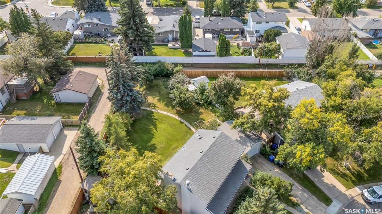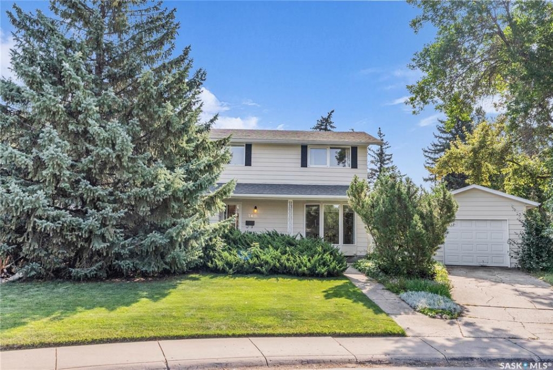 Welcome to 54 Britnell Crescent, a rare opportunity to own a timeless two-storey home on one of West College Park's most prestigious and quiet crescents. Set on a massive pie-shaped lot—just shy of 12,000 sq. ft.—this property is a private park all your own. Whether you're picnicking under the trees, dancing beneath the northern lights, watching rabbits hop through the yard, or picking apples from your very own tree, this backyard is pure magic. The home offers 1,816 square feet of well-planned living space, freshly dressed with new exterior paint and complemented by a detached garage and concrete driveway. Inside, you'll find four generous bedrooms upstairs (easily converted back to five if desired), including a primary suite with a sizeable closet and private ensuite. The main floor was designed for both comfort and connection: a formal dining room big enough to host your entire extended family, a rear family room with built-ins to showcase your travel treasures and serene views of the yard, and a fully renovated kitchen featuring ceiling-height cabinetry, a built-in desk, and a massive picture window overlooking the greenery. A beautifully updated 3-piece bathroom with tiled walk-in shower and wood feature ceiling rounds out the main level. Downstairs, the fully developed basement is a dream for entertaining and play—whether that means games night, movie marathons, or crafting. The oversized laundry room with utility sink adds practicality to the charm. This home has been cherished by the same family for over 40 years, and now it's ready for its next chapter. With Evan Hardy Collegiate just steps away, nearby parks and schools, easy access to 8th Street amenities, and a quick commute to the University of Saskatchewan and downtown, the location offers both convenience and community. If you're looking for a place with space to grow, laugh, host, and make memories, 54 Britnell Crescent is ready to welcome you home.