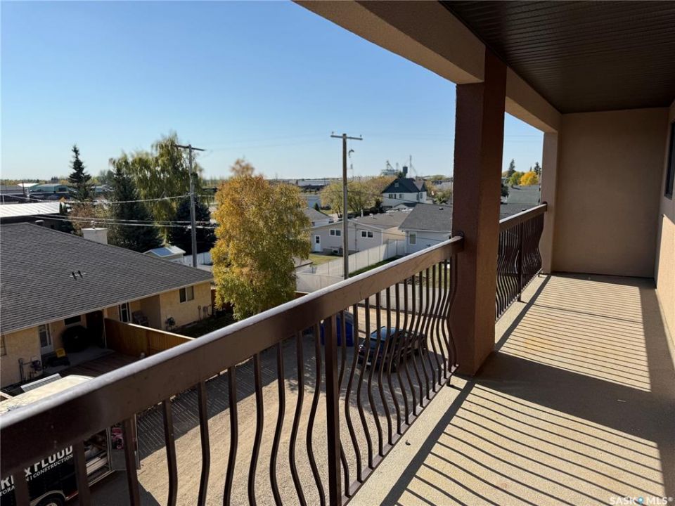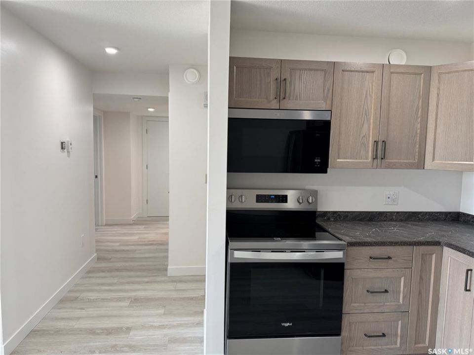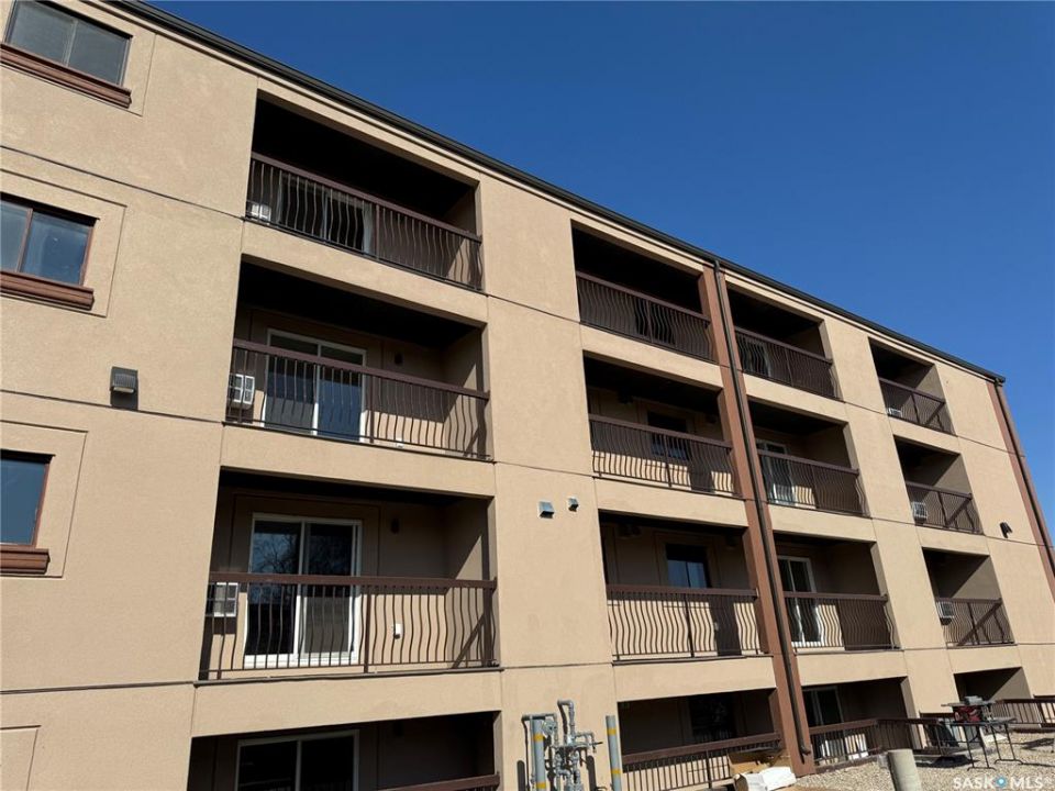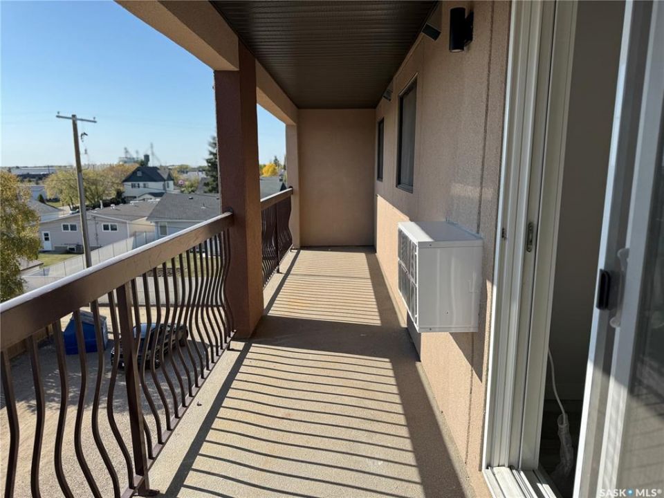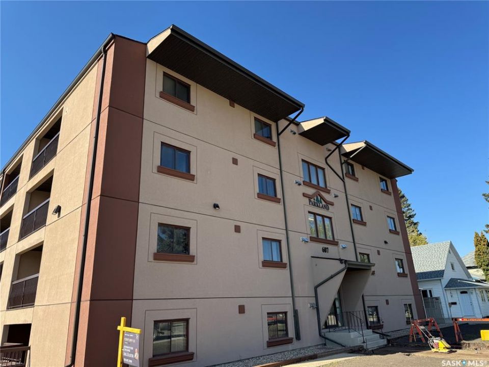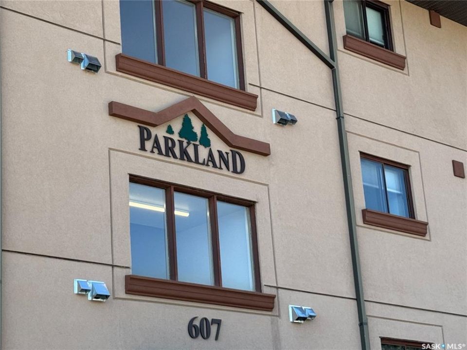 Middle top floor unit #403 facing south with a 29 ft. x 4.5 ft. balcony!! Tasteful choices made throughout this 2 bedroom condo, enhancing the new and spacious rooms, the light colored laminate flows throughout and the kitchen/bathroom/laundry cabinetry accents the unit. Stainless steel kitchen appliances include dishwasher, fridge, stove and microwave hood fan. In-suite laundry with washer & dryer included, along with upper cabinets. Beautiful 4 pc. bathroom. Bedrooms are very spacious. Intercom in each unit to allow guests in and 1 electrified surface parking stall. Parkland Condominiums is downtown living, close to all amenities to enjoy only a short walk away! Buyer to have property taxes verified by the City of Humboldt. Call to view today!