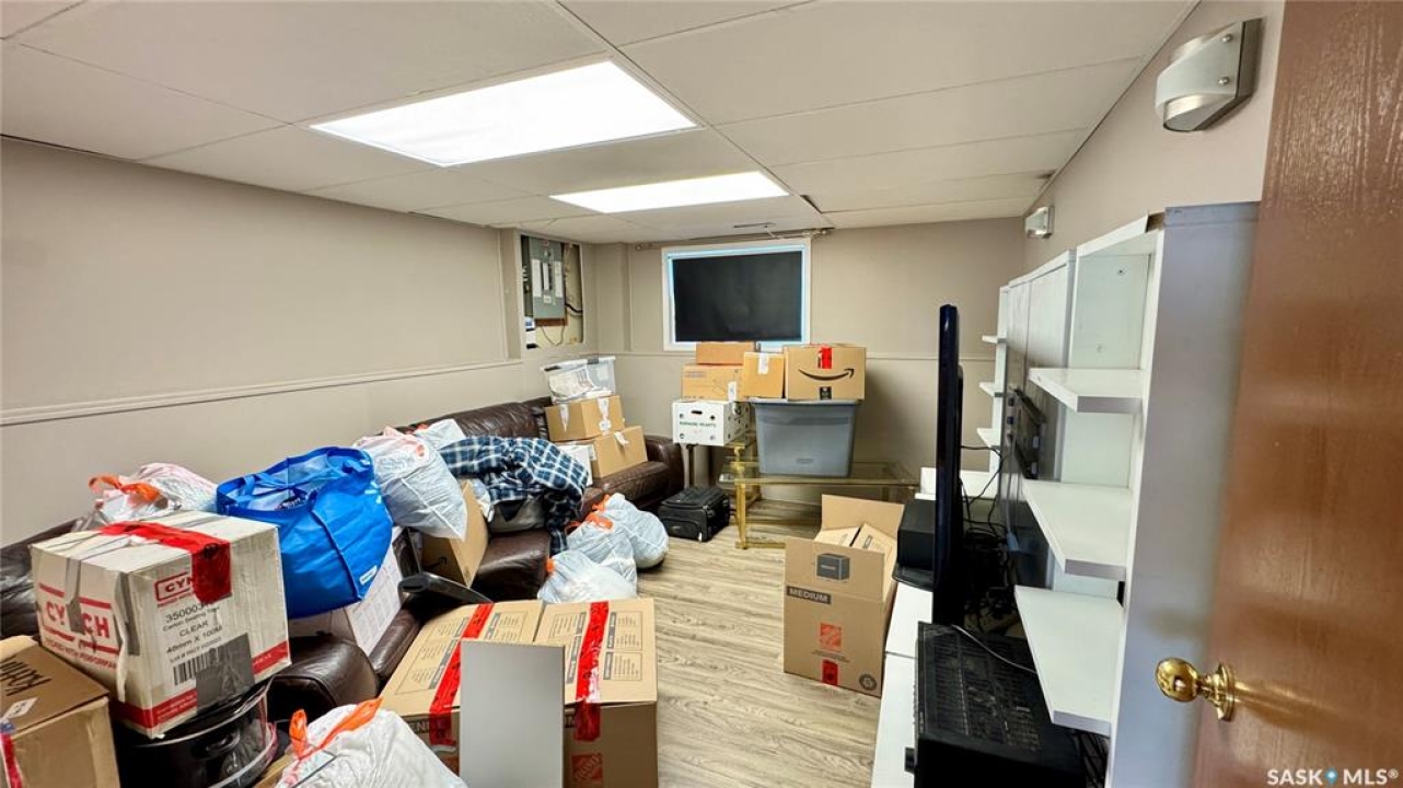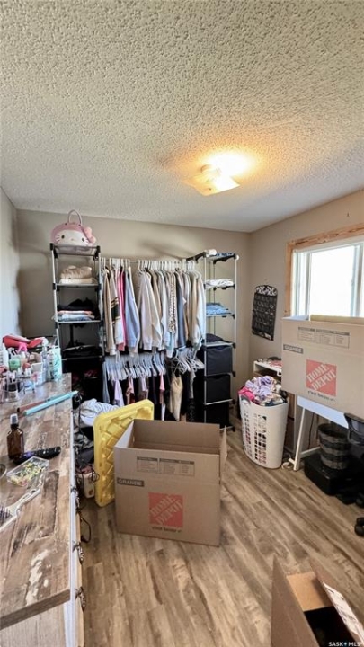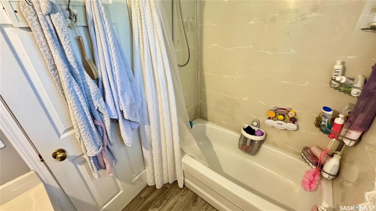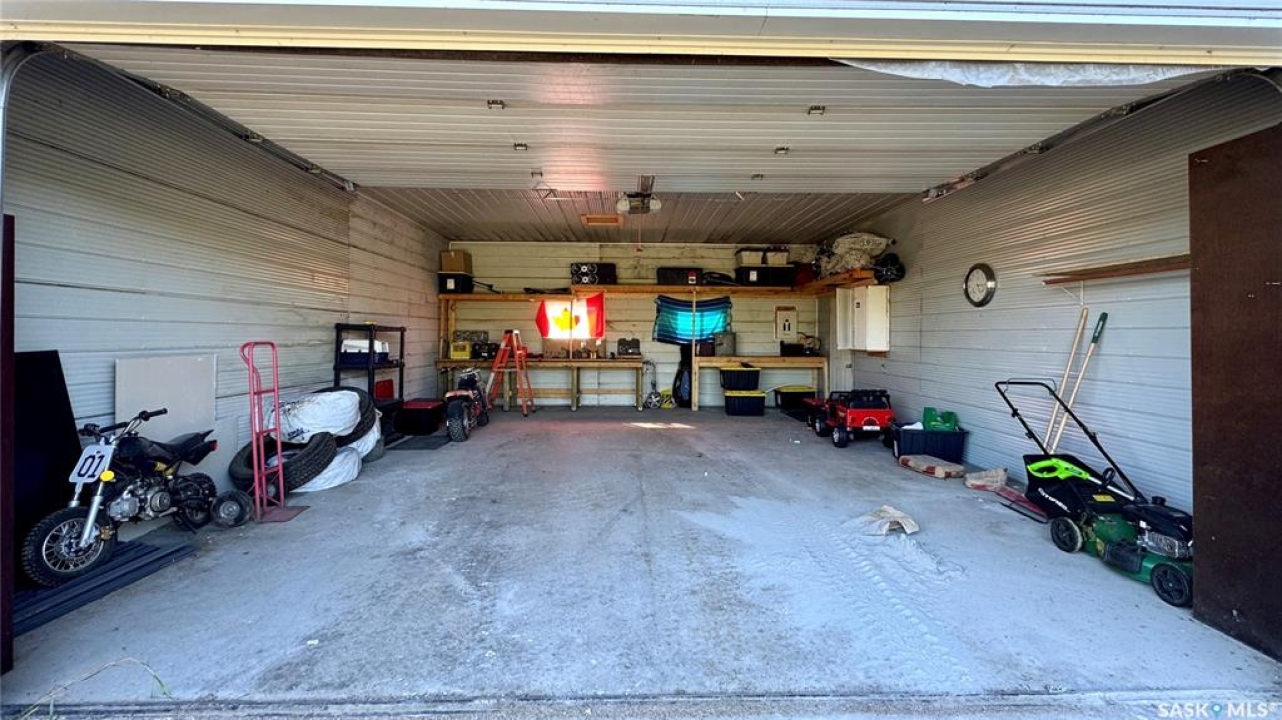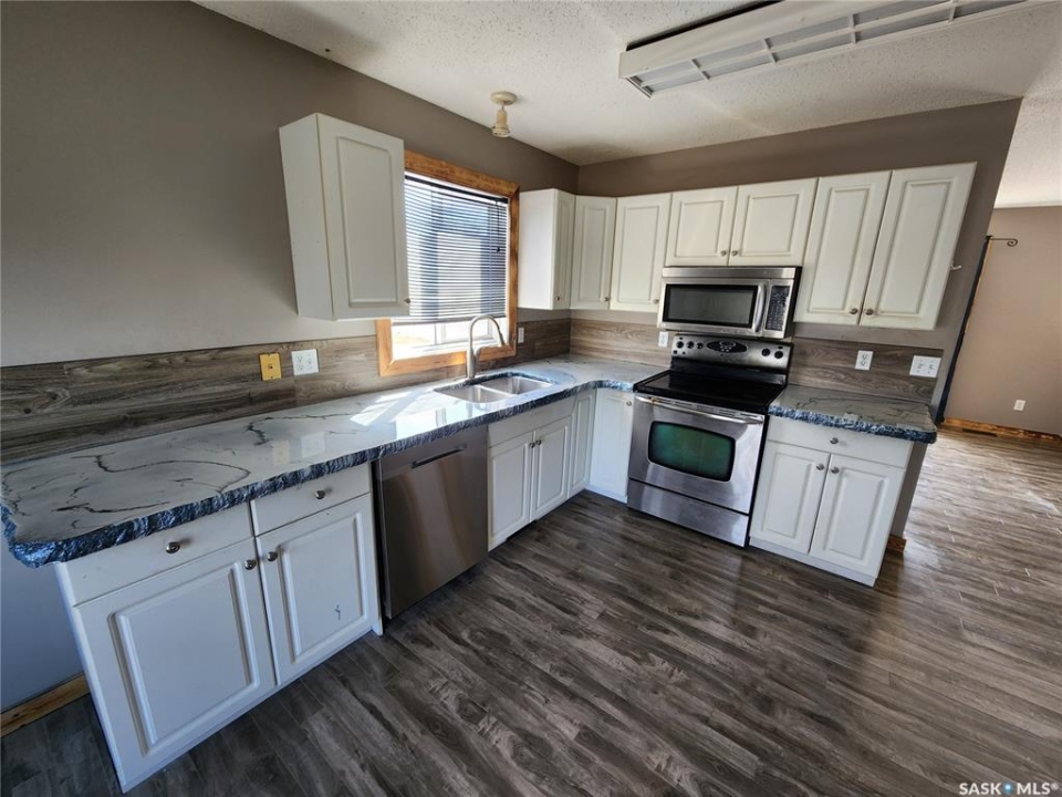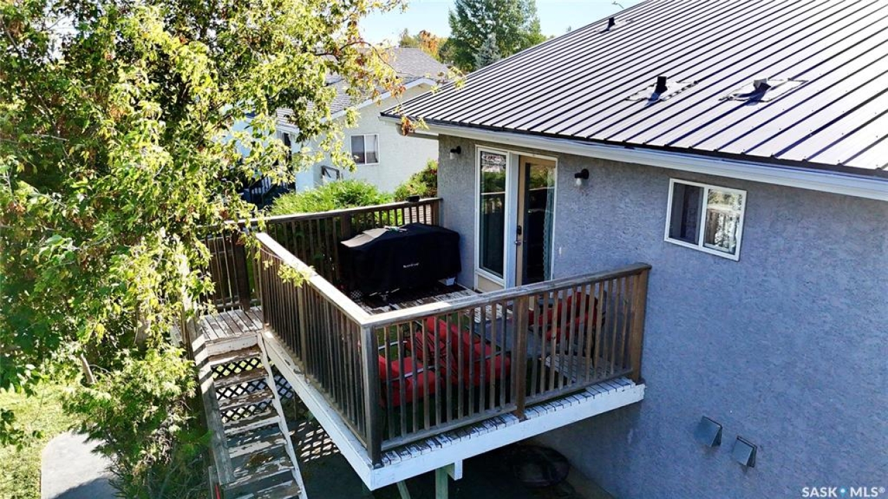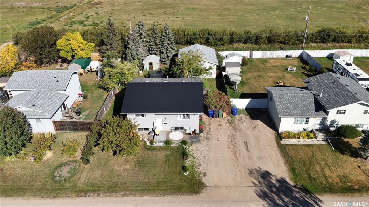 Welcome to 303 4th Street in Dundurn, Saskatchewan. This spacious 984 sq ft bi-level home is located just 30 minutes south of Saskatoon and only five minutes from Blackstrap Provincial Park. Perfect for families, first-time buyers, or anyone looking for more space, this 5-bedroom, 2-bathroom property offers excellent value with room to add instant equity. Set on a 66' x 126' lot, the yard features MATURE TREES, STUCCO SIDING, a METAL ROOF on the house (garage has asphalt shingles), and an OVERSIZED 28' x 24' fully insulated double detached garage. Inside, the bright, functional layout includes a welcoming living room with large SOUTH FACING windows, a kitchen with concrete countertops, white cabinetry, pantry, and stainless steel appliances. The adjacent dining nook opens to the back deck, creating an easy indoor-outdoor flow. Durable laminate flooring is found throughout the home for a clean, modern look. The main floor offers three bedrooms and a full 4-piece bathroom. The fully finished basement adds two more spacious bedrooms, a family room, a 3-piece bathroom, extra storage and laundry/utility space. Recent updates include a washer/dryer, laminate flooring, trim, bathroom fixtures, and the home is equipped with forced-air natural gas heating, an owned furnace, and a gas water heater. Appliances are included, making this home move-in ready. This Dundurn real estate listing backs onto open fields for peaceful prairie views while keeping you close to Saskatoon and Blackstrap Provincial Park. A rare opportunity to enjoy small-town living with modern convenience!