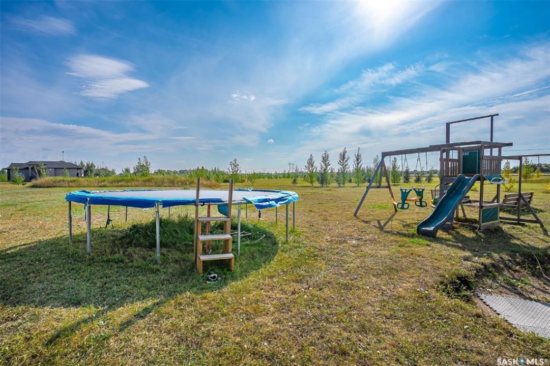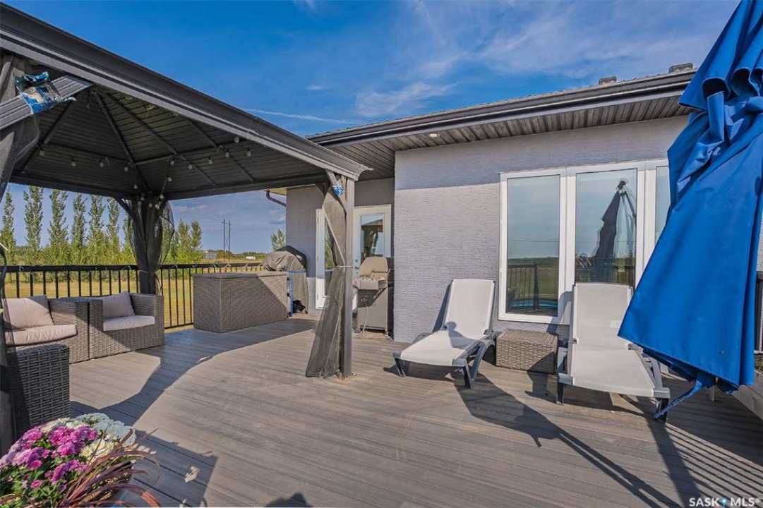 Welcome to this South Country Estates acreage, just 10 minutes south of Saskatoon off HWY 11 in the RM of Dundurn. This 1,348sqft custom bungalow blends modern comfort with country charm. The main floor boasts an open layout with a bright living room, cozy fireplace, and stylish kitchen featuring granite counters, island, and walk-in pantry. The dining area leads to a west-facing deck with gazebo and natural gas hookup—ideal for entertaining. The primary suite includes a walk-in closet and 4-pc ensuite, with two more bedrooms completing the main floor. The basement offers excellent potential, with a family room, games area, 4-pc bath, laundry, den, and 4th bedroom awaiting your finishing touches to the ceiling. A heated 24x26 garage with 8-ft door provides ample storage. Outdoors, enjoy the above-ground pool, play structure, garden beds, and wide-open space. Fibre internet, natural gas, and public water line add convenience, while Clavet School bus pickup is right at the driveway. Perfect for a growing family seeking a peaceful acreage lifestyle with an easy commute to the city.