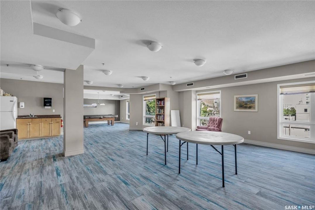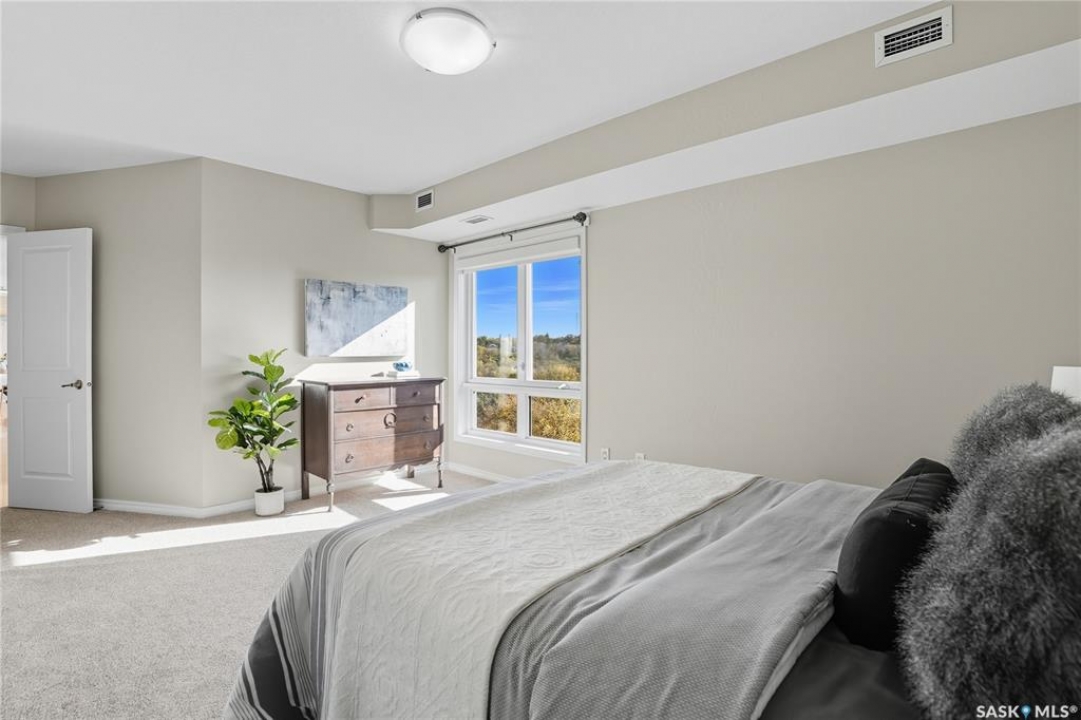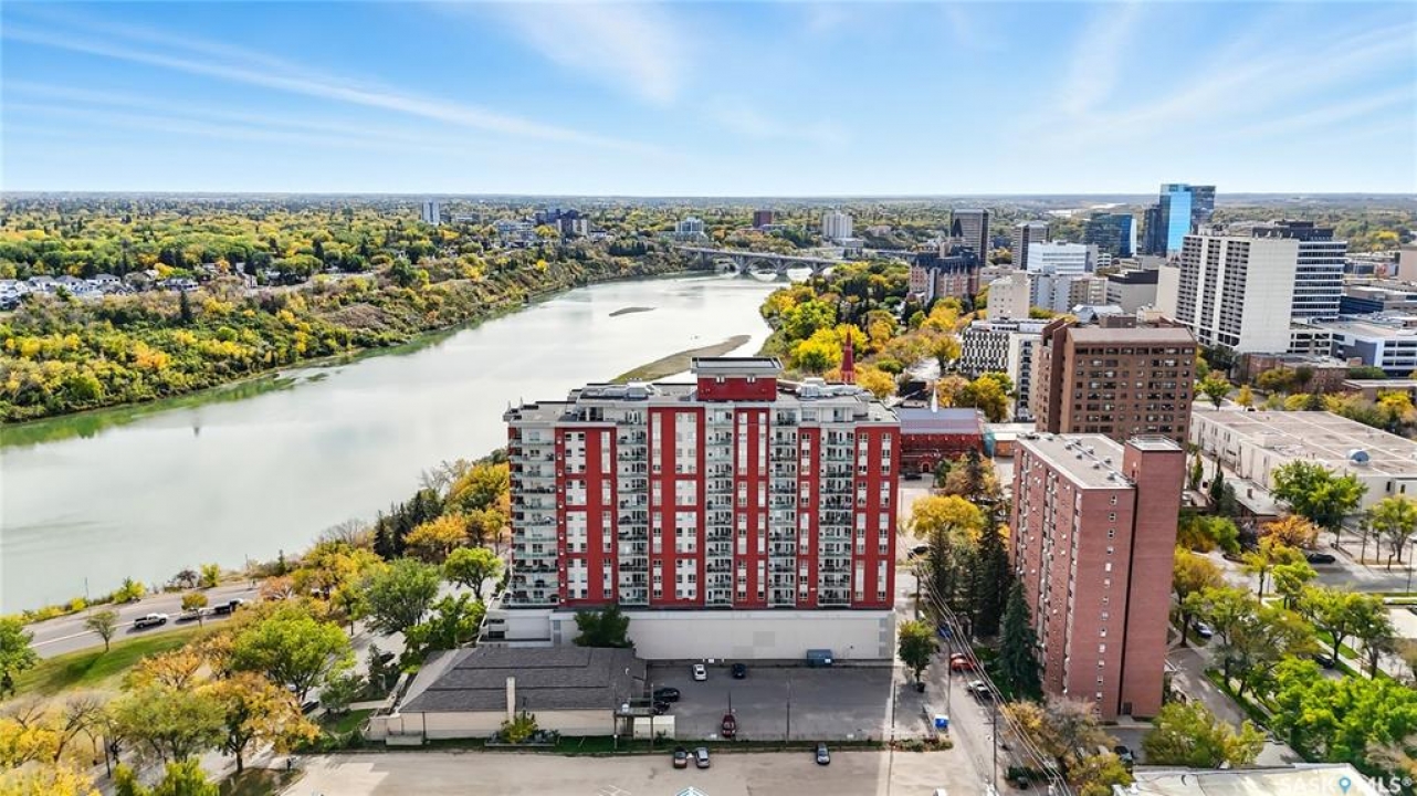 This beautifully maintained downtown condo offers one of the most desirable views in the building, overlooking the scenic river from its south-facing position. Perfectly situated to avoid harsh winds, it sits high enough to offer a stunning perspective above the treetops while remaining closely connected to the vibrant riverbank atmosphere. From your oversized balcony, enjoy a front-row seat to community events like runs, walk-a-thons, and fireworks, and soak in the sounds of live music during the Jazz Festival. Just under 1,200 square feet, the layout includes two spacious bedrooms and two full bathrooms. The bright, open-concept living space is ideal for both everyday comfort and entertaining, anchored by a large kitchen that features granite countertops, a tiled backsplash, and a massive island with additional seating. The adjoining dining area is bright and airy, while the expansive living room benefits from abundant natural light pouring in through the many windows. The generous primary bedroom includes a walk-in closet and a four-piece ensuite, while a second bedroom and additional four-piece bathroom provide ample space for guests or family. The laundry room adds convenience and the independent heating and central air personalized comfort year-round. Step outside your front door and onto the Meewasin River Trail, with direct access to walking and biking paths. Within walking distance of the University of Saskatchewan, Royal University Hospital, City Hospital, and Jim Pattison Children's Hospital. Living downtown means you're surrounded by some of the city's best restaurants, shops, entertainment, and cultural venues—all just steps away. One heated underground parking stall and a heated storage locker are included. Residents also enjoy access to a large amenities room complete with a kitchenette, pool table, lounge area, and a deck with BBQ. Exercise room is included in the condo fees, and for visiting friends or family, guest suites are available to rent.