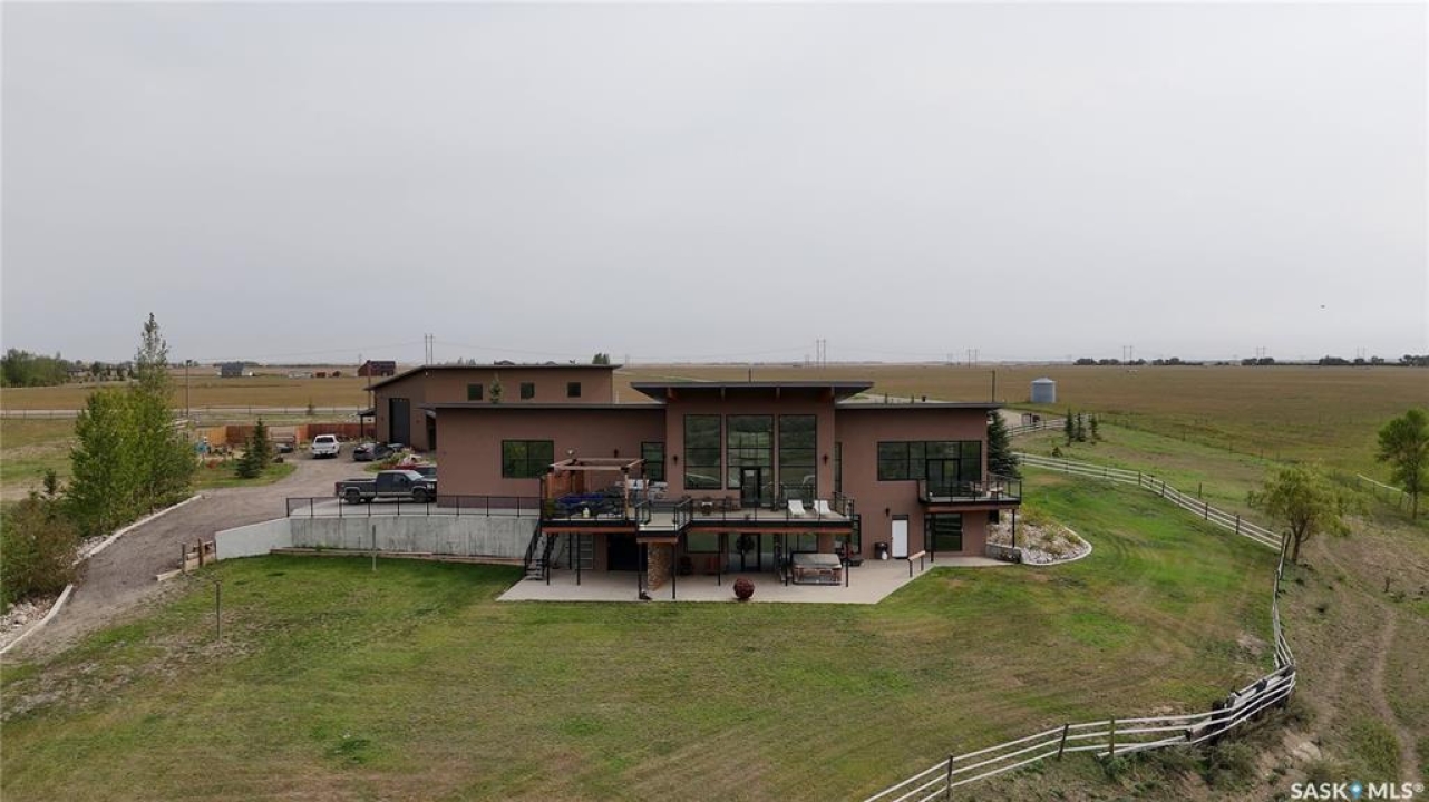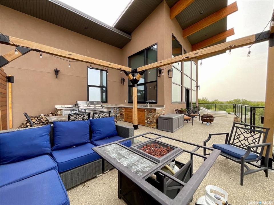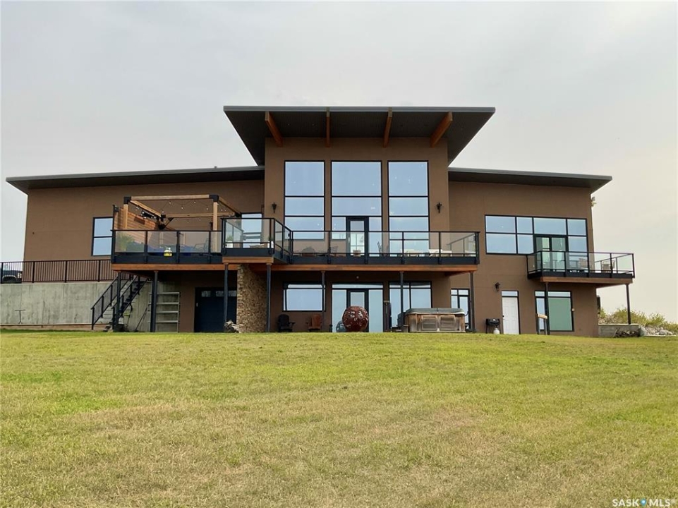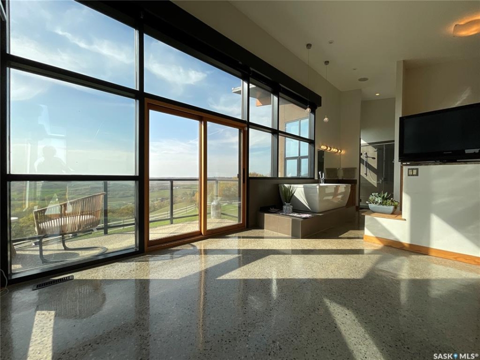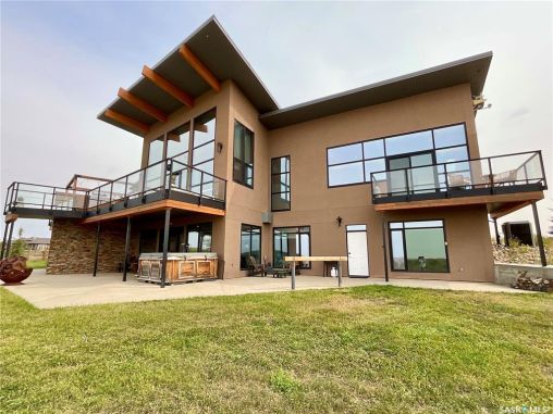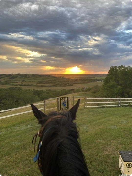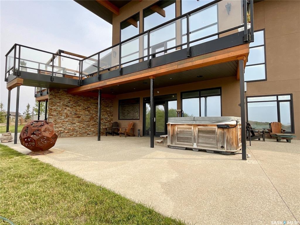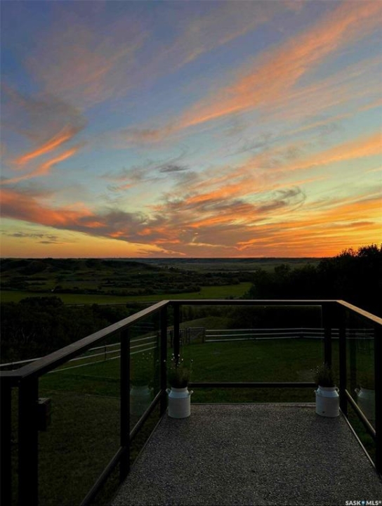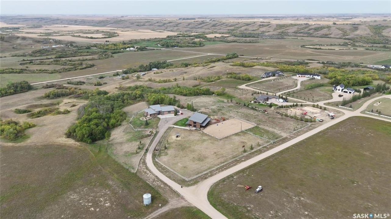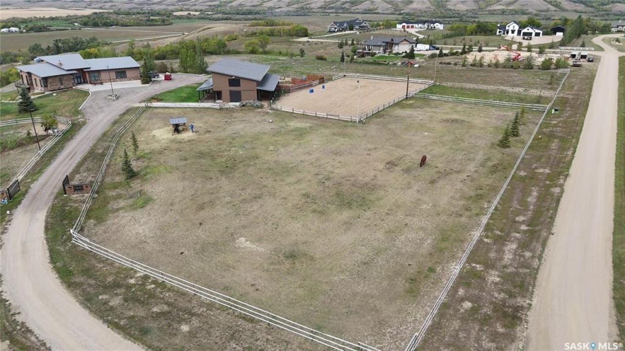 Experience 40 Apollo Drive in the Acreages at Minerva Ridge near Lumsden Sask. From the powered gate and lit lane this 5 bedroom ,5 bath home offers 3982 sq. ft. on the main plus a full walkout level, including a private entrance suite for extended family or caregiver. Floor-to-ceiling curtain wall windows showcase the Wascana and Qu'Appelle valleys. filling the home with light. Built for comfort and efficiency, the home features zoned in-floor hydronic heating, hight-efficiency boiler, gas furnace with A/C backup,sprayfoam insulation, EIFS stucco, triple-pane argon windows, and a 12.6 kw Solar system powering both house and barn-keeping costs near net zero. The kitchen includes a built-in gas cooktop,doublewall oven, drawer microwave, fridge, dishwasher, and butler's pantry with upright freezer and extra fridge. A mudroom with built-ins sits just off the garage. Technology upgrades include RA2 automation for blinds, lights, climate and locks, whole-home audio, five video screens, Ring security, and 8 camera CCTV system and permanent holiday lights. The lower level adds a wet bar, games area, and gym with overhead door for fresh air workouts. Outside, enjoy a covered patio with built -in barbeque,8 person hot tub, and heater. A heated 1,080sq.ft. garage and 35x70 insulated barn/shop provide storage, stalls, tack room, hay loft, and heated workshop. Equine features include a outdoor lit riding arena, two fenced pastures with solar fencing and automatic water systems. Extras include a reinforced secure room,200-amp service, water softener and custom cold storage. Lumsden's schools and amenities are minutes away, with Regina only a 15 minute drive. Purchasers also have first right of refusal on the adjoining 3 Acre parcel