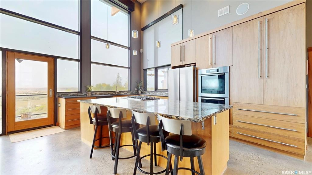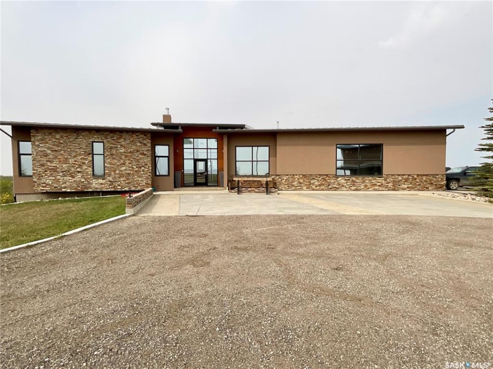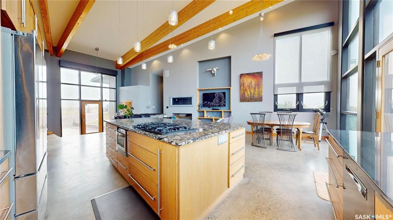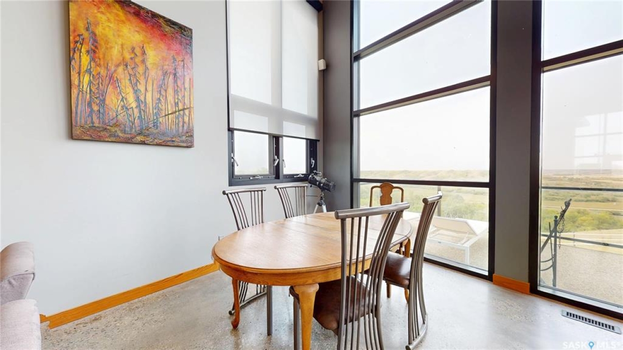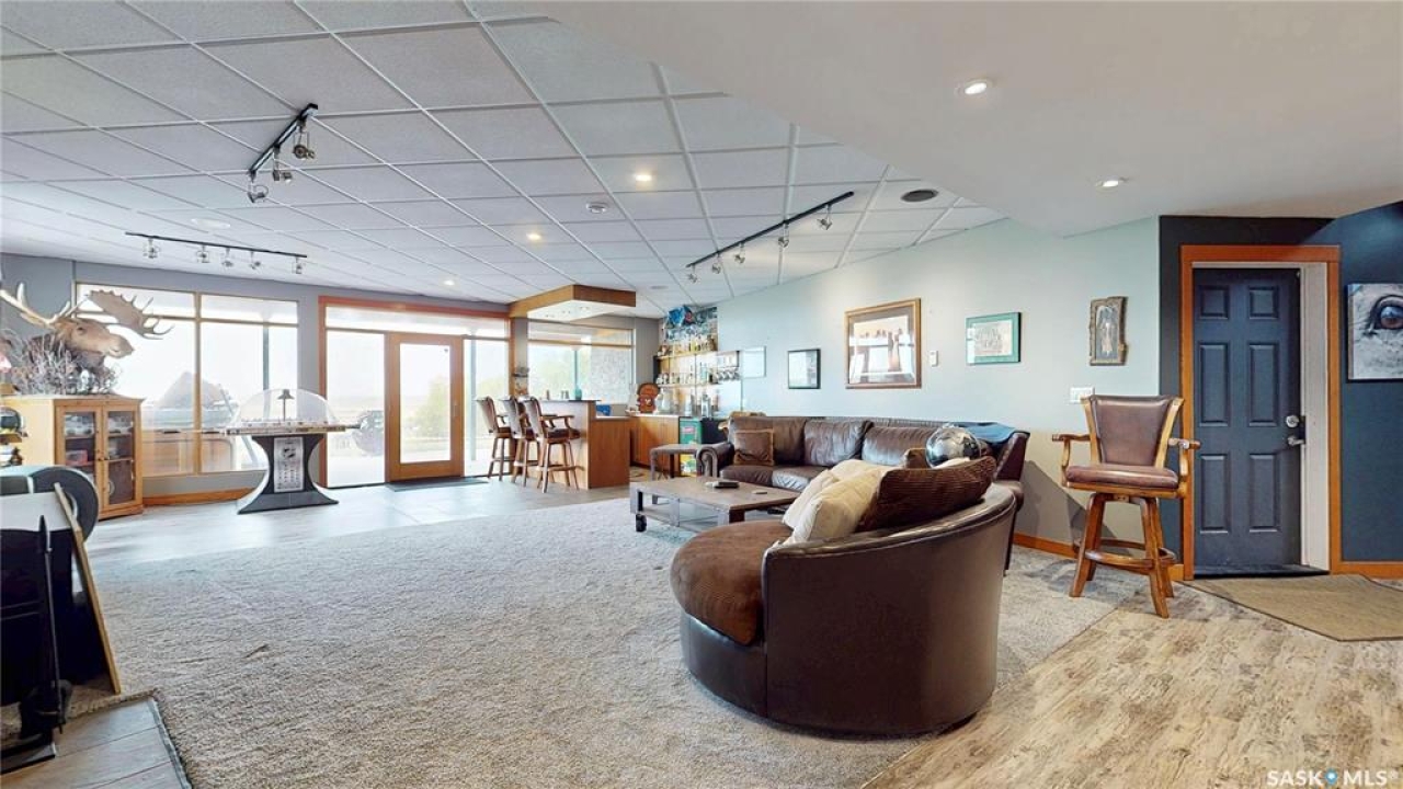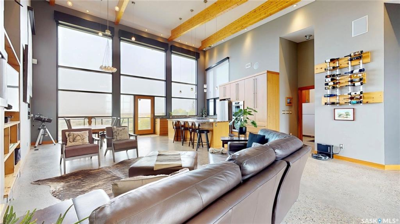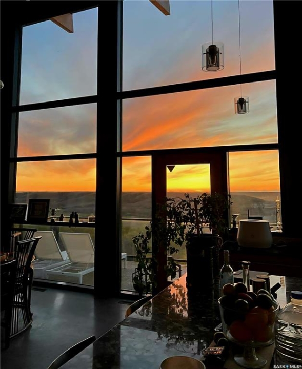 Experience 40 Apollo Drive in the Acreages at Minerva Ridge near Lumsden Sask. From the powered gate and lit lane this 5 bedroom ,5 bath home offers 3982 sq. ft. on the main plus a full walkout level, including a private entrance suite for extended family or caregiver. Floor-to-ceiling curtain wall windows showcase the Wascana and Qu'Appelle valleys. filling the home with light. Built for comfort and efficiency, the home features zoned in-floor hydronic heating, hight-efficiency boiler, gas furnace with A/C backup,sprayfoam insulation, EIFS stucco, triple-pane argon windows, and a 12.6 kw Solar system powering both house and barn-keeping costs near net zero. The kitchen includes a built-in gas cooktop,doublewall oven, drawer microwave, fridge, dishwasher, and butler's pantry with upright freezer and extra fridge. A mudroom with built-ins sits just off the garage. Technology upgrades include RA2 automation for blinds, lights, climate and locks, whole-home audio, five video screens, Ring security, and 8 camera CCTV system and permanent holiday lights. The lower level adds a wet bar, games area, and gym with overhead door for fresh air workouts. Outside, enjoy a covered patio with built -in barbeque,8 person hot tub, and heater. A heated 1,080sq.ft. garage and 35x70 insulated barn/shop provide storage, stalls, tack room, hay loft, and heated workshop. Equine features include a outdoor lit riding arena, two fenced pastures with solar fencing and automatic water systems. Extras include a reinforced secure room,200-amp service, water softener and custom cold storage. Lumsden's schools and amenities are minutes away, with Regina only a 15 minute drive. Purchasers also have first right of refusal on the adjoining 3 Acre parcel