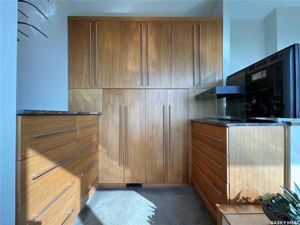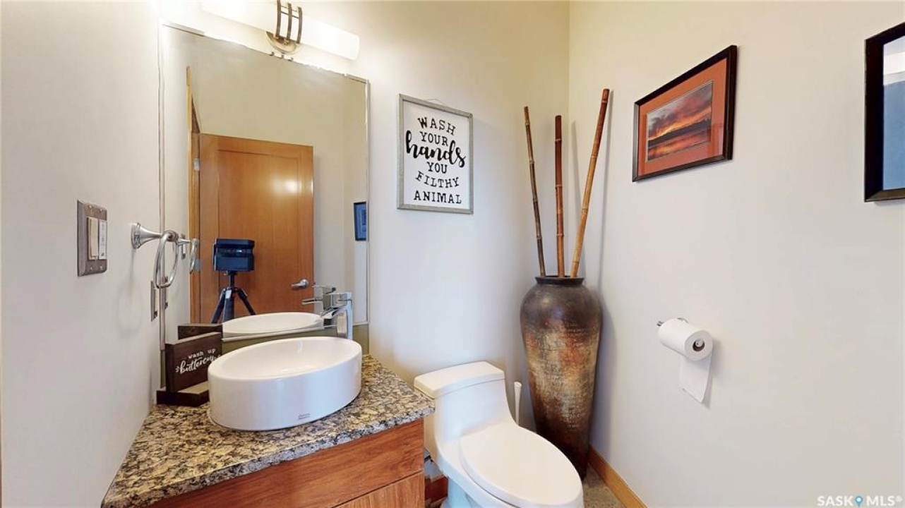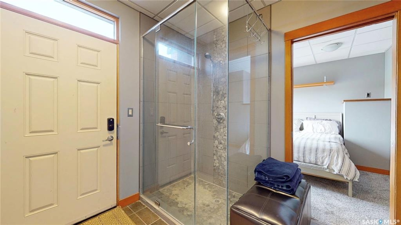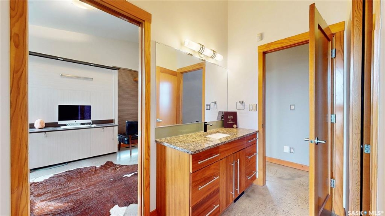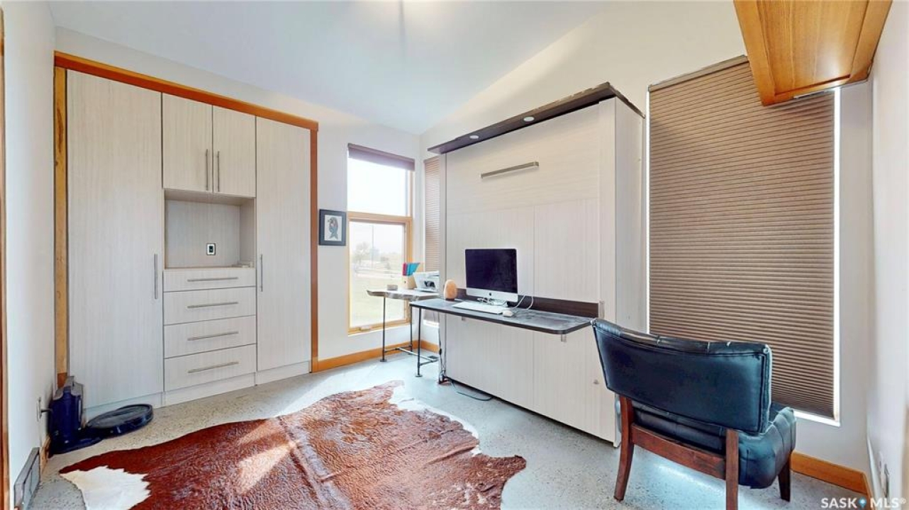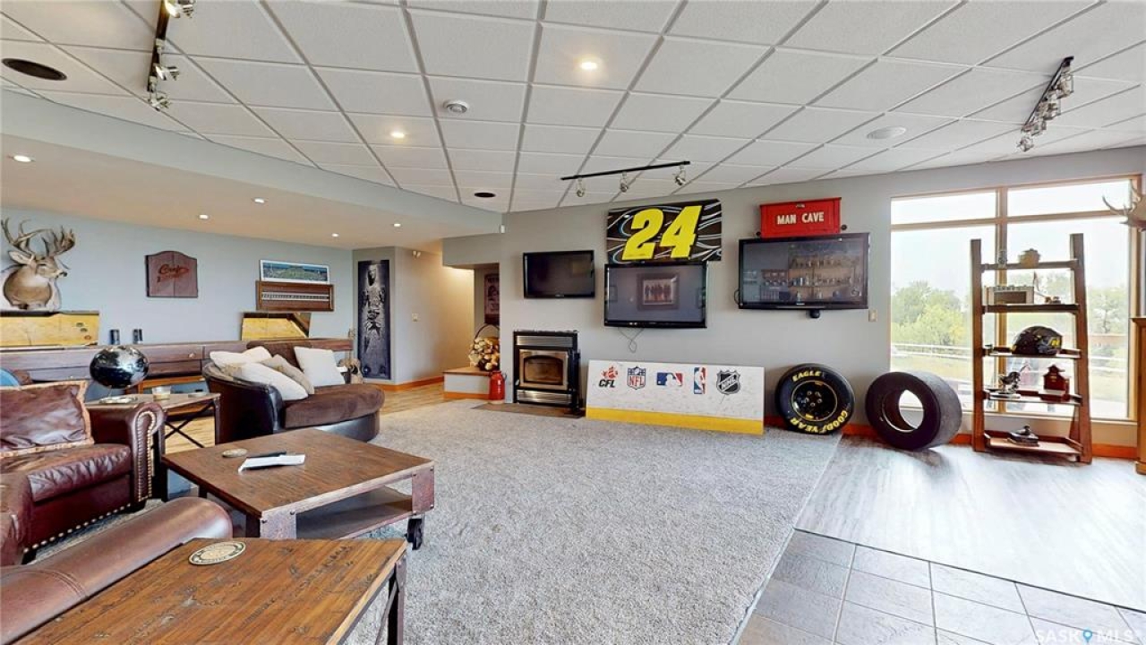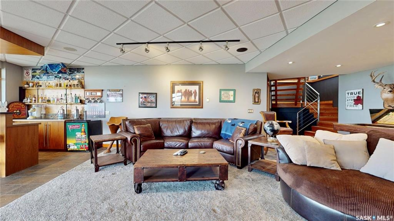 Experience 40 Apollo Drive in the Acreages at Minerva Ridge near Lumsden Sask. From the powered gate and lit lane this 5 bedroom ,5 bath home offers 3982 sq. ft. on the main plus a full walkout level, including a private entrance suite for extended family or caregiver. Floor-to-ceiling curtain wall windows showcase the Wascana and Qu'Appelle valleys. filling the home with light. Built for comfort and efficiency, the home features zoned in-floor hydronic heating, hight-efficiency boiler, gas furnace with A/C backup,sprayfoam insulation, EIFS stucco, triple-pane argon windows, and a 12.6 kw Solar system powering both house and barn-keeping costs near net zero. The kitchen includes a built-in gas cooktop,doublewall oven, drawer microwave, fridge, dishwasher, and butler's pantry with upright freezer and extra fridge. A mudroom with built-ins sits just off the garage. Technology upgrades include RA2 automation for blinds, lights, climate and locks, whole-home audio, five video screens, Ring security, and 8 camera CCTV system and permanent holiday lights. The lower level adds a wet bar, games area, and gym with overhead door for fresh air workouts. Outside, enjoy a covered patio with built -in barbeque,8 person hot tub, and heater. A heated 1,080sq.ft. garage and 35x70 insulated barn/shop provide storage, stalls, tack room, hay loft, and heated workshop. Equine features include a outdoor lit riding arena, two fenced pastures with solar fencing and automatic water systems. Extras include a reinforced secure room,200-amp service, water softener and custom cold storage. Lumsden's schools and amenities are minutes away, with Regina only a 15 minute drive. Purchasers also have first right of refusal on the adjoining 3 Acre parcel