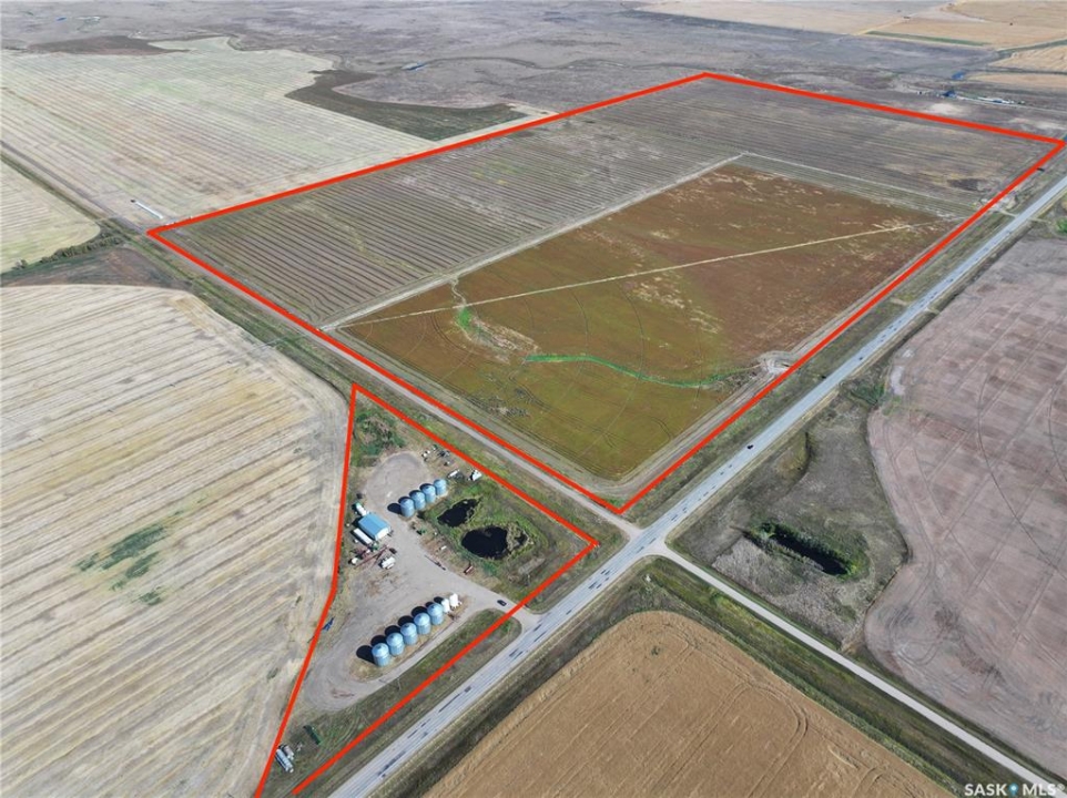 Great opportunity to expand your irrigated land base with a shop and added storage. Located just 3 miles East of Broderick along Highway 15. 1.5 1/4s of land with new pivots in 2025. More irrigated land available to purchase in the area.