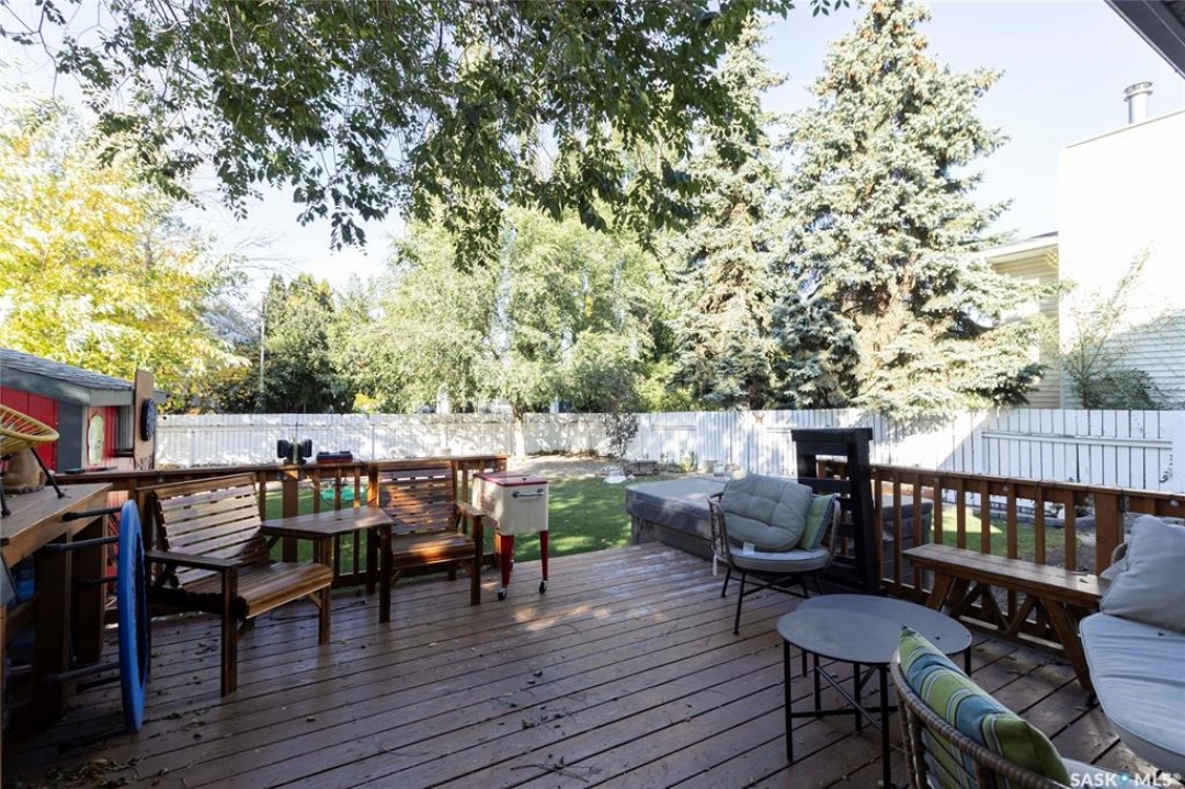 Outdoor: Deck, Fenced, Garden Area, Lawn Back, Lawn Front, Trees/shrubs