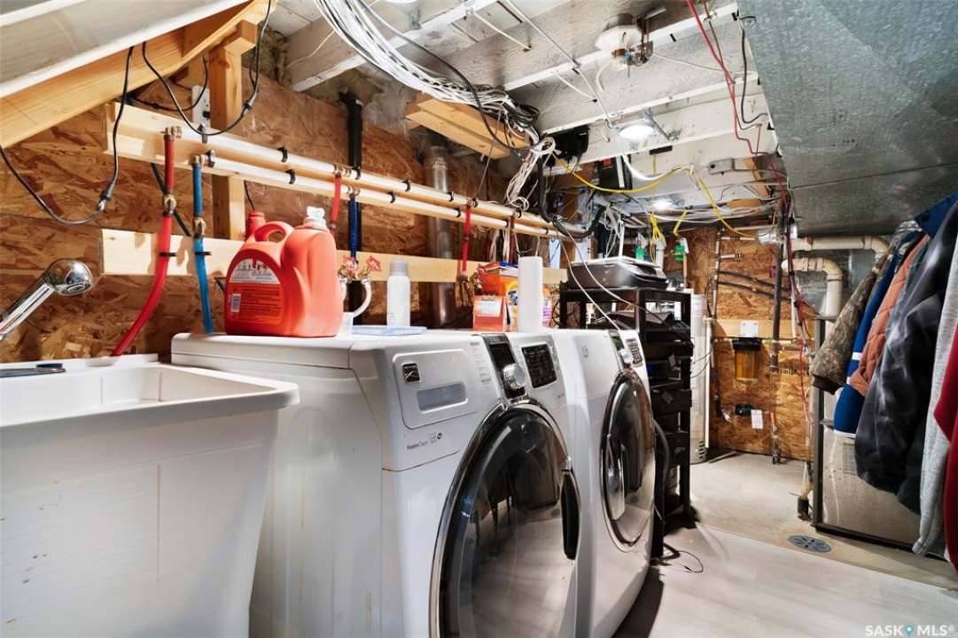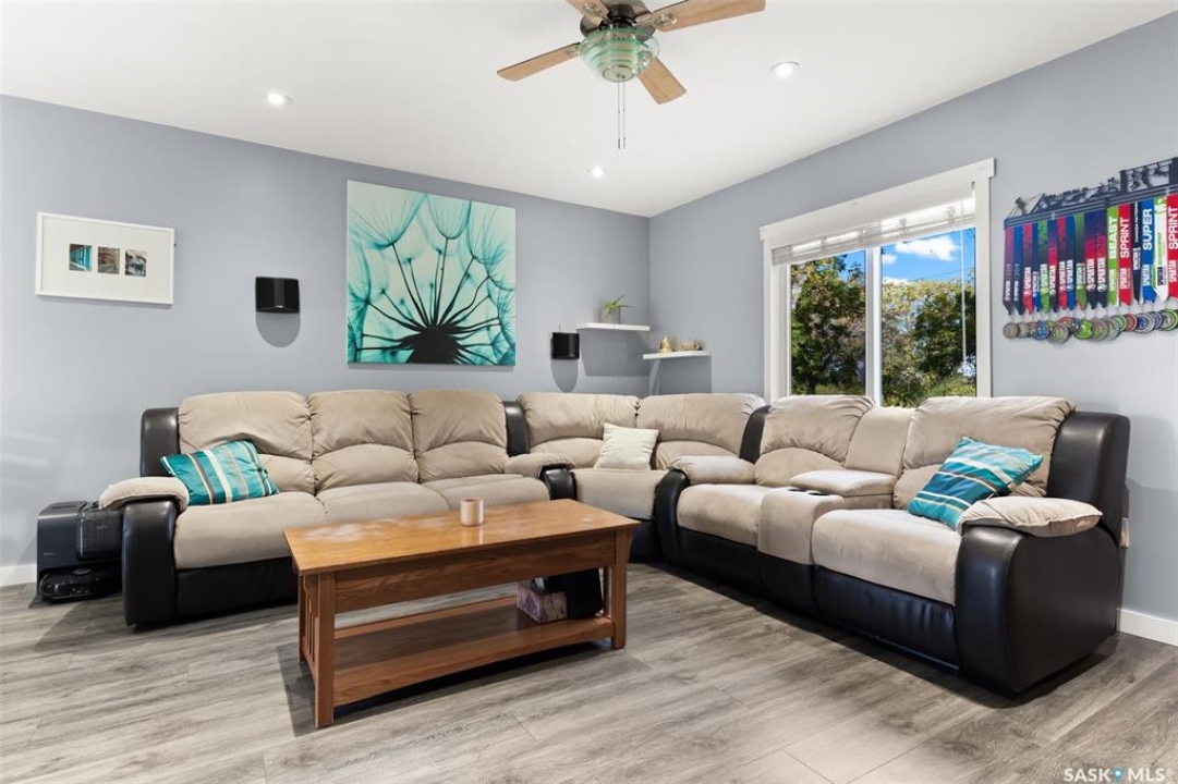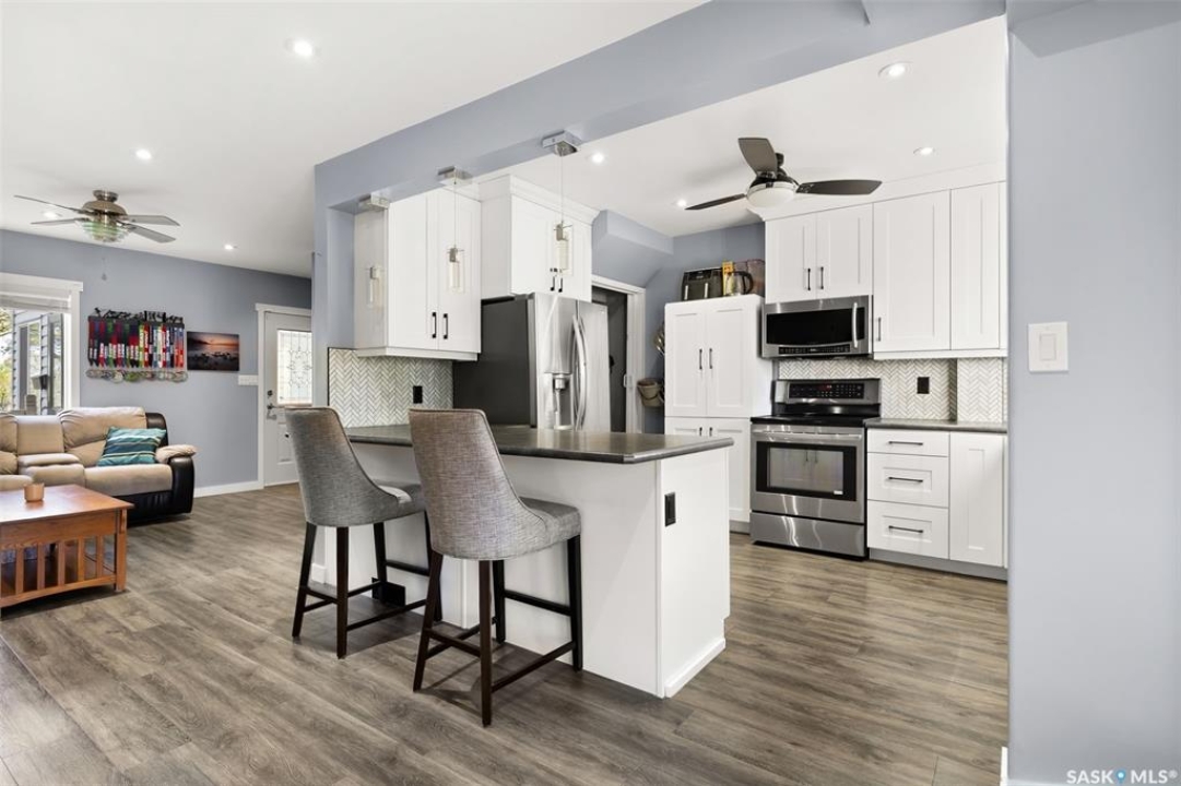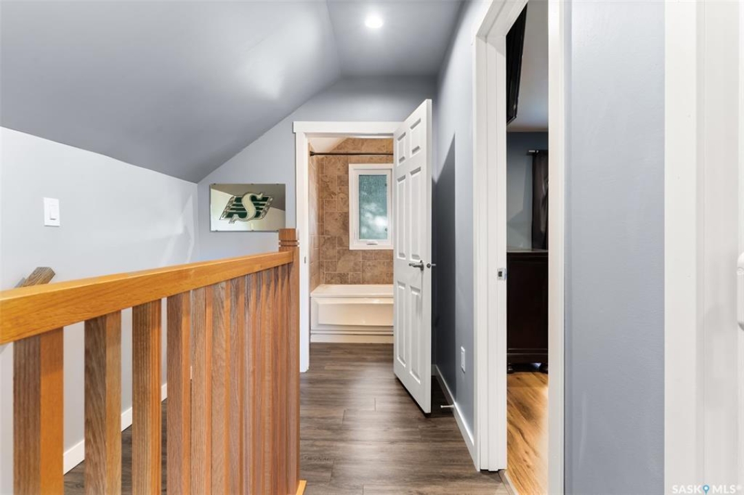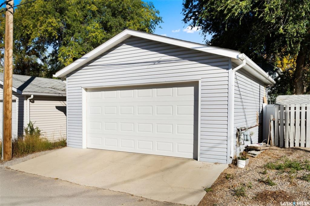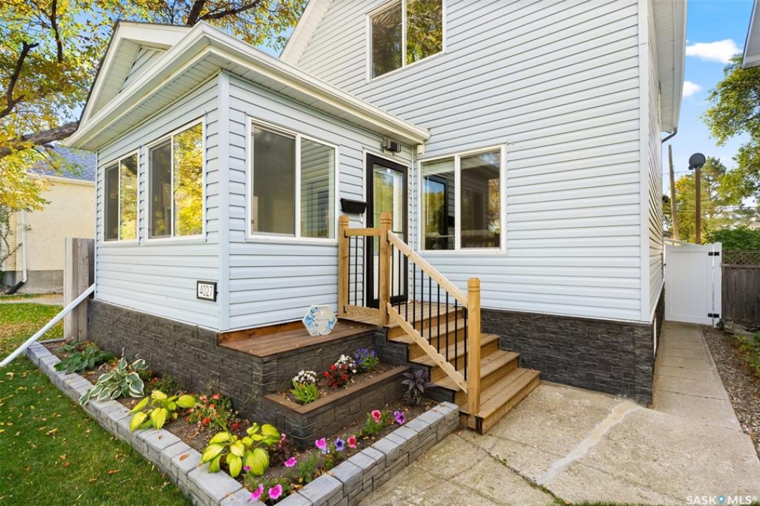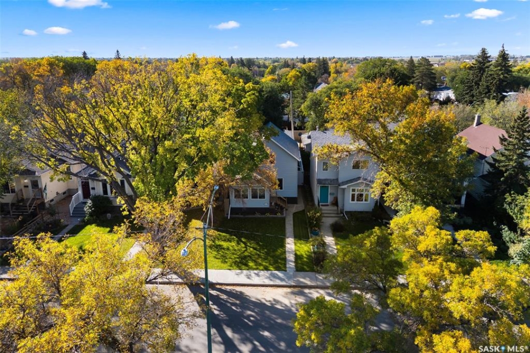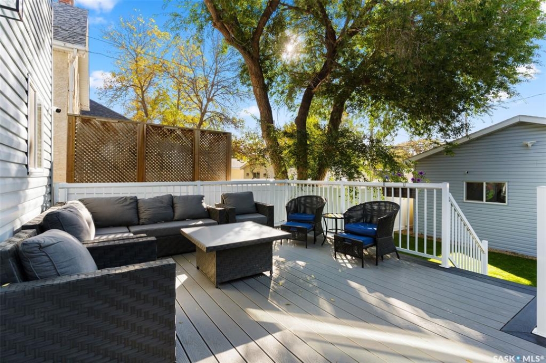 Nestled in the heart of the Historic Cathedral neighbourhood and perfectly positioned across from a lush green space, this charming and thoughtfully updated home blends character with modern convenience. Step into the bright, recently remodeled sunroom that faces the park—wired for electricity and built on screw piles—offering a cozy retreat with a view. The peninsula kitchen is a standout, featuring newer cupboards, crisp white cabinetry, a stylish herringbone tile backsplash, stainless steel appliances including a fridge with ice and water, and elegant pendant lighting. Throughout the home, you'll find all new fixtures, pot lights, fresh trims, and newer PVC windows that flood the space with natural light. Built-in speakers enhance the kitchen, dining area, and both upstairs bedrooms. The upper level hosts a spacious principal bedroom with a walk-in closet, a second bedroom, and a beautifully updated four-piece bath complete with a deep soaker tub and tile surround. Downstairs, the newly poured concrete slab is complemented by reinforced walls, and spray foam insulation throughout. The basement also features a new 100 amp panel with ample capacity, a laundry area, a cozy space ideal for a TV room, and a convenient two-piece bathroom. Outside, enjoy the expansive 14 x 20 composite deck with aluminum railing, a unique garden shed on the east side, and underground sprinklers in the backyard. The 22 x 26 heated and insulated garage, built in 2008 and finished with OSB, adds even more value, along with newer shingles on the house for peace of mind. This fine property is close to parks, bus routes, Mosaic Stadium and all Downtown amenities. Call your Relator for more information or personal tour.