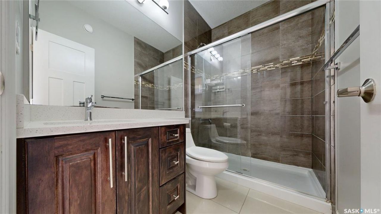 Welcome to your dream home! an elegant family home located in the vibrant Harbour Landing neighborhood. 2017 built, 2379 square foot, 5 bedroom 4 bathroom, 2 story house sits on a 40 x 115 rectangular lot. The front yard has a double concrete driveway that leads to the 24 x 24 heated and insulated double attached garage. The fully fenced backyard features a spacious deck, lush lawn, raised garden boxes, and a versatile patio area. Ideal for outdoor dining, entertaining, or evenings around a firepit. Upon entering, you are welcomed by a grand foyer embellished with an elegant chandelier, a coat closet, bench space, and convenient direct access to the garage. The main floor features a flexible first bedroom and a 4-piece bathroom, ideal for guests or as a home office. The heart of the home is the warm and inviting living room, accentuated by a striking brick feature wall, a cozy gas fireplace, and gleaming hardwood flooring. The adjoining kitchen includes an island with bar seating, a corner pantry, a modern tile backsplash, ample cupboard and drawer space, and sleek stainless steel appliances. The kitchen seamlessly transitions into the bright dining area, where three large windows frame serene views of the backyard, creating an ideal setting for family meals. On the upper level, the first stop is the 3-piece bathroom featuring a rainfall shower head, followed by a generously sized bedroom complete with its own closet. The luxurious primary suite offers a walk-in closet with built-in shelving and drawers, along with a spa-inspired 5-piece ensuite bathroom that includes a deep soaker tub, dual vanity, a spacious glass shower with a rainfall showerhead and storage space. A unique windowed nook within the primary bedroom provides a tranquil corner for reading or relaxation. The fully finished basement is designed as a private secondary suite with its own separate side entrance, making it perfect for multi-generational living or generating rental income.