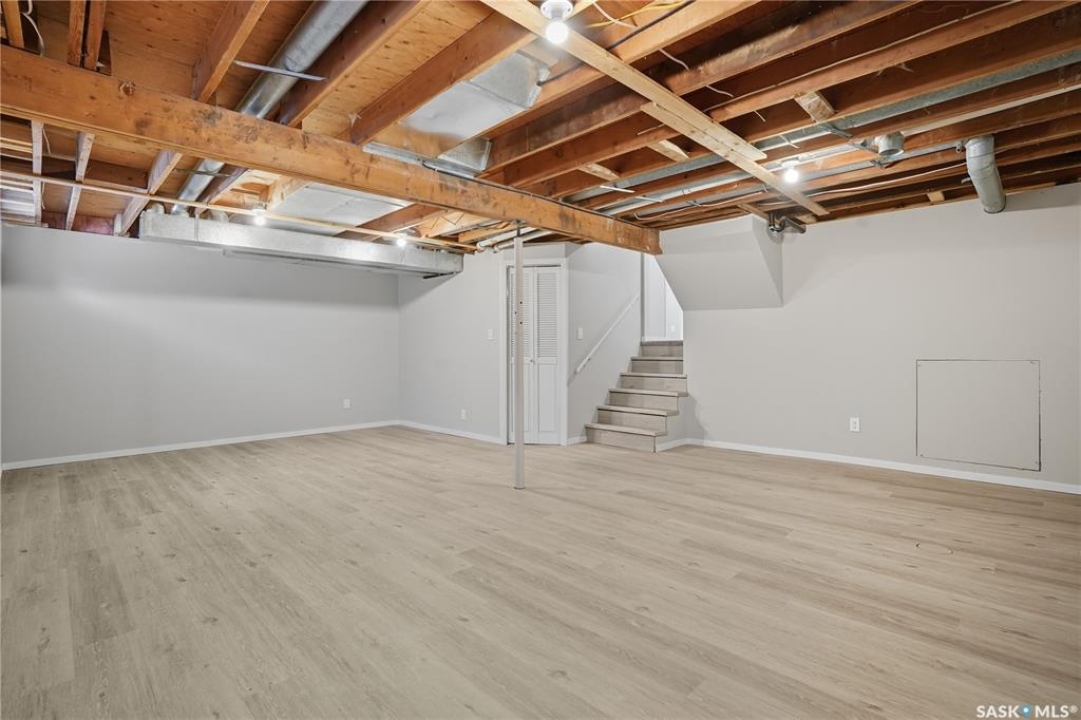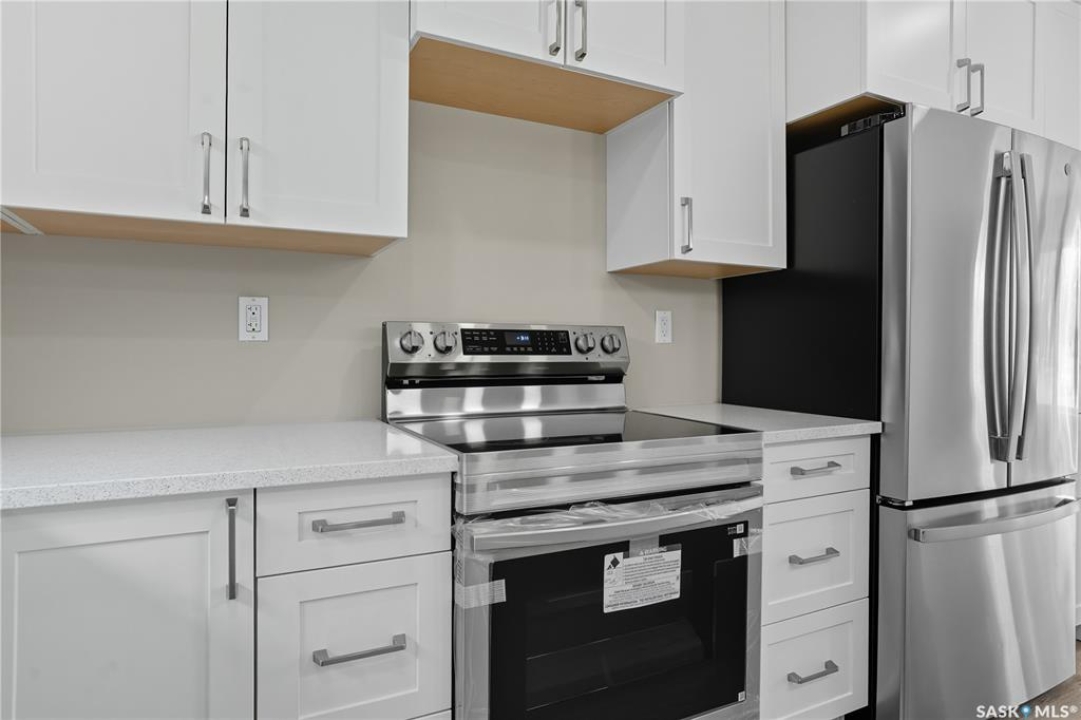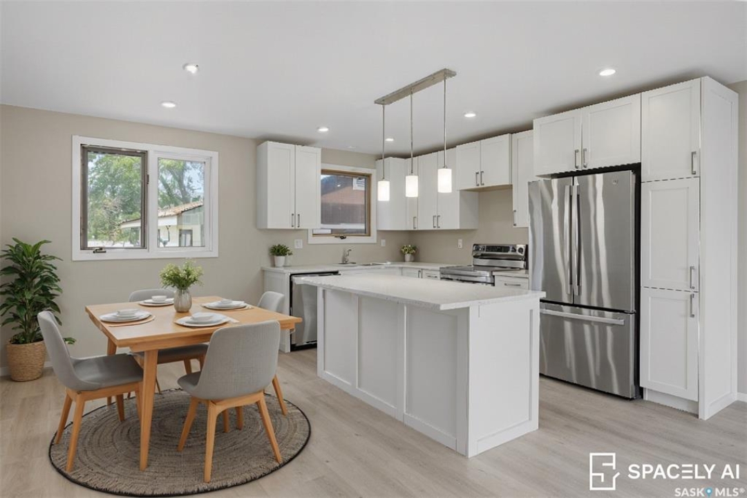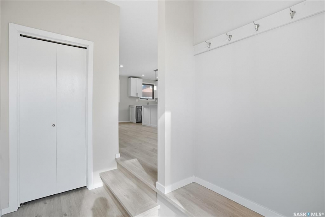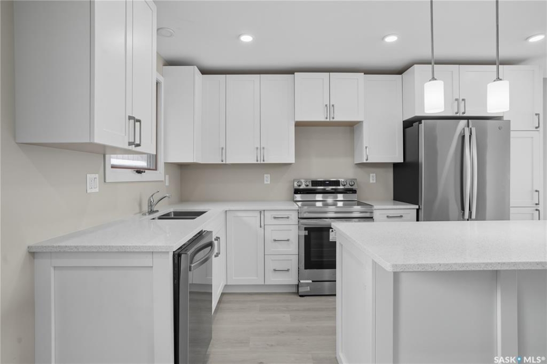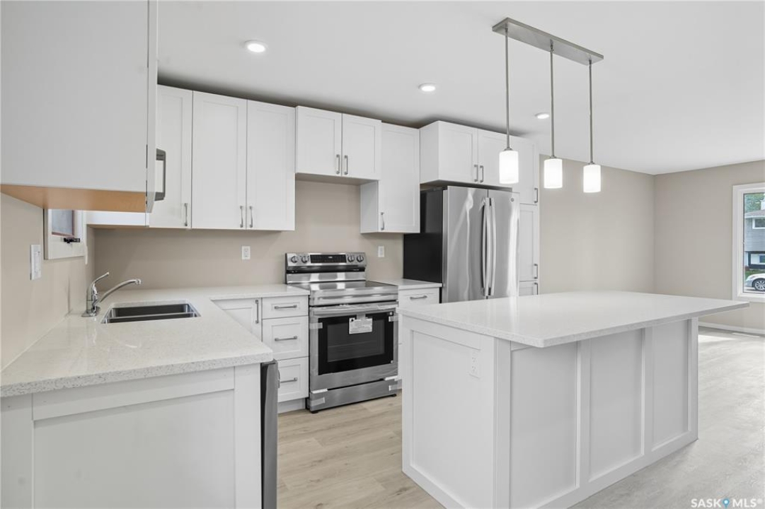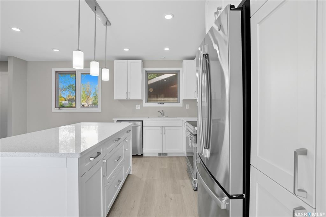 Welcome to this completely renovated 1,300 sq. ft. four-level split in Uplands, offering modern finishes, thoughtful design, and a prime location backing green space. The main floor features an inviting front foyer leading to a spacious living room with a bright bay window. The open-concept layout showcases stunning vinyl plank flooring throughout, with a beautifully updated kitchen at the heart of the home. Here you'll find a large island, white cabinetry with soft-close doors and drawers, quartz countertops, stainless steel appliances, and a pantry beside the fridge. The sink overlooks the backyard, while the dining area sits just off the kitchen, making it ideal for entertaining. Convenient main-floor laundry and direct yard access complete this level. Upstairs, the second level offers plush new carpeting, two comfortable bedrooms, and a stylish 4-piece bathroom with a tiled tub surround. The third level includes two more bedrooms with matching carpet and a convenient 2-piece bathroom. On the fourth level, you'll find the mechanical room and a spacious rec room perfect for family movie nights or a play area. Outside, the fully fenced backyard backs onto green space, offering extra privacy and room to enjoy. A single detached garage provides secure parking and additional storage. This move-in ready home combines modern updates with a functional family layout—all in a welcoming neighbourhood close to schools, parks, and amenities.