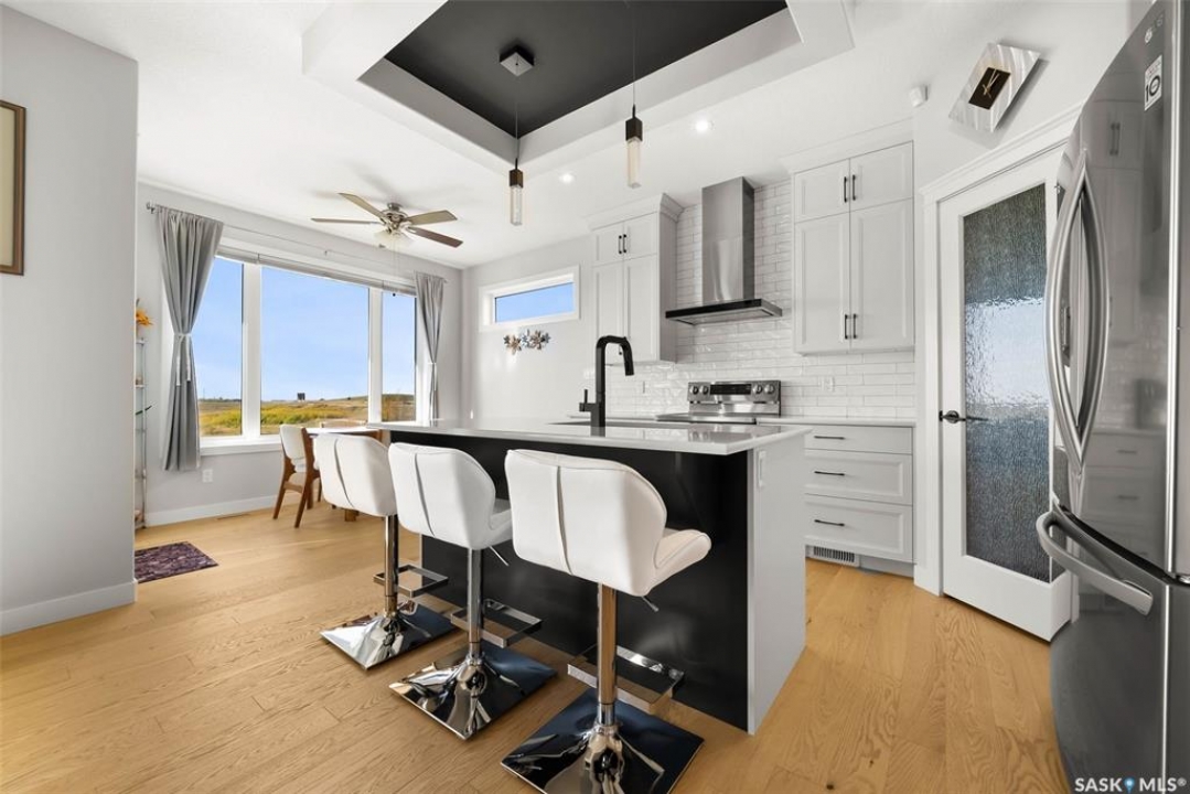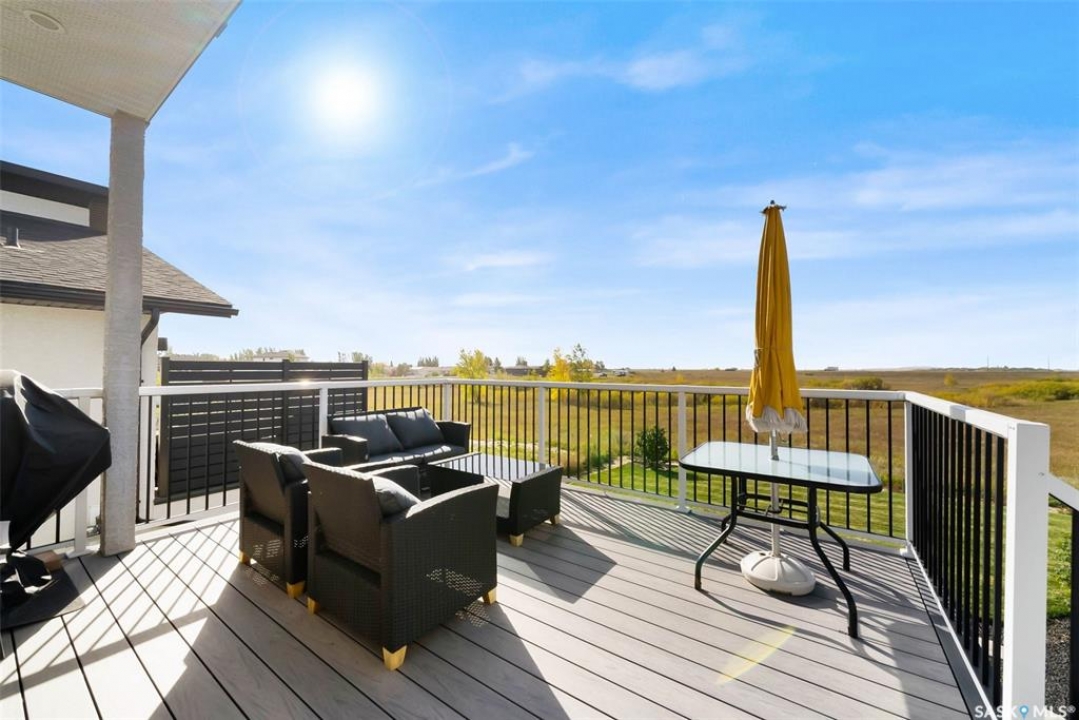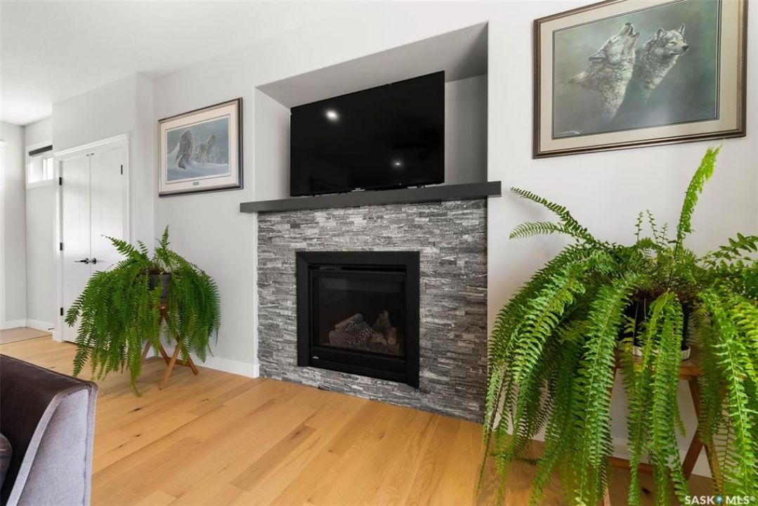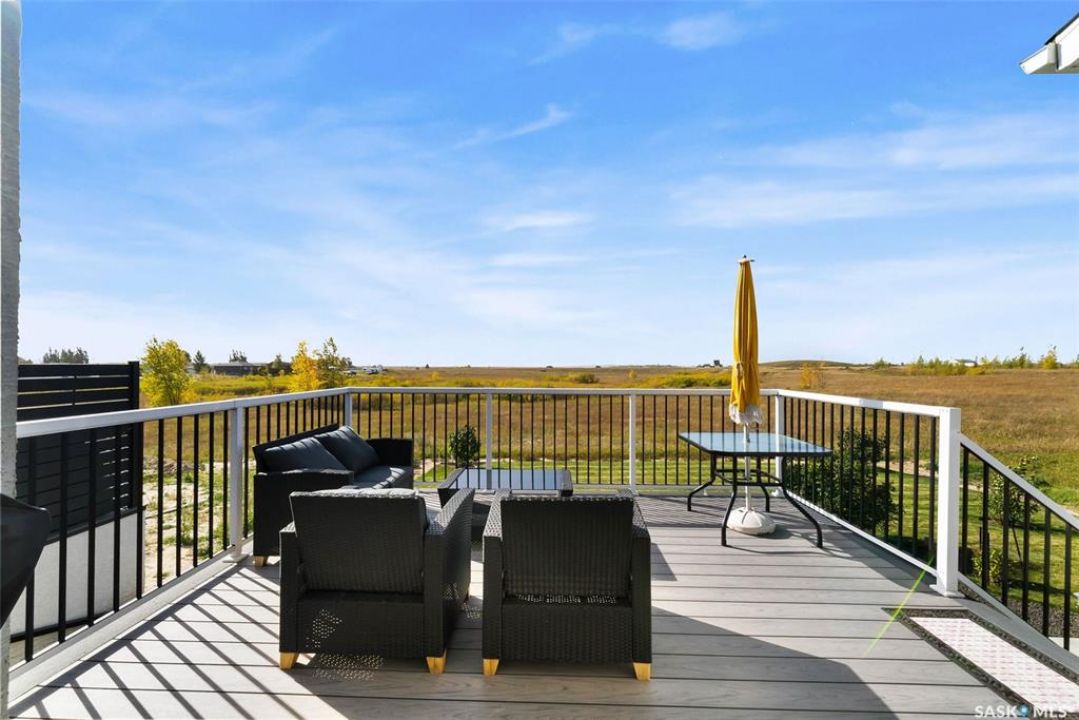 Welcome to 408 Hillside Drive in Pilot Butte! Built in 2020, this impressive 2-storey home offers over 1,700 sq. ft. of thoughtfully designed living space plus a triple attached garage. With modern finishes, premium upgrades, and a prairie backdrop, it's the perfect blend of style, comfort, and functionality. The main floor showcases an open-concept layout with engineered hardwood flooring and 2x6 construction on 16” centers. A bright living room centers around a remote-controlled gas fireplace with stone surround, while oversized windows fitted with Hunter Douglas top-down/bottom-up blinds capture expansive views. The chef's kitchen boasts quartz countertops, custom cabinetry with under-cabinet lighting, subway tile backsplash, stainless steel appliances including a granite sink, a large island, and walk-in pantry. The dining area opens onto a spacious deck, ideal for entertaining, while a powder room and mudroom with laundry complete this level. Upstairs, the primary suite impresses with 10' ceilings, a walk-in closet, and spa-inspired ensuite with dual sinks and custom tiled shower. Two additional bedrooms, a full bath, and a bonus room with balcony access offer versatility for family living. The basement is open for development, with exterior walls spray-foamed and drywalled—ready for your personal touch. Notable upgrades include a whole-home water filtration system, surge protection, central A/C, on-demand hot water, and hot/cold water taps in the garage. Curb appeal shines with a fully insulated triple garage, exposed aggregate driveway, and beautifully landscaped yard. The backyard retreat features underground sprinklers, raised garden beds, lush lawn, a composite deck, and tiled patio backing green space—perfect for enjoying Saskatchewan sunsets. This home combines quality construction, thoughtful upgrades, and an unbeatable Pilot Butte location. Truly move-in ready for its next proud owner.