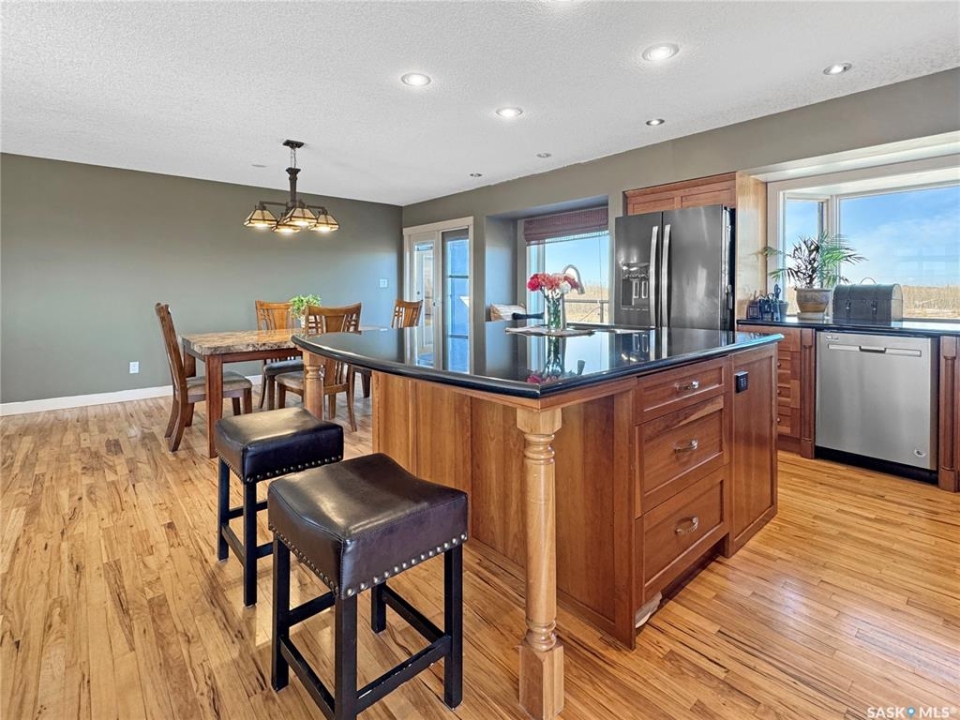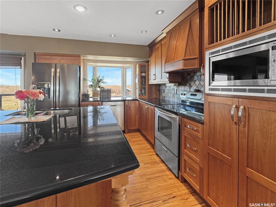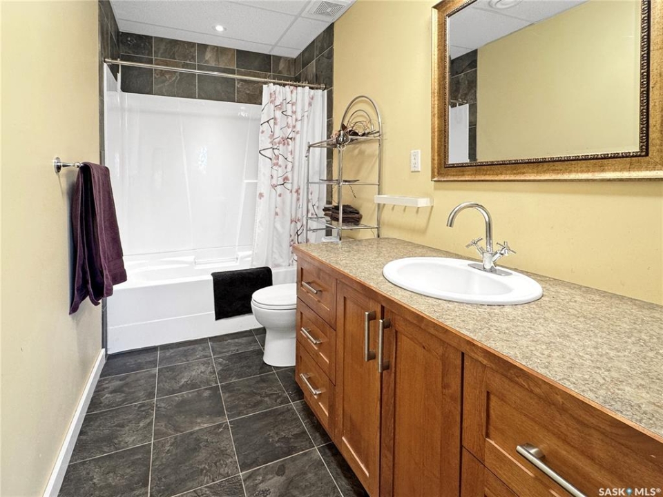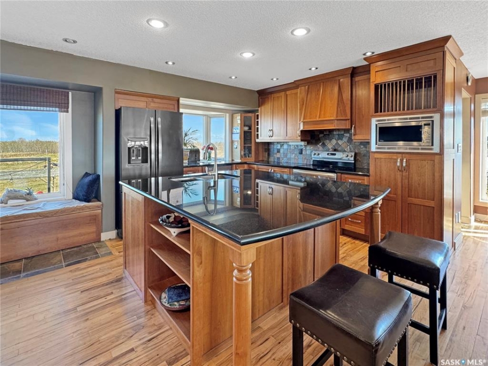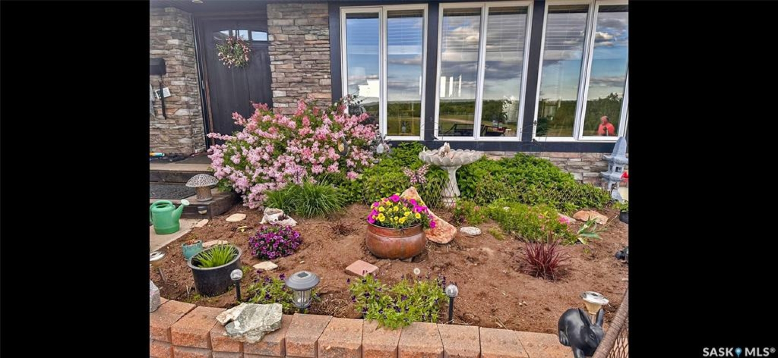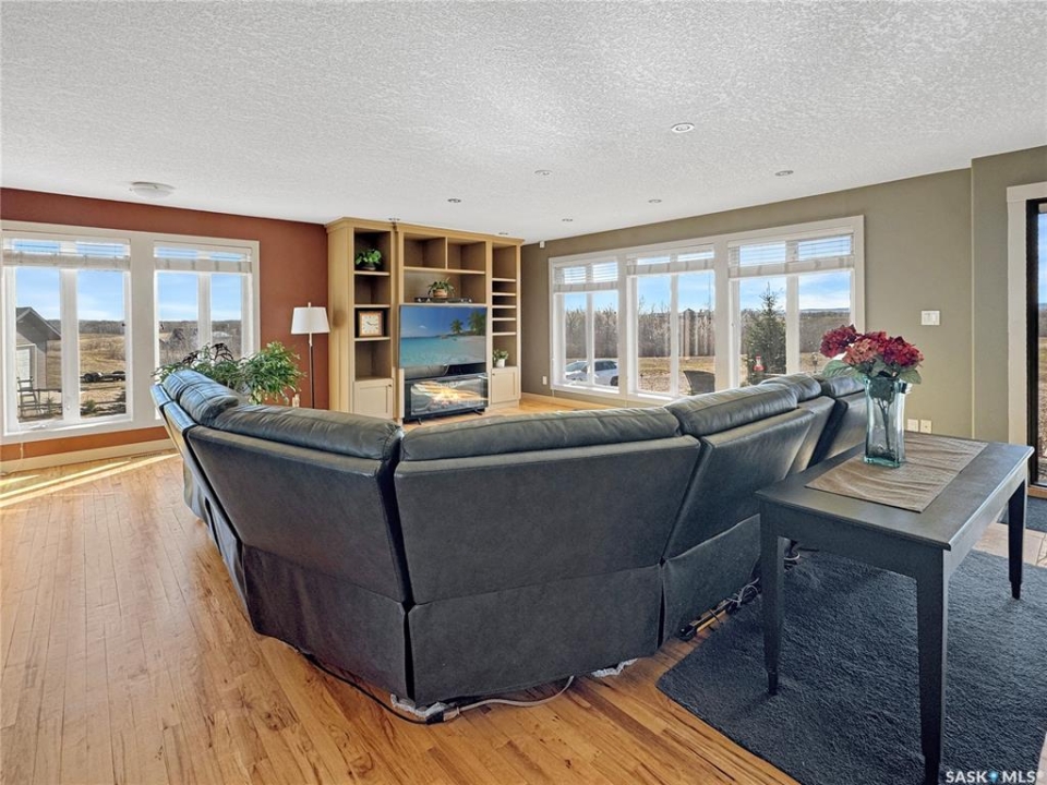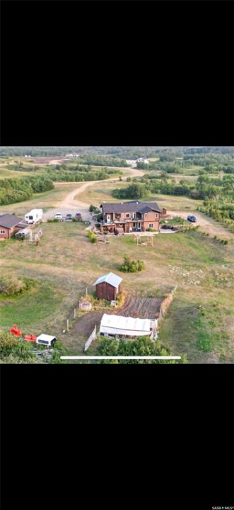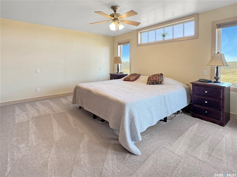 Discover your own piece of paradise just 5 minutes from Battleford with this stunning 4-bedroom, 4-bathroom acreage, situated on 12.5 acres of countryside. This thoughtfully designed home offers modern comforts, incredible views, and endless space—inside and out—including a fully equipped basement suite with its own kitchen and laundry, ideal for extended family or rental potential. Step into a spacious foyer accented by custom tile flooring, leading into an open-concept living space filled with natural light. The living room features custom built-ins surrounding the entertainment area. The beautifully designed kitchen boasts custom cabinetry, sleek quartz countertops, and a large island with a built-in sink—providing space for effortless meal prep, casual dining, or entertaining at the island seating. The adjoining dining area offers direct access to a large deck—perfect for morning coffee or hosting gatherings while overlooking the backyard. The main floor includes three generous bedrooms, a dedicated office, and a stylish 4-piece family bathroom with slate tile flooring. The primary suite is a true retreat, featuring custom closet cabinetry, a 3-piece ensuite with a beautifully tiled shower, and private deck access. The fully developed walkout basement offers a spacious rec room, an additional 4-piece bathroom, convenient access to your hot tub, and a self-contained suite for guests, family, or rental income. This home is built for year-round comfort with in-floor heating, central air conditioning, and a durable ICF foundation for energy efficiency and peace of mind. Additional highlights include a double attached garage, a large shop for extra storage or projects, and plenty of room to enjoy acreage living at its finest. If you're looking for privacy, space, and modern living just minutes from town—this property delivers it all. Call today to arrange your private viewing and experience the lifestyle this acreage has to offer!