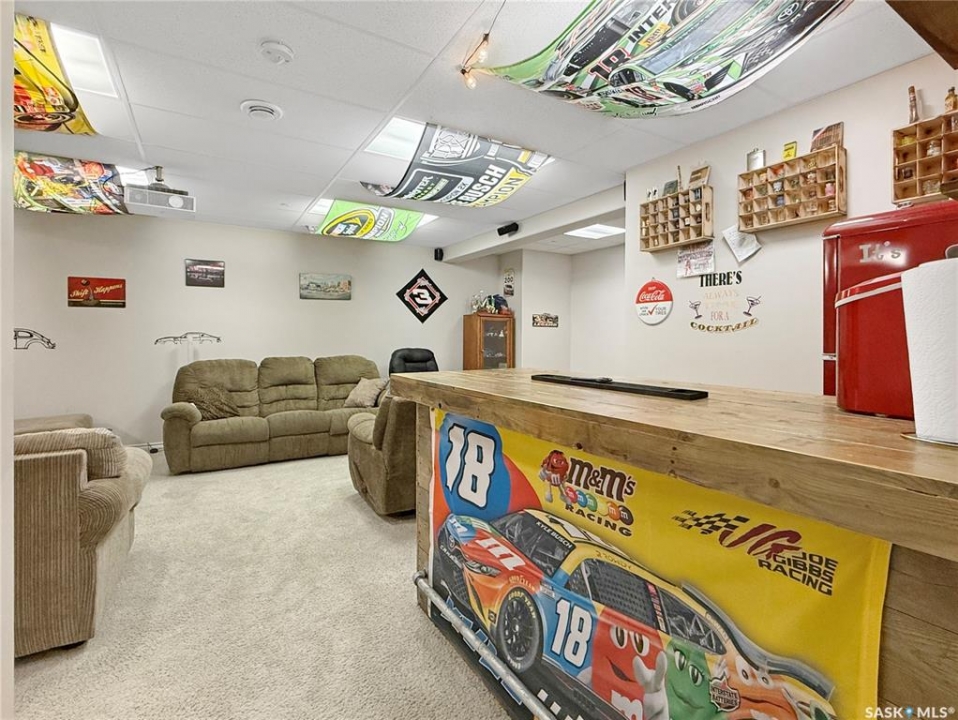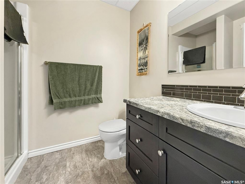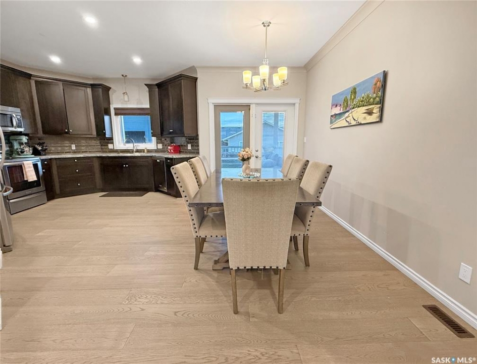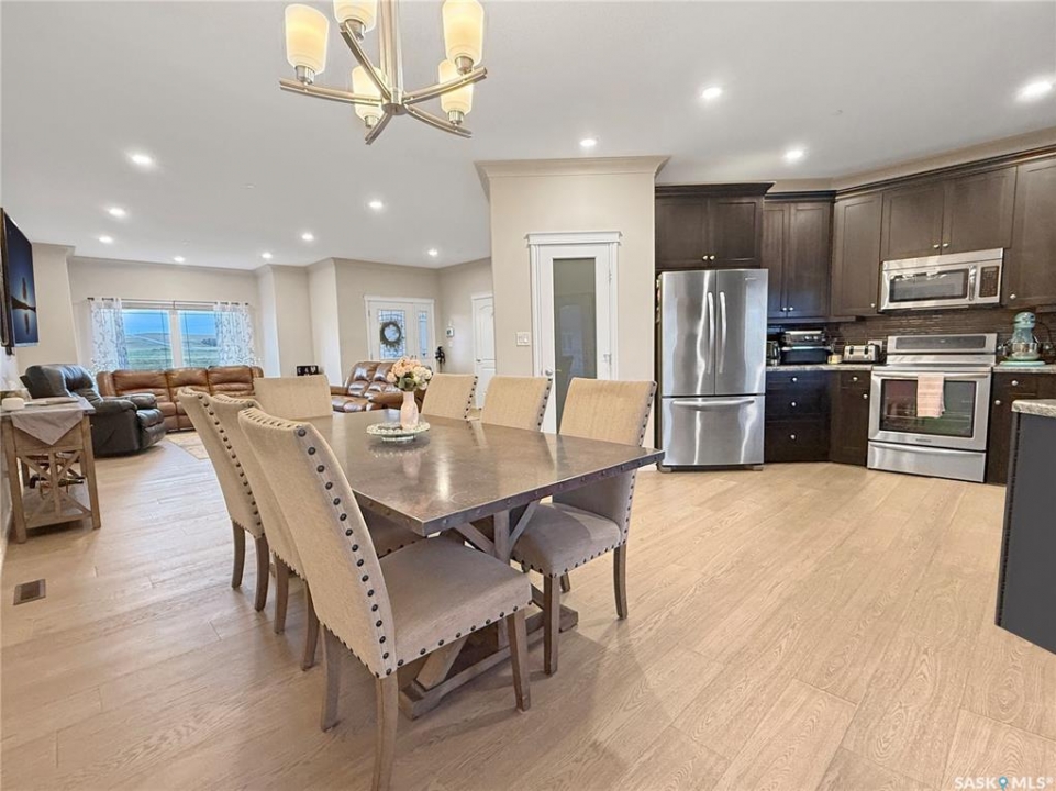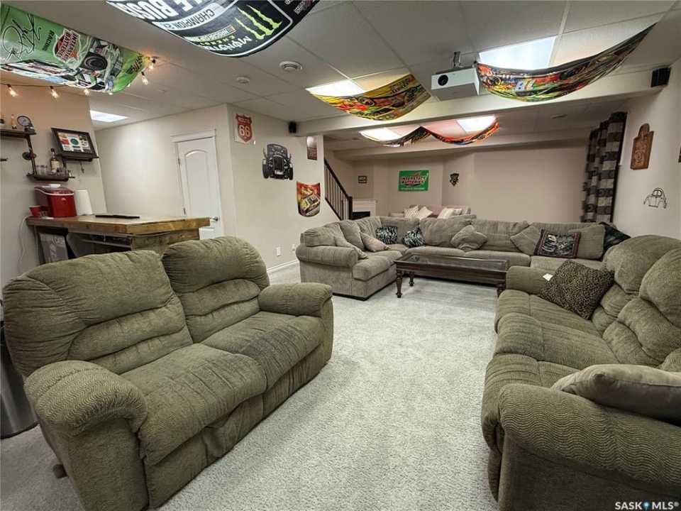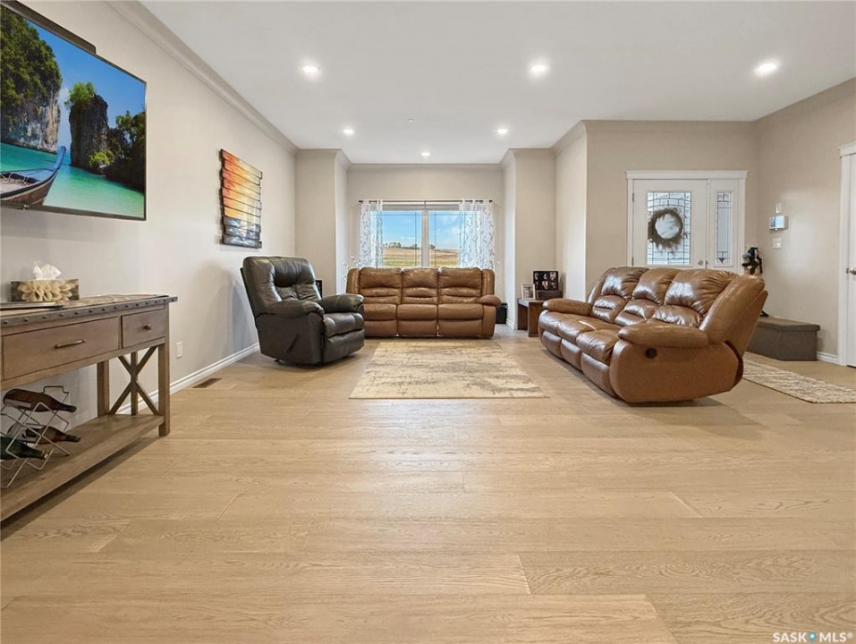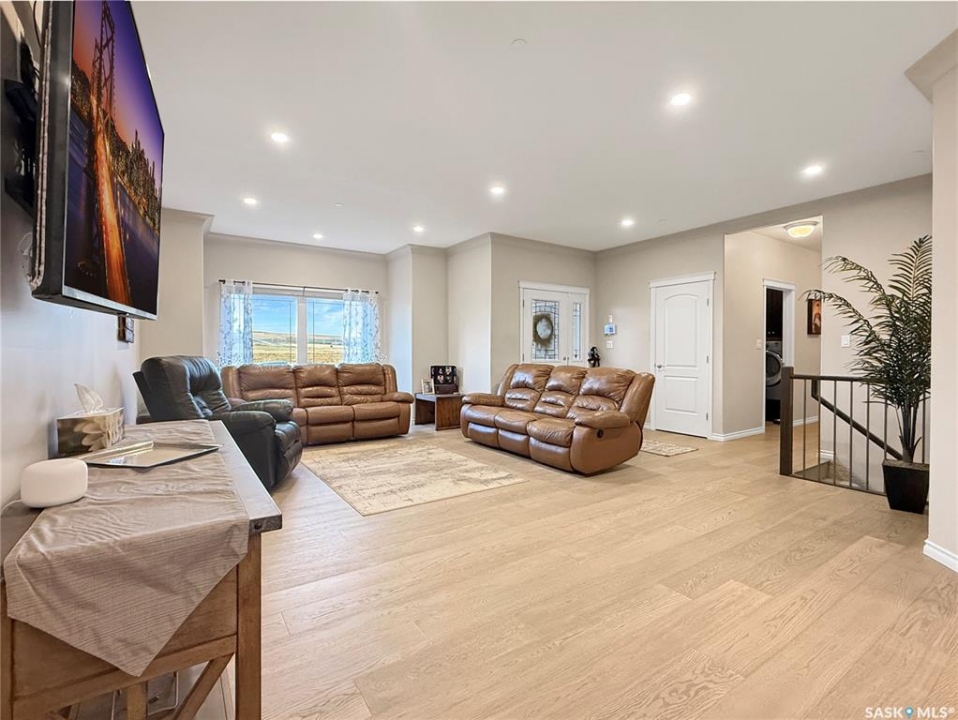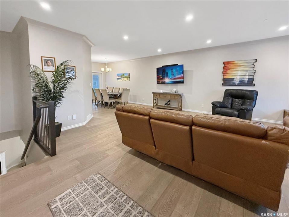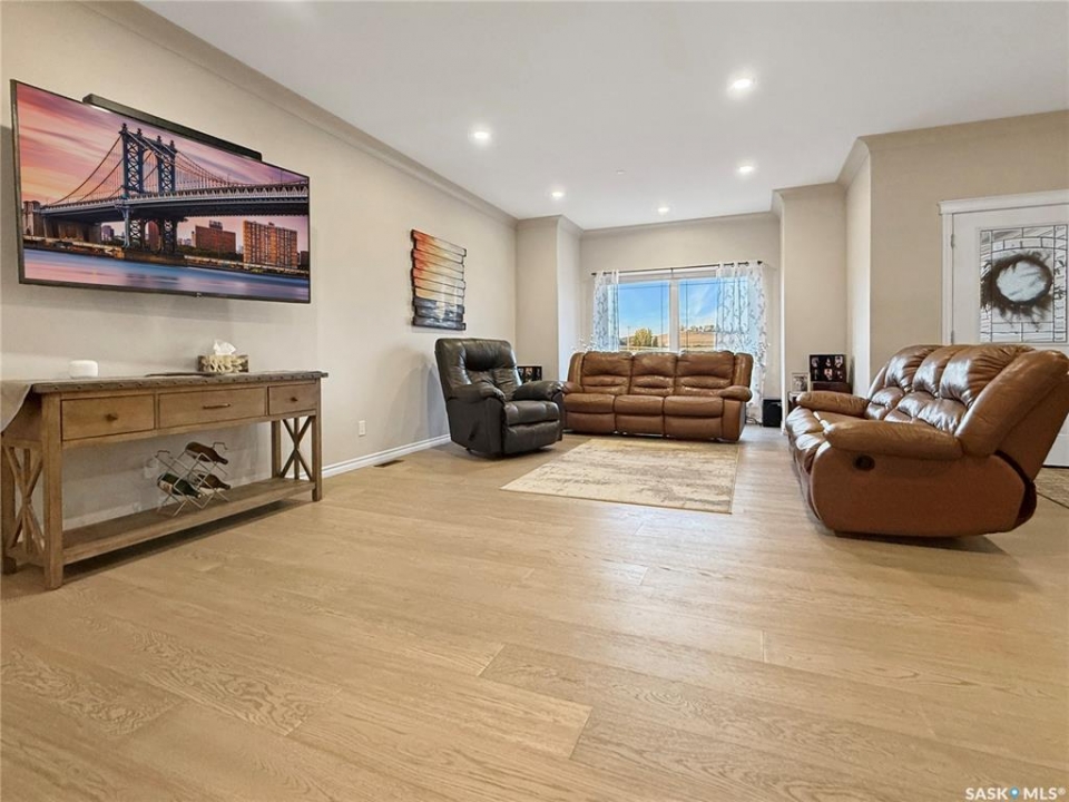 Discover this spacious family home, boasting modern construction in a prime location. Offering over 1,515 square feet, this expansive bungalow provides ample room for comfort and relaxation. Upon entering, you're greeted by a generous front living room, bathed in natural light thanks to its open-concept design. The living room seamlessly flows into a dining area and a well-appointed kitchen, featuring rich cabinetry, a glass tile backsplash, stainless steel appliances, and a sizeable walk-in pantry. The dining room opens onto a large covered deck equipped with a natural gas BBQ hookup. Step down to a patio with a pergola, surrounded by a fenced yard with a shed, underground sprinklers, and well-established sod. The main floor comprises a cohesive four-piece bathroom and three bedrooms, including a primary suite with its own walk-in closet and three-piece bathroom. Additionally, access to the heated, insulated 24 x 25 double car garage is available through the main floor laundry room. The expansive basement features a large family room, currently divided into a Rec area and a cozy projector screen space with a bar, ideal for entertaining. This level also includes two sizeable bedrooms, a third bathroom, a dedicated storage room, under-stair storage, and a 2015 mechanical room equipped with an air exchanger, water softener, central vacuum system, 200 amp panel, energy-efficient furnace, and a 2022 water heater. Additional highlights include front and back irrigation systems on timers, new engineered hardwood flooring on the main level, updated window coverings, tasteful crown molding, pot lights and freshly landscaped front and back yards. Situated in the vibrant Sask Valley area, this home is conveniently located near new schools, a hospital, a mall, and numerous other amenities. Call today for more information.