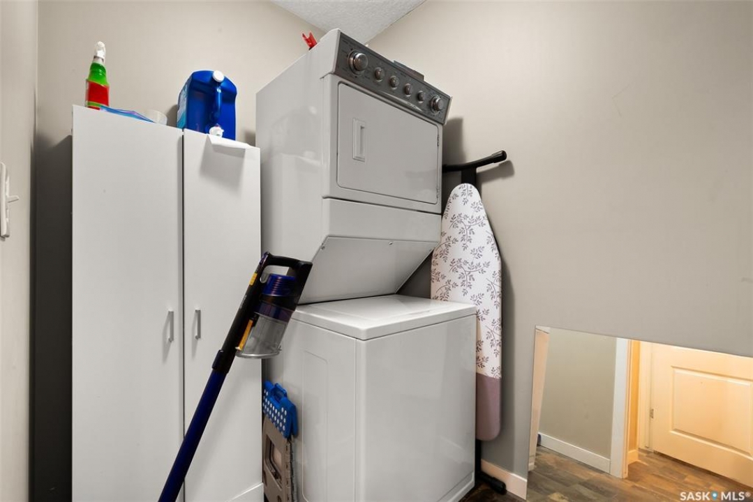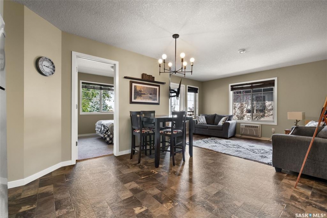 Located in the sought-after Lakeridge Addition! This well-maintained upper-level condo offers 2 bedrooms, 1 bathroom! Bright, functional living space – perfect for first-time buyers, downsizers, or investors. Step into an open-concept layout featuring a spacious living room with large windows overlooking open green space – no rear neighbours! The kitchen offers rich cabinetry. Vinyl flooring runs throughout the main areas. The 4-piece bathroom is clean and modern, and the unit includes in-suite laundry and a utility/storage room for added convenience. Enjoy your morning coffee or sunset views from the covered balcony just off the living room. This unit comes with one electrified parking stall (stall #60) located conveniently nearby, plus visitor parking. Included are all appliances (fridge, stove, dishwasher, microwave hood fan, washer & dryer), window coverings, and a window A/C unit. Located in a quiet, well-kept complex, you're just minutes from Regina's north-end amenities – grocery stores, restaurants, schools, parks, and transit. Condo fees are a low $189.50/month and cover exterior maintenance, lawn care, snow removal, and more. Affordable, stylish, and move-in ready – this condo has it all. Don't miss your chance to own in one of Regina's most desirable areas. Contact your REALTOR � today to schedule a private showing!