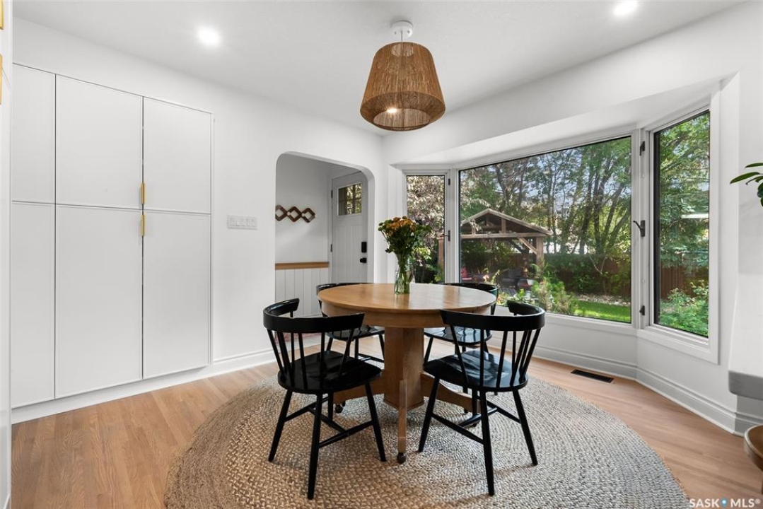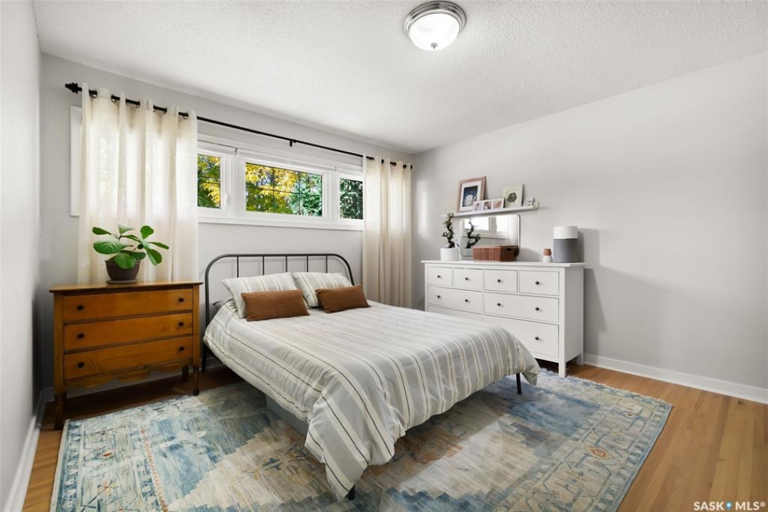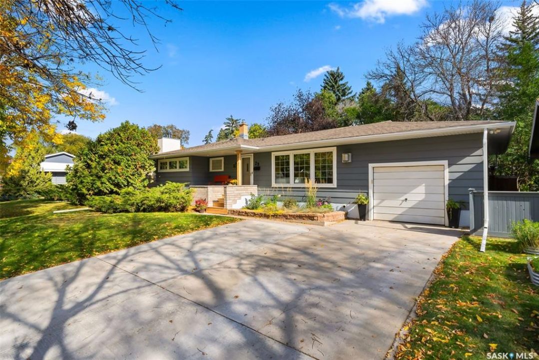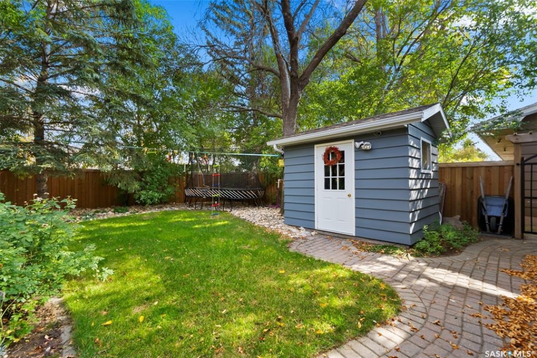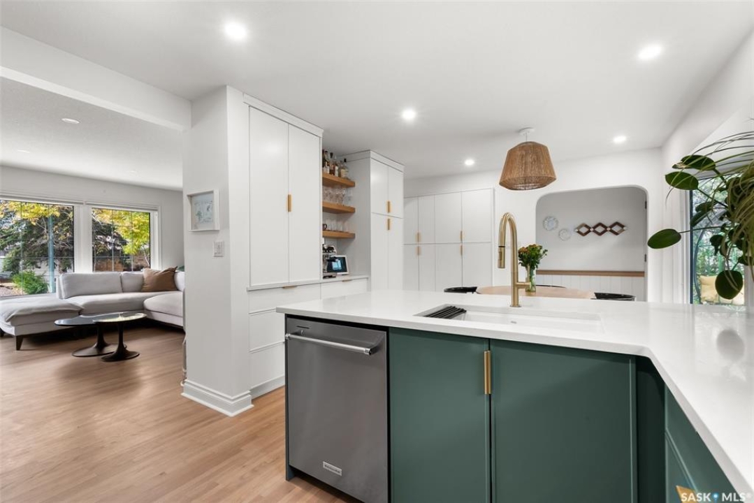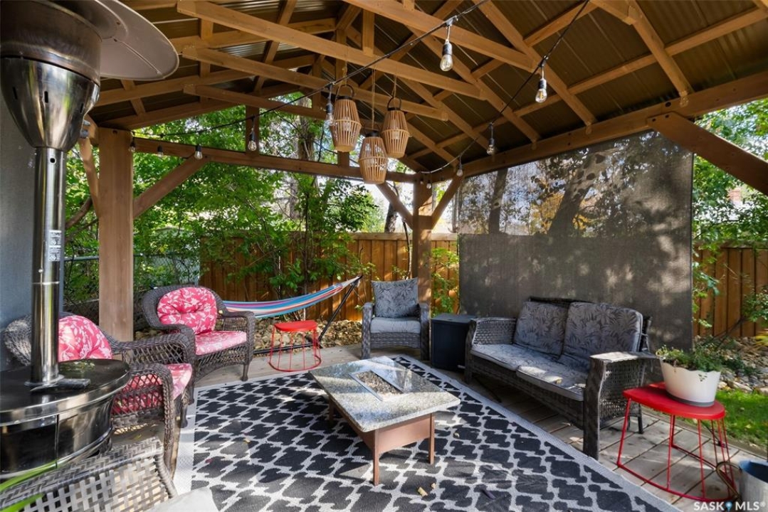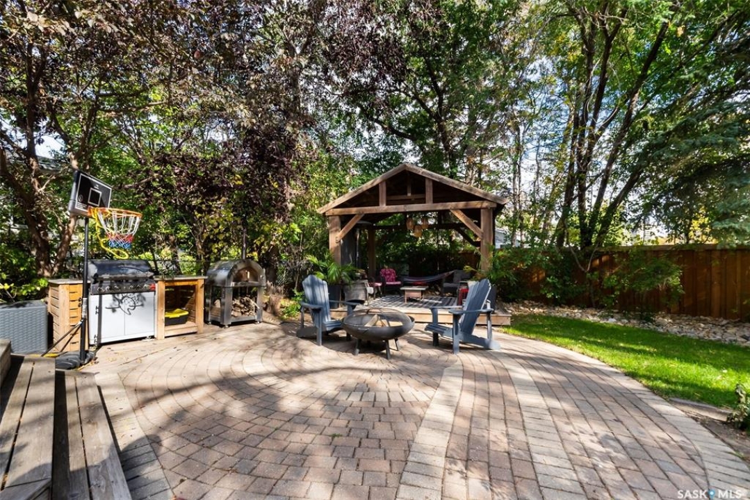 Welcome to this beautifully updated 1,196 sq ft bungalow tucked away on the highly desired Calder Crescent, just steps from schools, shopping, and all the conveniences Hillsdale has to offer. The main floor features three bedrooms and a stylishly renovated 4-piece bathroom. The heart of the home is the modern kitchen, designed with sophistication and function in mind—complete with quartz countertops, a sleek tile backsplash, smart built-in storage solutions, and an eat-up peninsula. The adjacent dining area is perfect for family meals or entertaining guests. A cozy living room with a unique gas fireplace complete this floor. Downstairs, the bright and inviting basement offers even more living space with another gas fireplace, wet bar, durable laminate flooring, a 3-piece bathroom, and a 4th bedroom with a custom built-in wardrobe—perfect for guests or teens. Step outside to your own backyard oasis. Mature trees frame a private setting featuring a custom gazebo and expansive deck, a built-in cook station with gas BBQ and quartz prep counter, along with a good size storage shed and underground sprinklers. The front yard is equally impressive, with lush perennial beds and underground irrigation for both the lawn and garden or enjoy the newly finished front patio offering Tyndall stone and cedar steps. Other updates to this home include: vinyl windows, newer shingles, newer high efficient furnace, radon mitigation system and 220 service electrical panel with plenty of room still future expansion. Complete with a single attached garage with more cabinets for storage, this home combines comfort, style, and functionality in one of Regina's most sought-after neighbourhoods. Don't miss your opportunity to own this stunning Hillsdale gem!