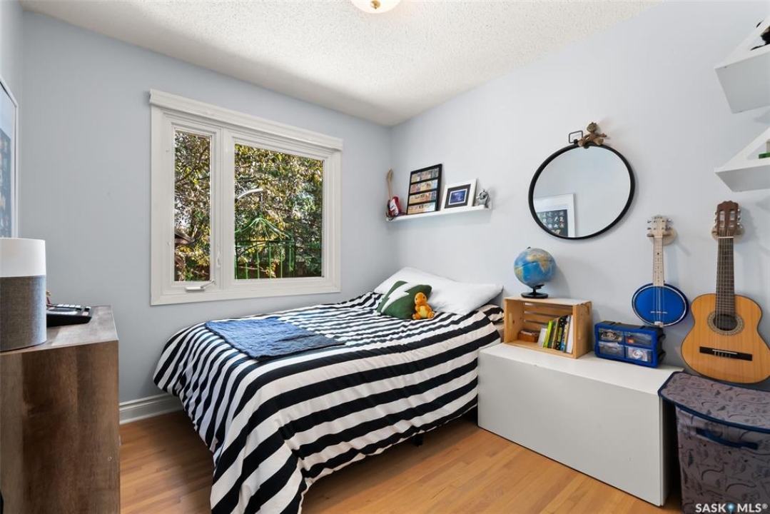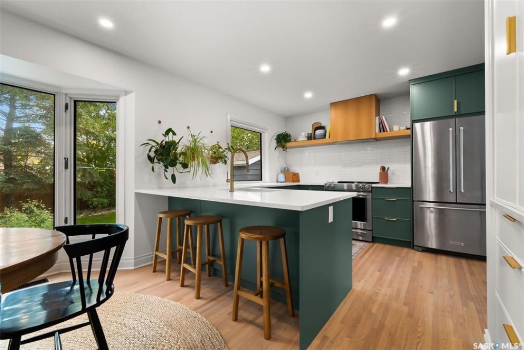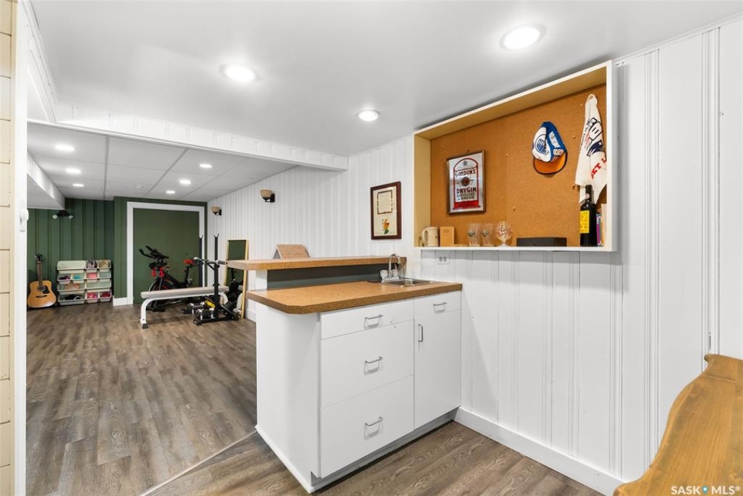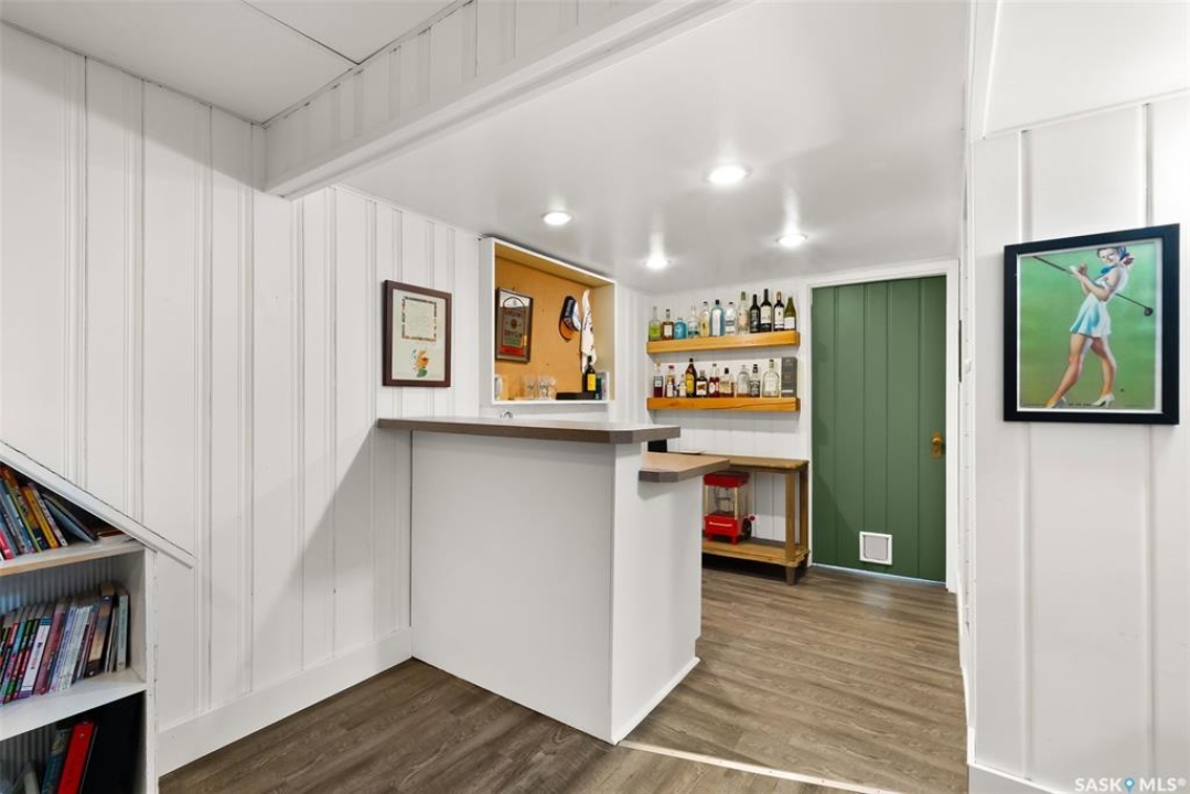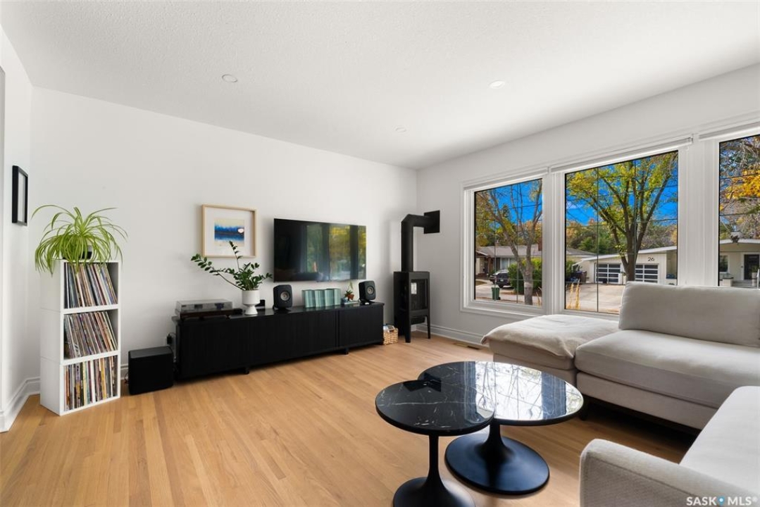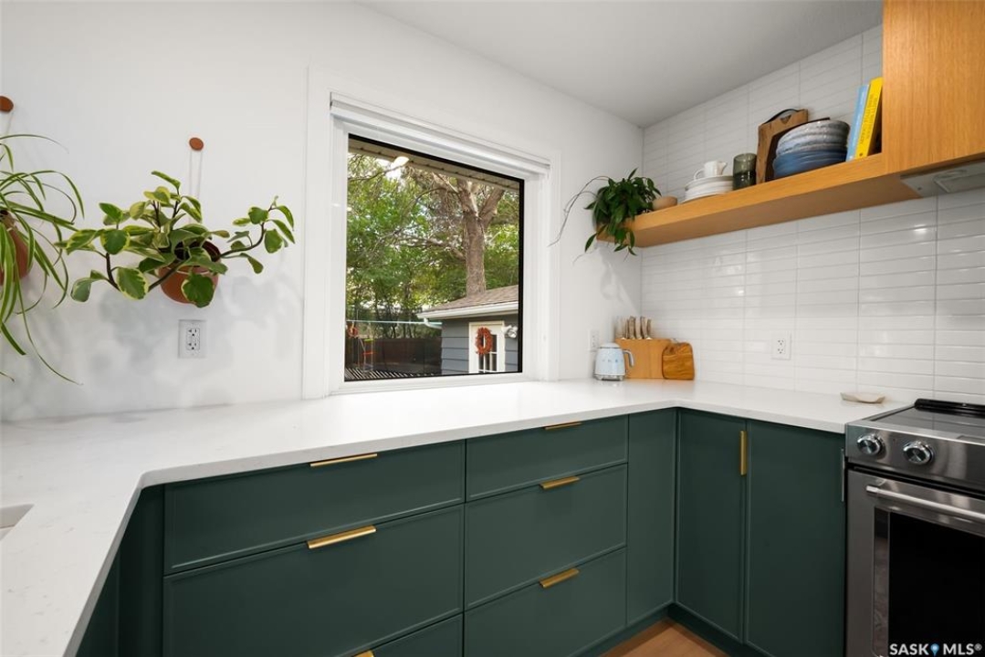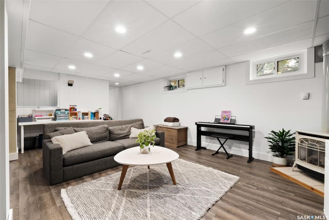 Welcome to this beautifully updated 1,196 sq ft bungalow tucked away on the highly desired Calder Crescent, just steps from schools, shopping, and all the conveniences Hillsdale has to offer. The main floor features three bedrooms and a stylishly renovated 4-piece bathroom. The heart of the home is the modern kitchen, designed with sophistication and function in mind—complete with quartz countertops, a sleek tile backsplash, smart built-in storage solutions, and an eat-up peninsula. The adjacent dining area is perfect for family meals or entertaining guests. A cozy living room with a unique gas fireplace complete this floor. Downstairs, the bright and inviting basement offers even more living space with another gas fireplace, wet bar, durable laminate flooring, a 3-piece bathroom, and a 4th bedroom with a custom built-in wardrobe—perfect for guests or teens. Step outside to your own backyard oasis. Mature trees frame a private setting featuring a custom gazebo and expansive deck, a built-in cook station with gas BBQ and quartz prep counter, along with a good size storage shed and underground sprinklers. The front yard is equally impressive, with lush perennial beds and underground irrigation for both the lawn and garden or enjoy the newly finished front patio offering Tyndall stone and cedar steps. Other updates to this home include: vinyl windows, newer shingles, newer high efficient furnace, radon mitigation system and 220 service electrical panel with plenty of room still future expansion. Complete with a single attached garage with more cabinets for storage, this home combines comfort, style, and functionality in one of Regina's most sought-after neighbourhoods. Don't miss your opportunity to own this stunning Hillsdale gem!