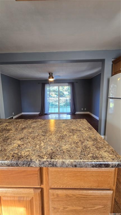 Quaint home on corner lot in fantastic location. This three bedroom home is situated on a mature lot within walking distance of the k-12 school, the swimming pool, and right across from the rink and the Lions playground. The entry point is a large mudroom that has a 2025 window and 2025 metal roof that has lots of space for your every day items. The kitchen has been modernized and opens up to the spacious living room with garden doors to the deck and backyard. The four piece bathroom was renovated in 2022 and along with the two bedrooms completes the main floor. The second floor is one area that can be used as a third bedroom or another family area. The basement has been partially finished to include a fourth bedroom and another recreational room. The yard is amazing with lots of mature trees, a deck that wraps from the front porch to the back garden doors, a detached garage complete with wood stove and extra storage space, and a great garden area. Priced to sell!