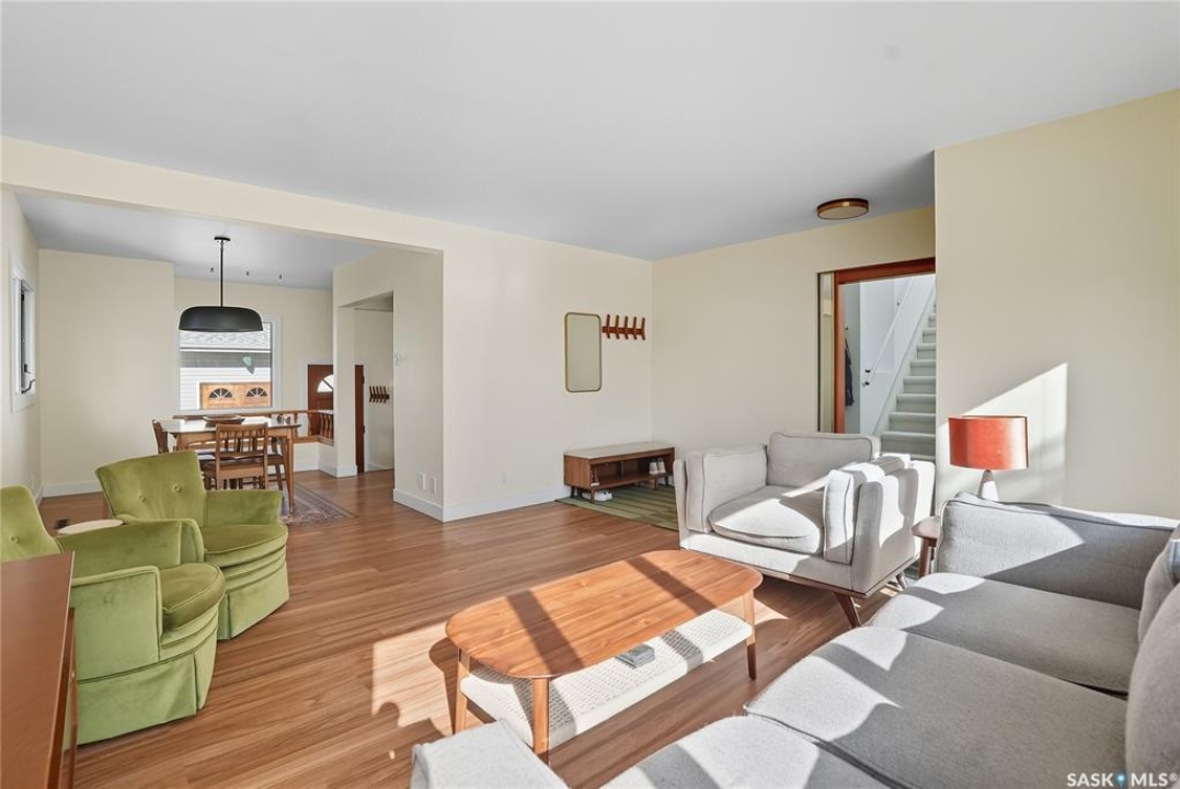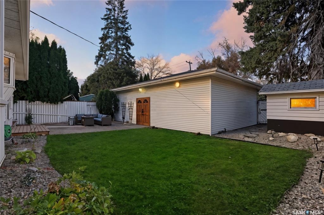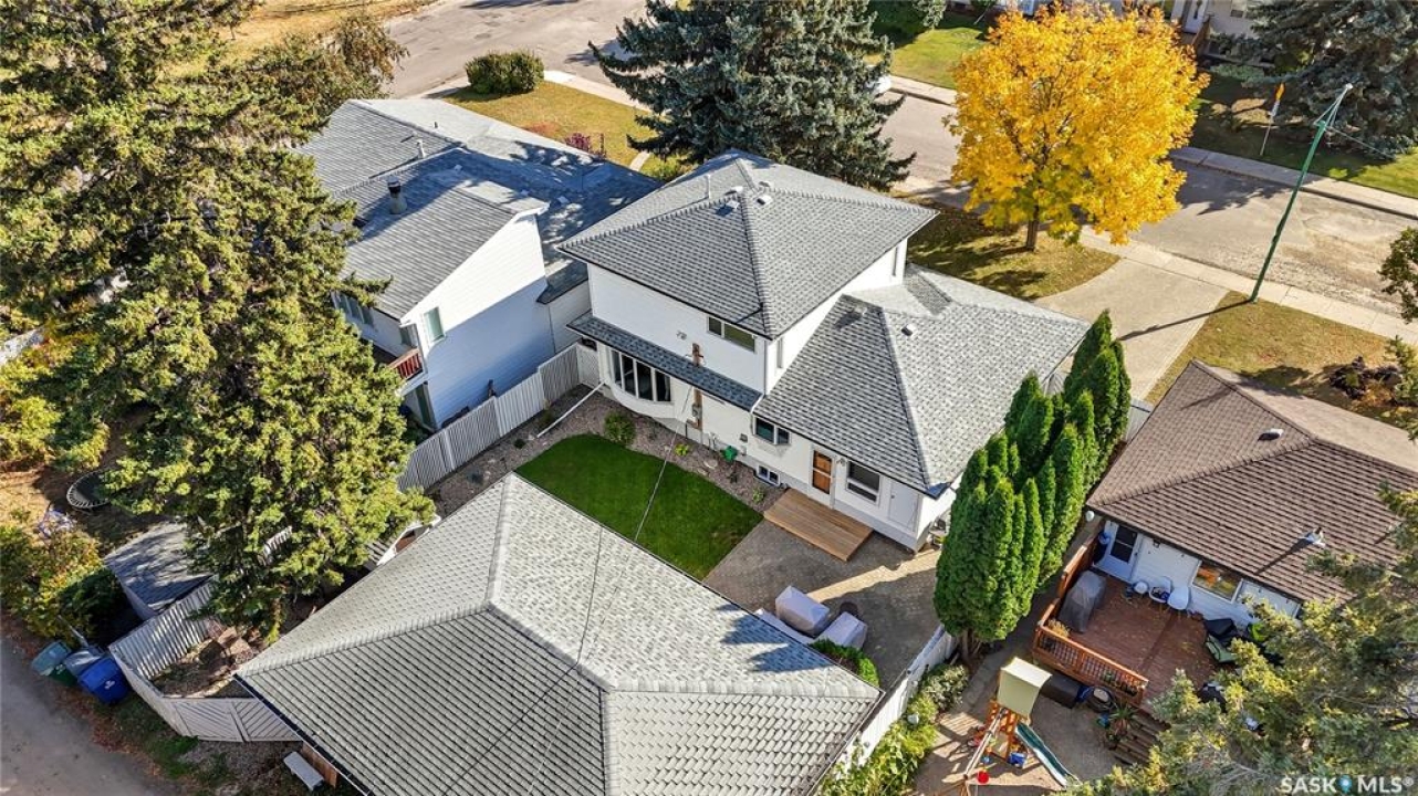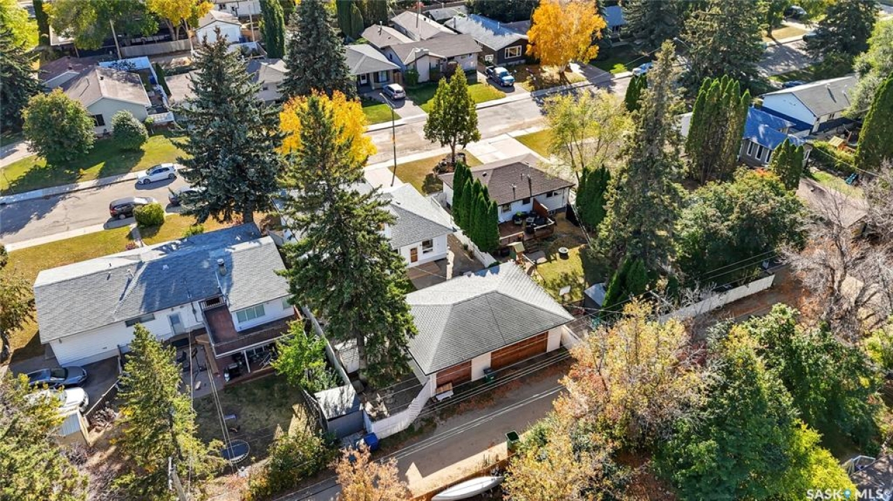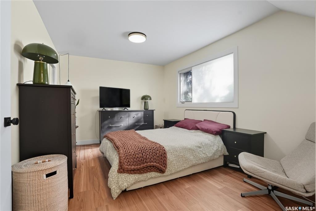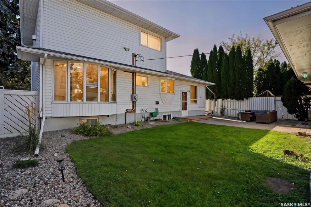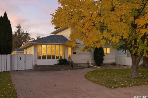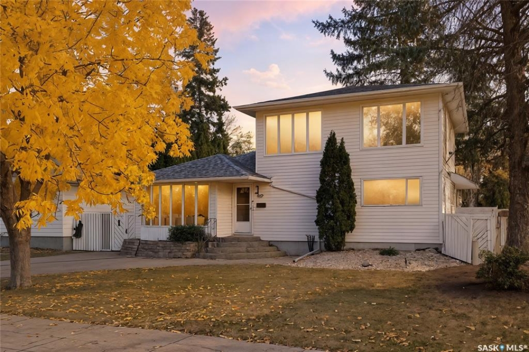 Welcome to 433 Elm Street, a 1,772 sq ft two storey home in the heart of Queen Elizabeth. Built in 1955 and thoughtfully updated, this 4 bedroom, 2 bathroom property combines classic charm with modern comfort. The main floor features bright vinyl plank flooring across the living room, dining area, and kitchen. The kitchen offers generous workspace and storage, and the 5 piece main bath adds a clean, contemporary touch. Two bedrooms on the main level provide flexibility for guests, family, or office use. The upper level is an open living area with incredible natural light and ample space for a studio, home office, or relaxing family room. The full basement includes a large family room, an additional bedroom, a 3 piece bath, a den, and a laundry area. Notable upgrades include new eaves on the house and garage, new basement windows, an upgraded electrical panel and service entry, new washer, dryer, furnace, and water heater in 2024, as well as new shingles on the lower portion of the home in 2025. Additional highlights include two gas fireplaces, central air conditioning, underground sprinklers, and a private fenced yard with mature trees. The triple detached garage features one partitioned stall that is partially heated and insulated, along with a single front drive and total parking for four vehicles. Set on a 55 by 110 foot lot, this property offers a perfect mix of space, updates, and location within one of Saskatoon's most established neighbourhoods.