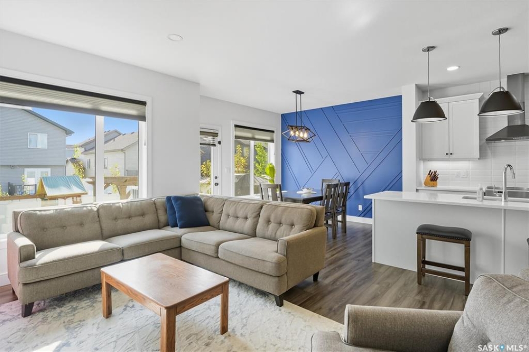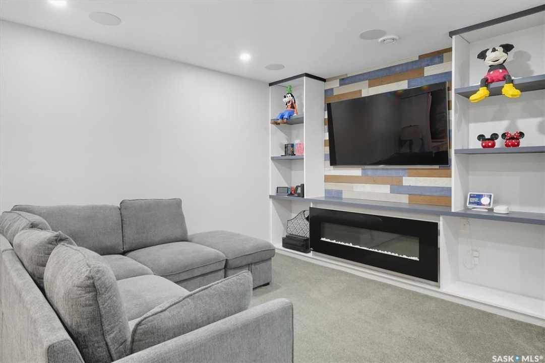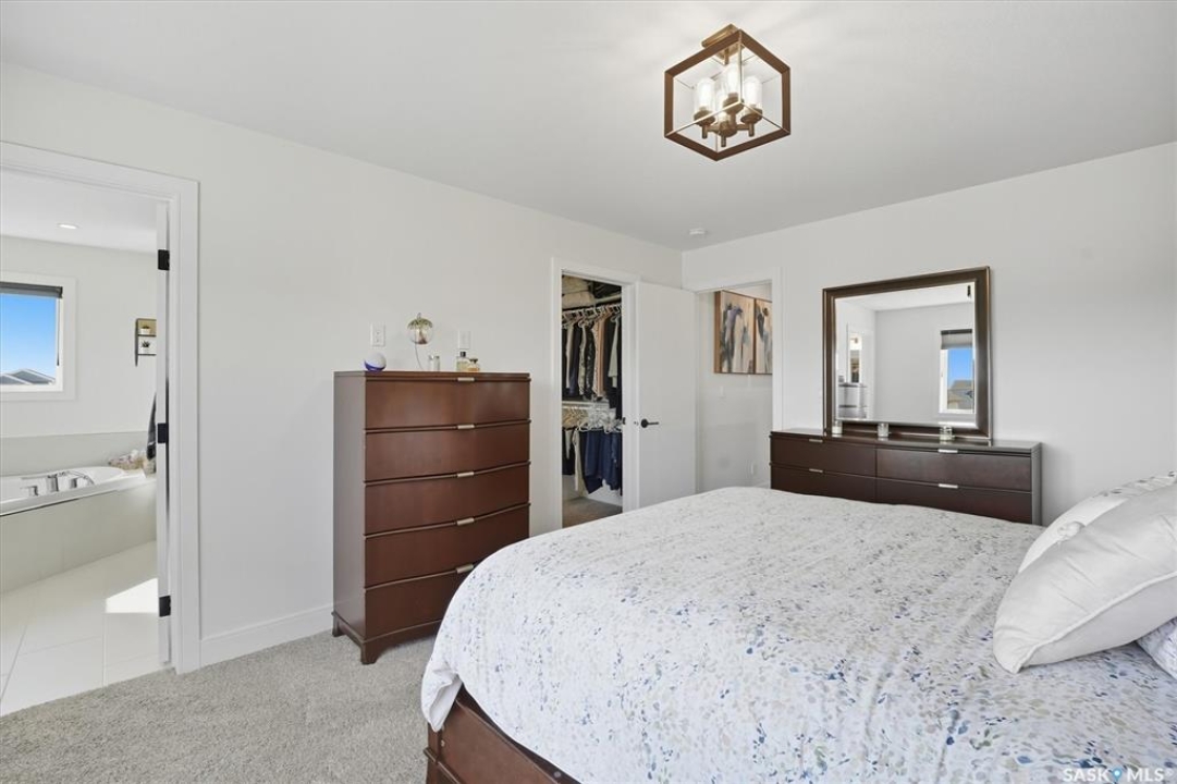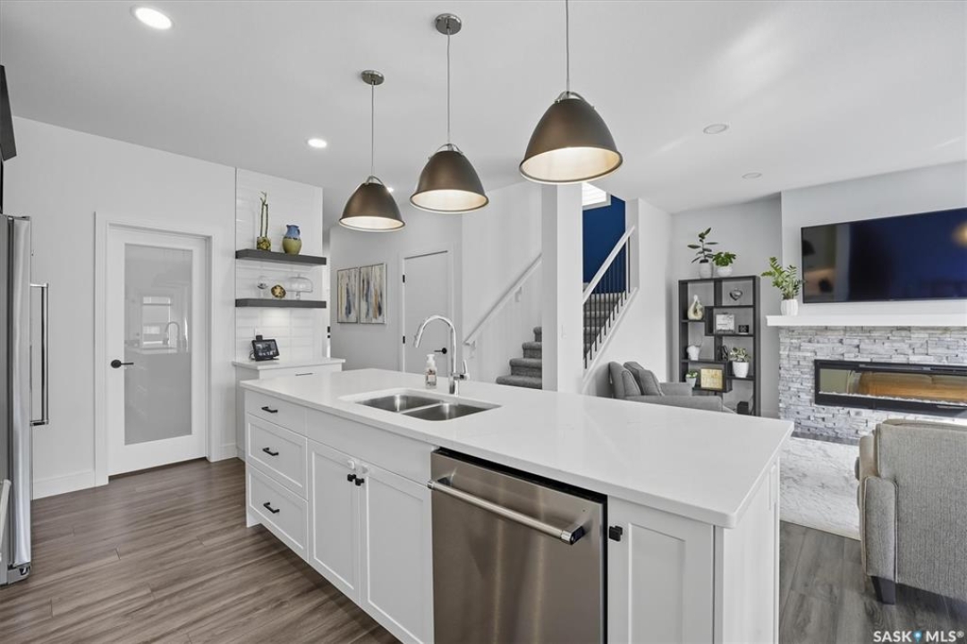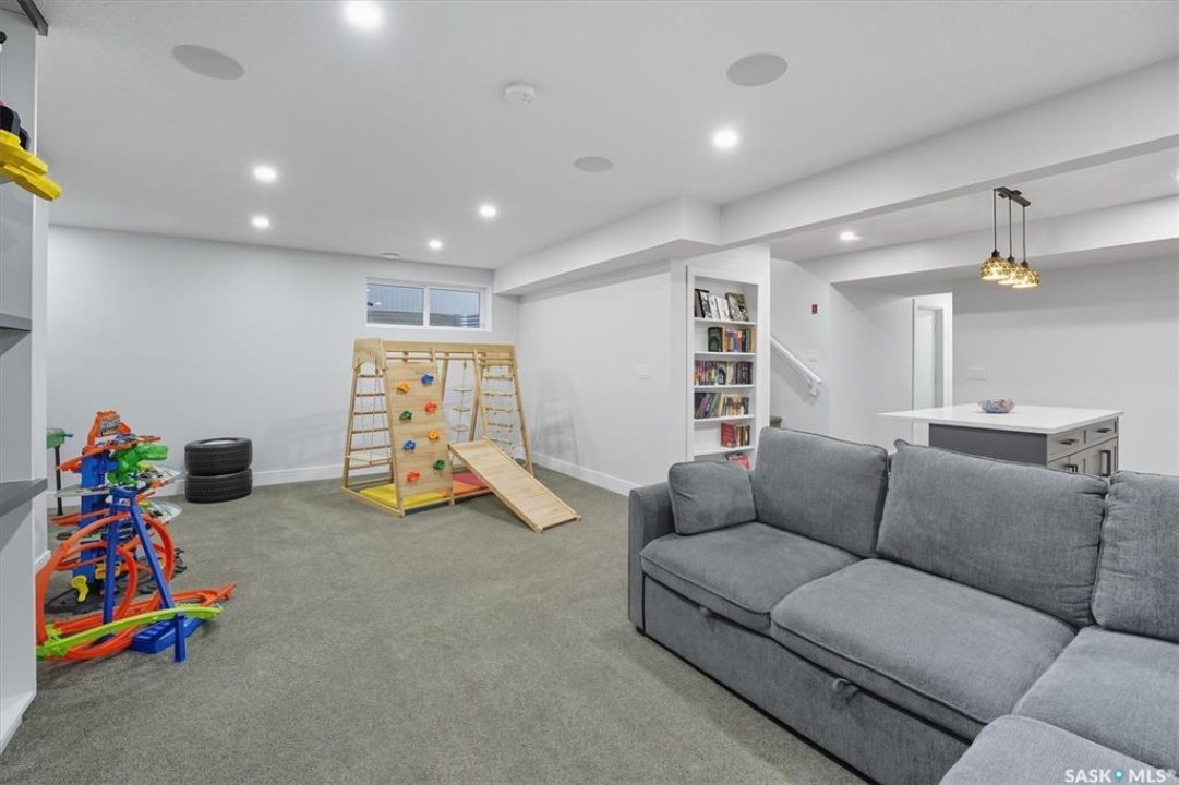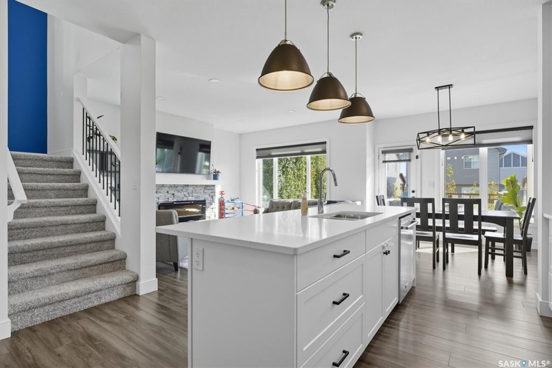 Welcome to this stunning home in the heart of Brighton, offering style, comfort, and thoughtful details throughout. Step inside to a spacious front entry with a large front closet, a handy two-piece bath, and direct access to the heated garage. From the entryway, you'll find a sliding door to the walk-through pantry with tons of storage and counterspace, leading to a beautiful yet highly functional kitchen with quartz countertops, shaker-style cabinetry with modern black hardware, stainless steel appliances including a convection oven with induction cooktop, and a large island with double undermount sink, seating and statement pendant lighting. The kitchen opens to a bright, cozy living room with a fireplace and mantle, and a spacious dining area with a stunning feature wall, large windows and direct access to the deck for easy outdoor entertaining. There is an office/flex space down the hall. Upstairs, you'll find 4 bedrooms, a large bonus room, a laundry room with extra storage, and a shared 4pc bath. The primary suite features a gorgeous feature wall, large windows, an impressive ensuite with dual sinks, corner tub, glass-door shower, toilet closet, and a generous walk-in closet. A second upstairs bedroom also includes a walk-in closet as well. The basement is made for entertaining with a striking wet bar featuring quartz counters, two-tone cabinetry, live-edge floating shelves with custom lighting, a hidden pull-out wine rack, and secret storage behind a bookcase. Enjoy movie nights in the family room with in-ceiling surround sound and a cozy fireplace. There is a 5th bedroom and another full bath down the hall. Outside, the yard is fully landscaped with fruit trees and shrubs, a patio with pergola, sandbox area, underground sprinklers with drip irrigation, and a custom pathway around the home. This home truly blends beauty, function, and location—walking distance to Brighton's many amenities and easy commutes in and out of the area.