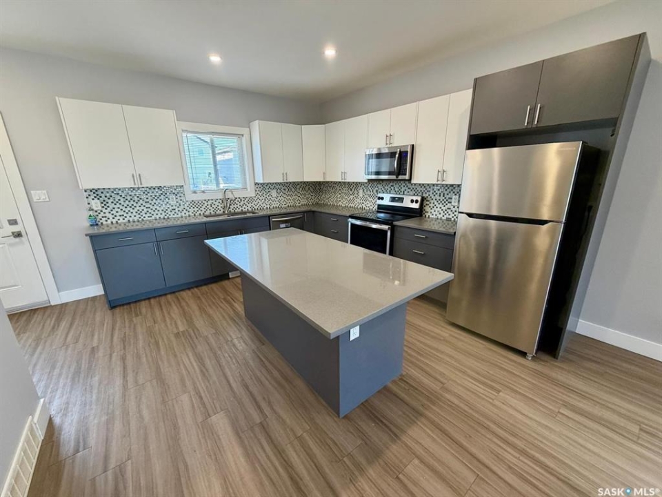 Welcome to 3218 Green Brook Road in The Towns, a beautifully finished 2-storey home with a fully developed regulation basement suite offering excellent income potential. Built in 2021, this 1,640 sq. ft. home is thoughtfully designed with modern finishes, functional space, and family-friendly appeal. The main floor features an open-concept layout with luxury vinyl plank flooring, a spacious living room with large front windows, and a bright dining area that flows seamlessly to the backyard. The kitchen is equipped with quartz countertops, stainless steel appliances, tile backsplash, and a generous island with seating—perfect for everyday living and entertaining. A convenient 2-pc bathroom completes this level. Upstairs, the primary suite includes a walk-in closet and 4-pc ensuite. Two additional bedrooms, a full bath, and a laundry room provide comfort and practicality for family life. The basement is a self-contained regulation suite with a separate entrance, making it ideal as a mortgage helper or extended family space. It features two bedrooms, a full kitchen with stainless steel appliances, a living room, and a 4-pc bath, all finished to the same high standard as the main home. Located in a growing east Regina community, close to schools, parks, and shopping, this home combines modern family living with the benefit of income-generating potential.