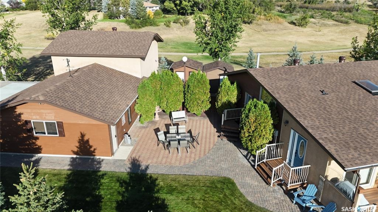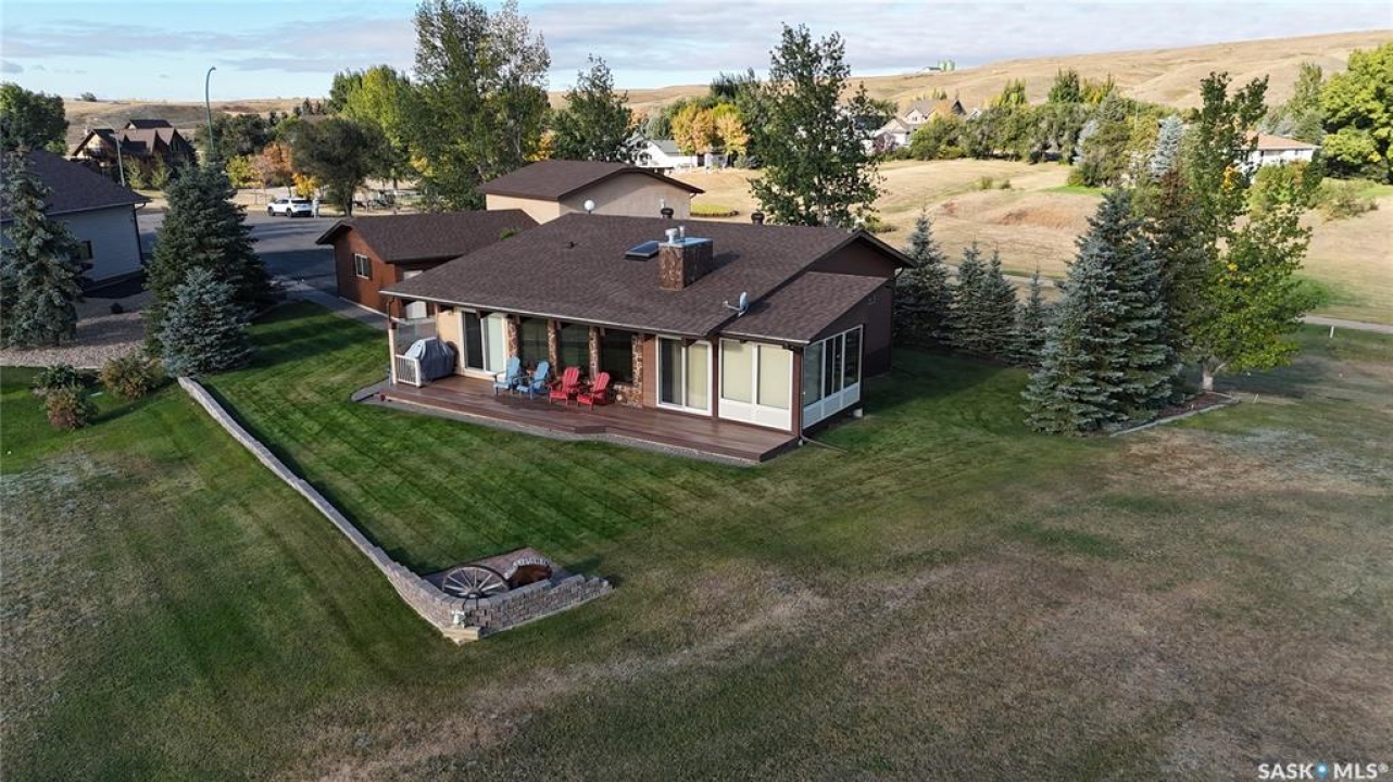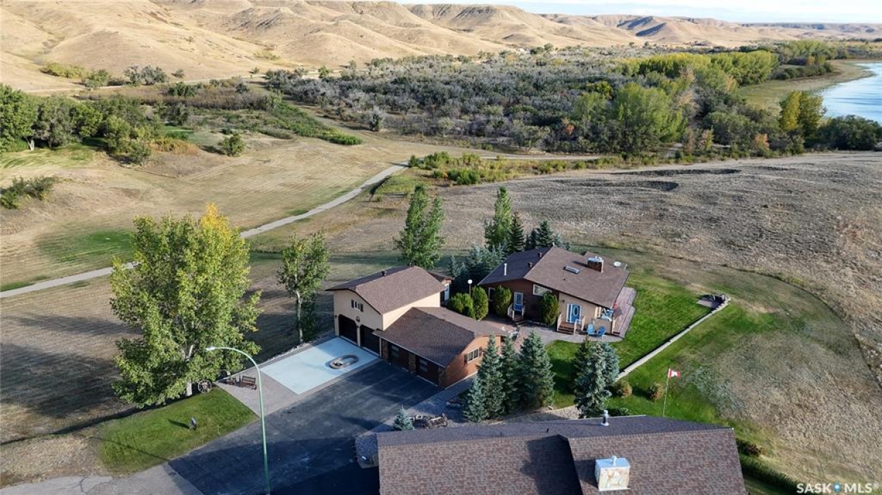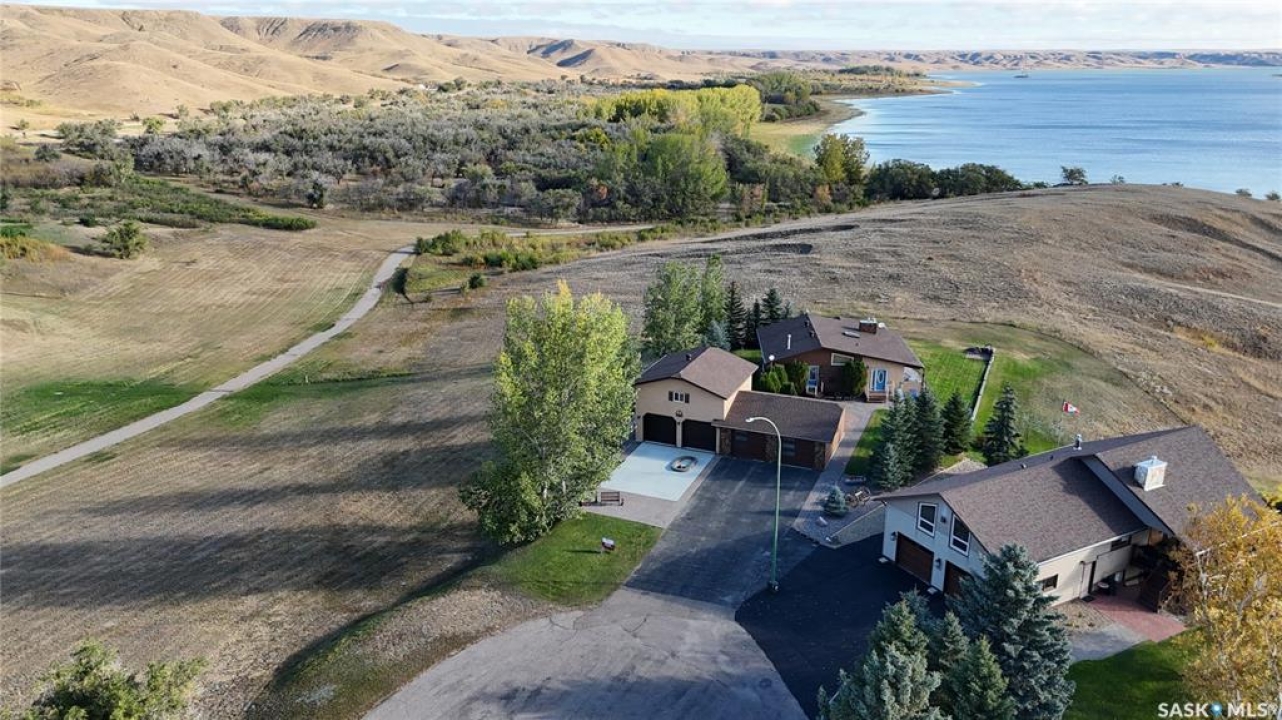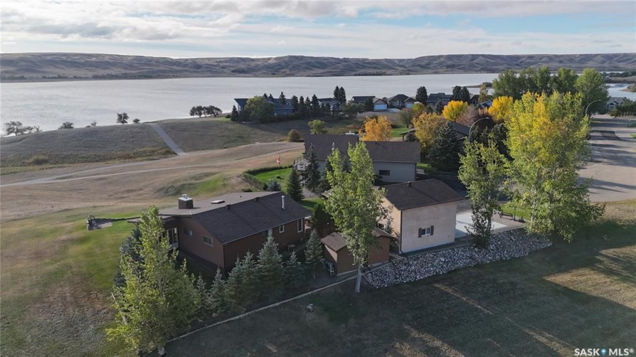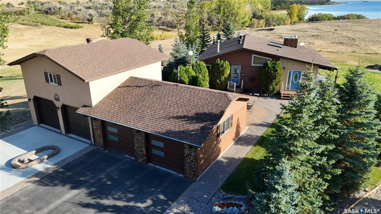 Private Lakeview Retreat – 70 Cactus Drive, Saskatchewan Landing. Tucked at the end of a quiet cul-de-sac in the welcoming community of Saskatchewan Landing, just 25 minutes north of Swift Current, this one-owner home offers a rare opportunity to own a thoughtfully designed lakeview retreat on an extra-large, private lot. Built in 1995, this 3-bedroom, 2-bathroom home was custom designed to maximize privacy and capture lake views from every window. The heart of the home is a stunning sunroom with floor-to-ceiling windows, a beautiful stone accent wall, and direct access to the lake-facing deck—perfect for relaxing or entertaining. Inside, you'll find a bright, open layout with cathedral ceilings in the living room, hardwood floors, a newly renovated kitchen with island, two natural gas fireplaces, central air conditioning, and premium Hunter Douglas blinds throughout. Outside, enjoy a tranquil courtyard with a dining area and fire pit, underground sprinklers, additional storage in garden sheds, and an incredible heated 4-car garage with a mezzanine—ideal for hobbyists or storing lake toys. You're just two minutes from the marina, 18 hole golf course with clubhouse, restaurant and moments away from some of the best fishing year round in Southwest Saskatchewan. This is lakeside living at its finest—comfort, quality, and natural beauty in every direction. For more information or to book your tour, call today!