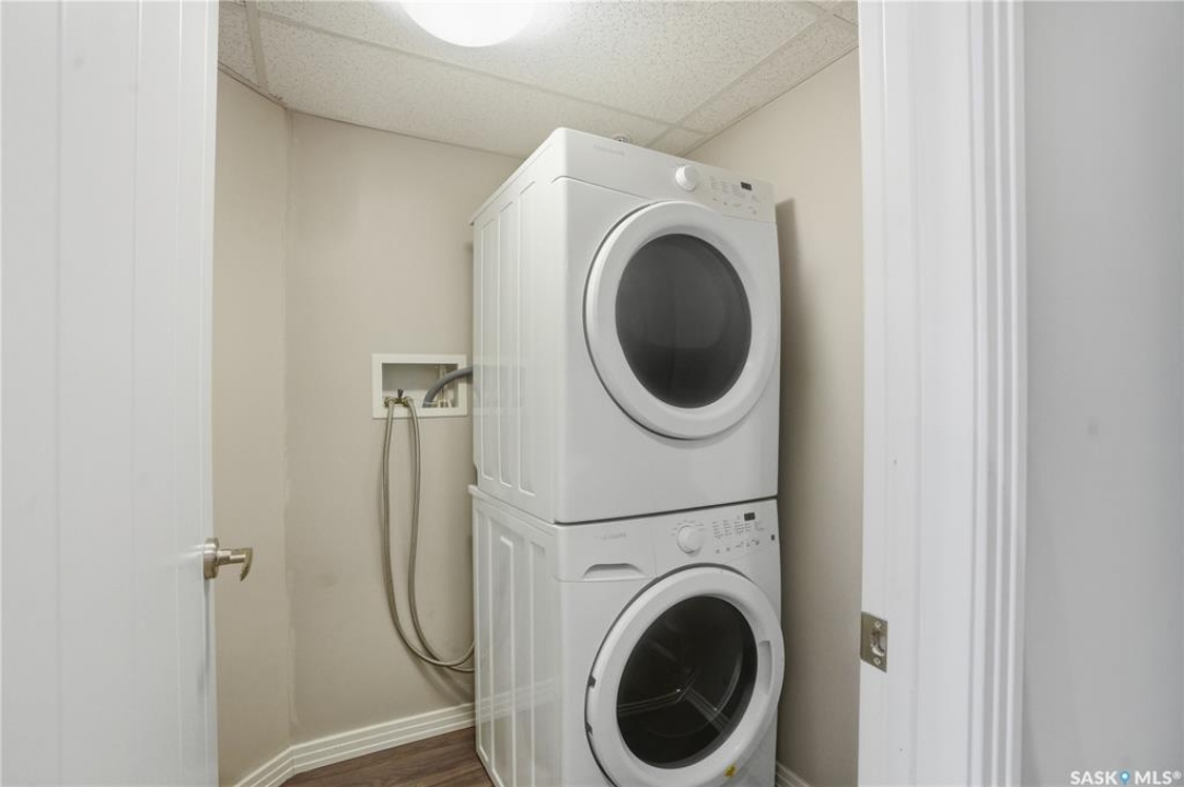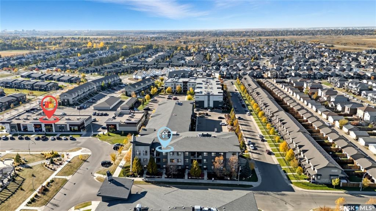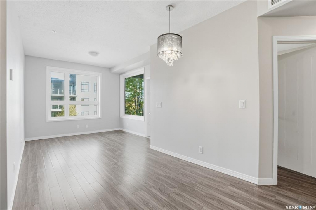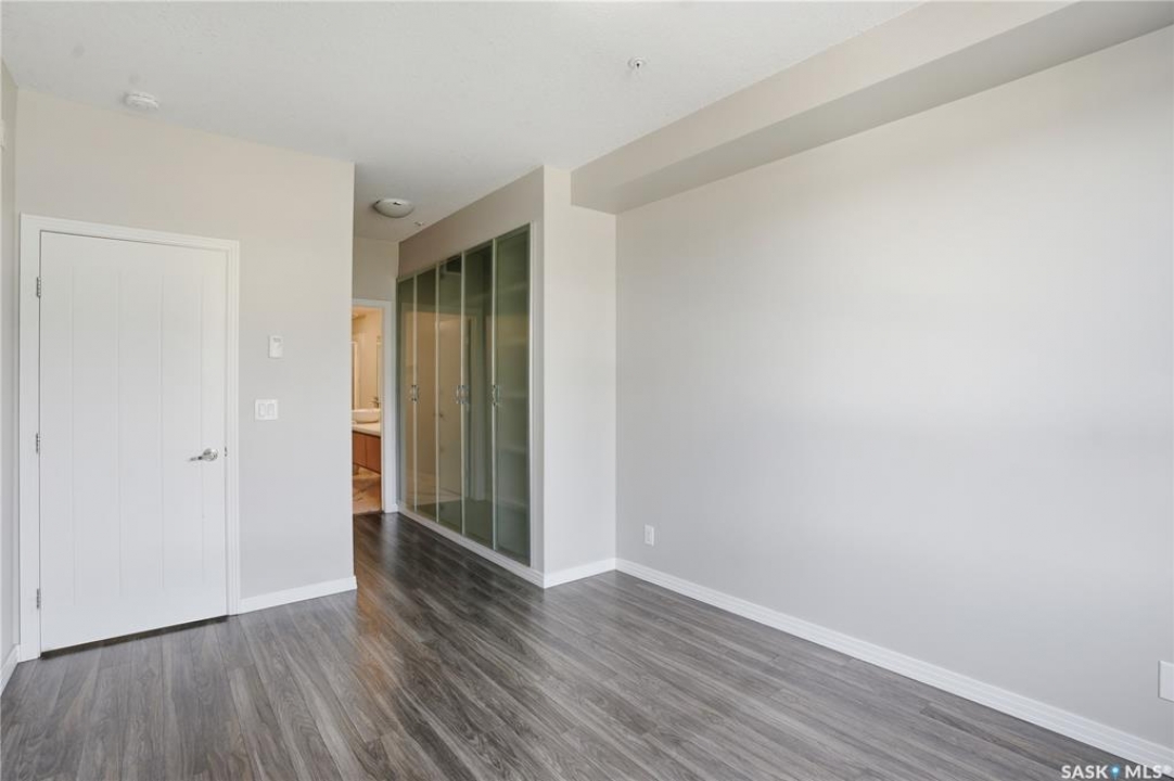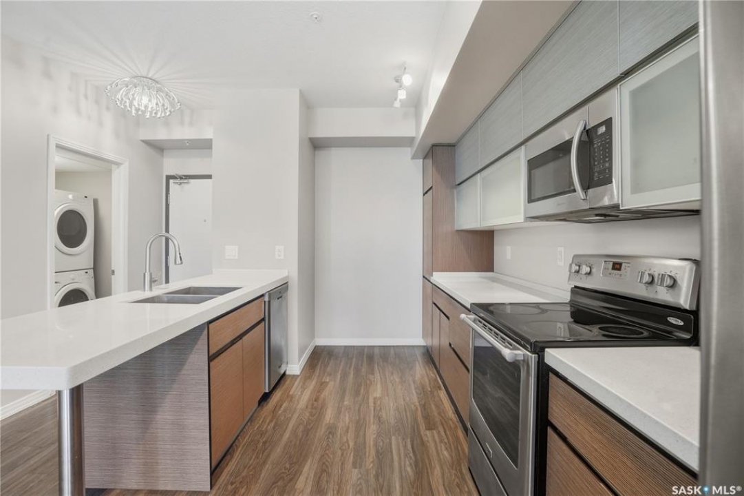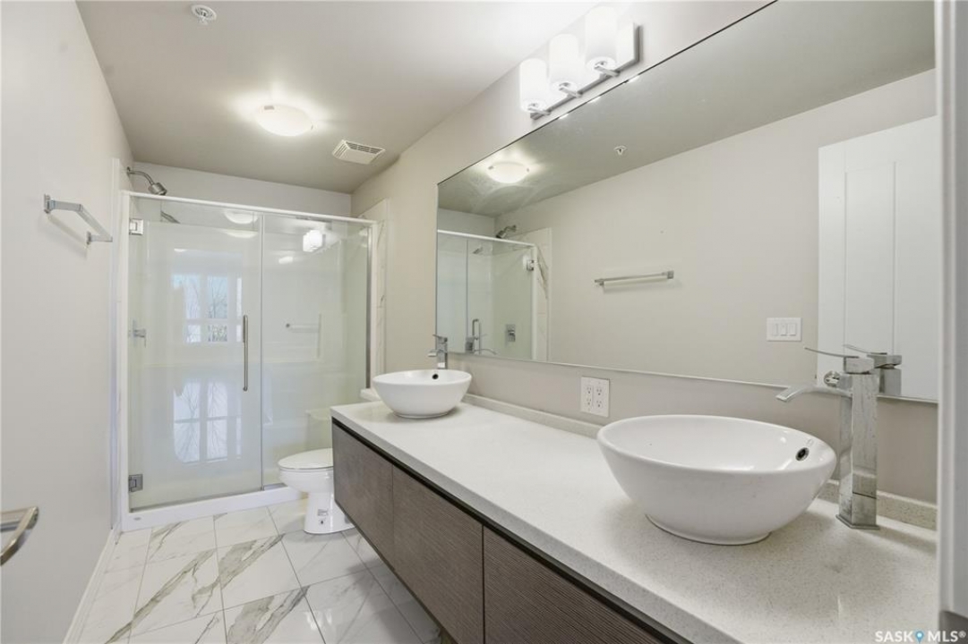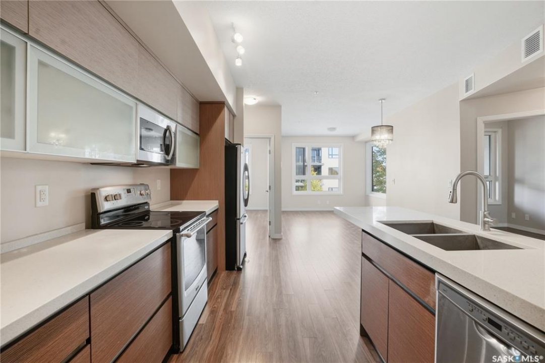 Excellent 2-bedroom, 2-bathroom east-facing condo with 2 parking spots (1 underground, 1 electrified surface-level) at Sequoia Rise, great location close to the Evergreen Square & bus routes to U of S. This trendy suite offers a functional layout with 9' ceilings, SoHo-style kitchen with quartz countertops and eating bar, ample living & dining space, in-suite laundry, split bedroom layout with generously-sized primary bedroom featuring walk-through closet to a beautifully-finished 4-piece ensuite with sit-down shower & dual sinks on a vastly-sized quartz-top vanity. A sheltered environment awaits you at the balcony, offering a relaxing space to soak up the sunrise with your morning coffee! Excellent climate control with in-floor zone heating (included in condo fees) & central air conditioning, providing gentle heating with the benefits of air handling. Building amenities include elevator access, intercom with cell phone compatibility, common exercise area & meeting room, visitor parking & mailboxes. Pet-friendly condo subject to restrictions. Whether you're looking to downsize, looking for economical living or buying your first home, this great condo should be on your list!
